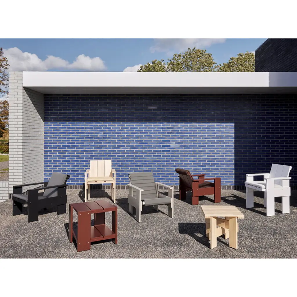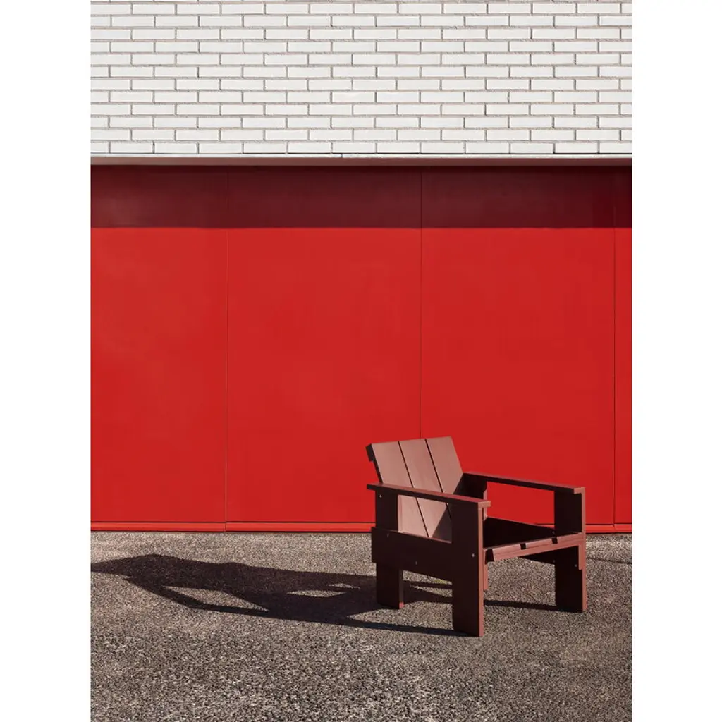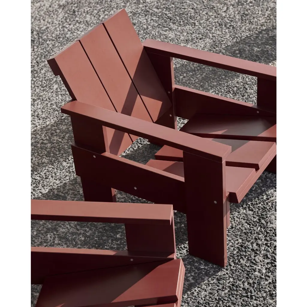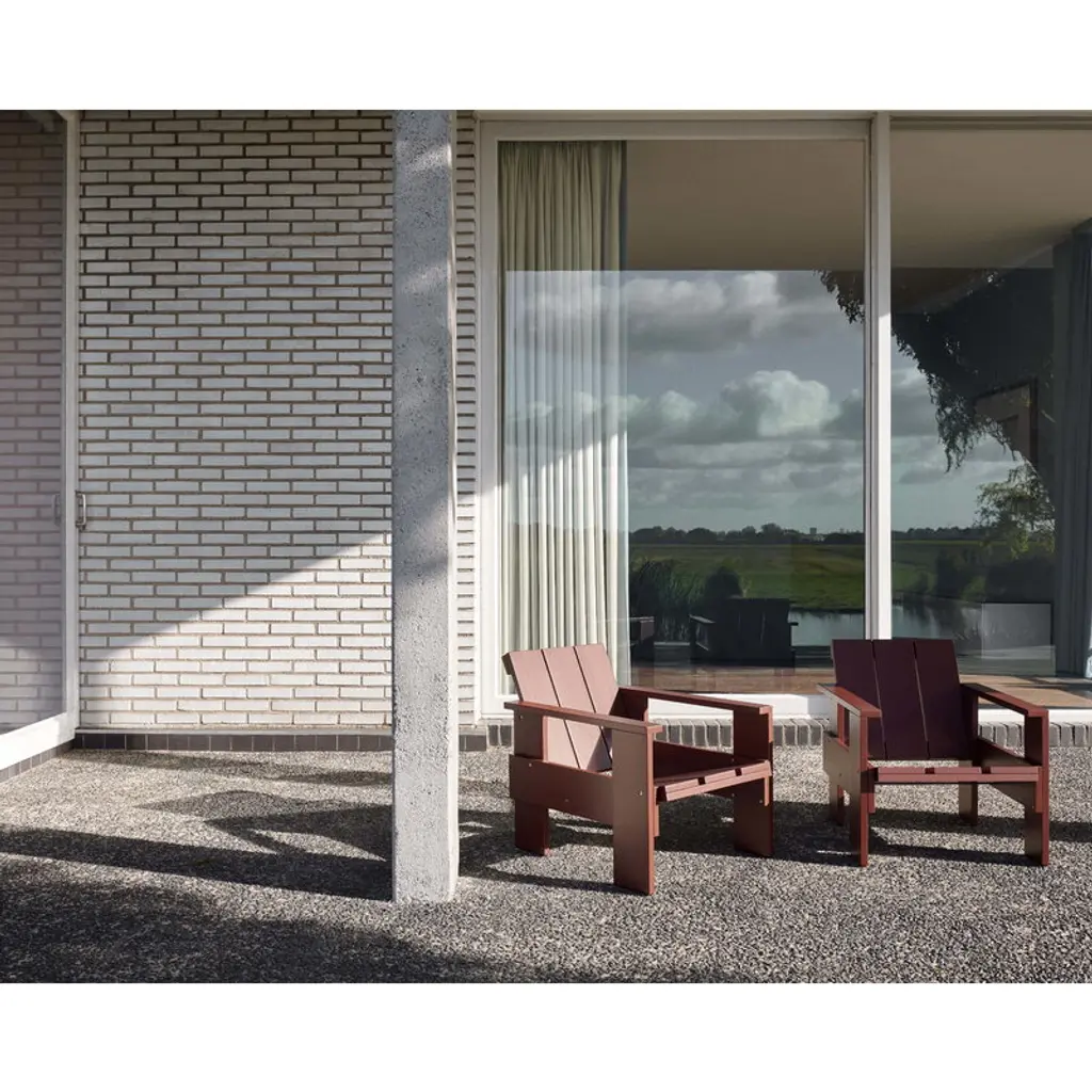 The Crate lounge chair is part of HAY’s collection of wooden outdoor furniture. The dining chair gets its sturdy character from clean and balanced lines. The deep seat and tilted backrest ensure not only a stylish appearance but also ultimate comfort, which can be even further improved with plush seat cushions, sold separately. The Crate terrace chair is based on the original chair designed by Dutch architect and designer Gerrit Thomas Rietveld in 1934. At that time, the chair was made from leftover wooden shipping crates, but the Rietveld Originals and HAY reinterpretation uses lacquered pine as the material. Finished with a weatherproof coating, the Crate lounge chair is ideal for outdoor spaces from the terrace to the garden and balcony.