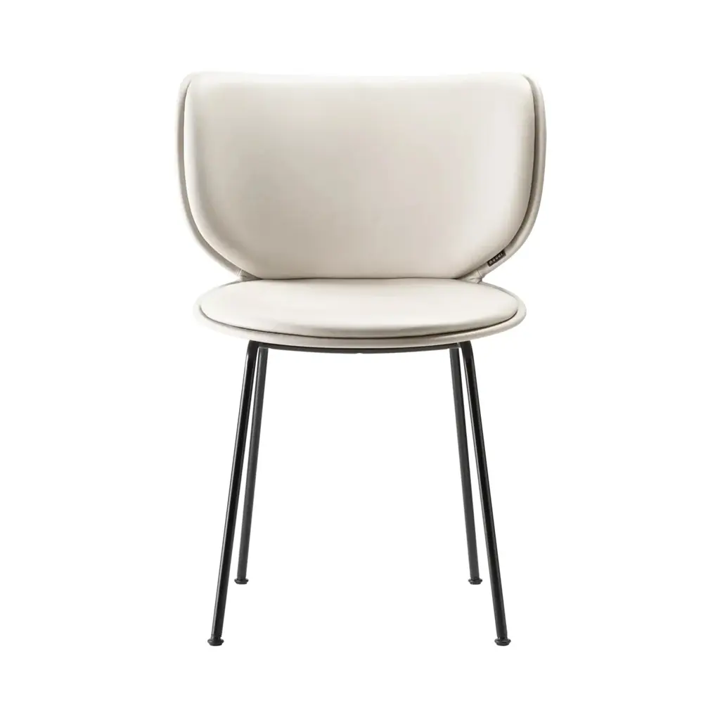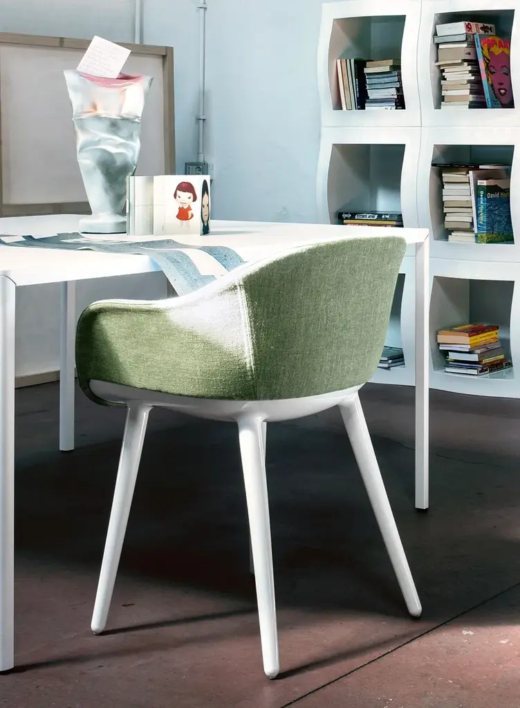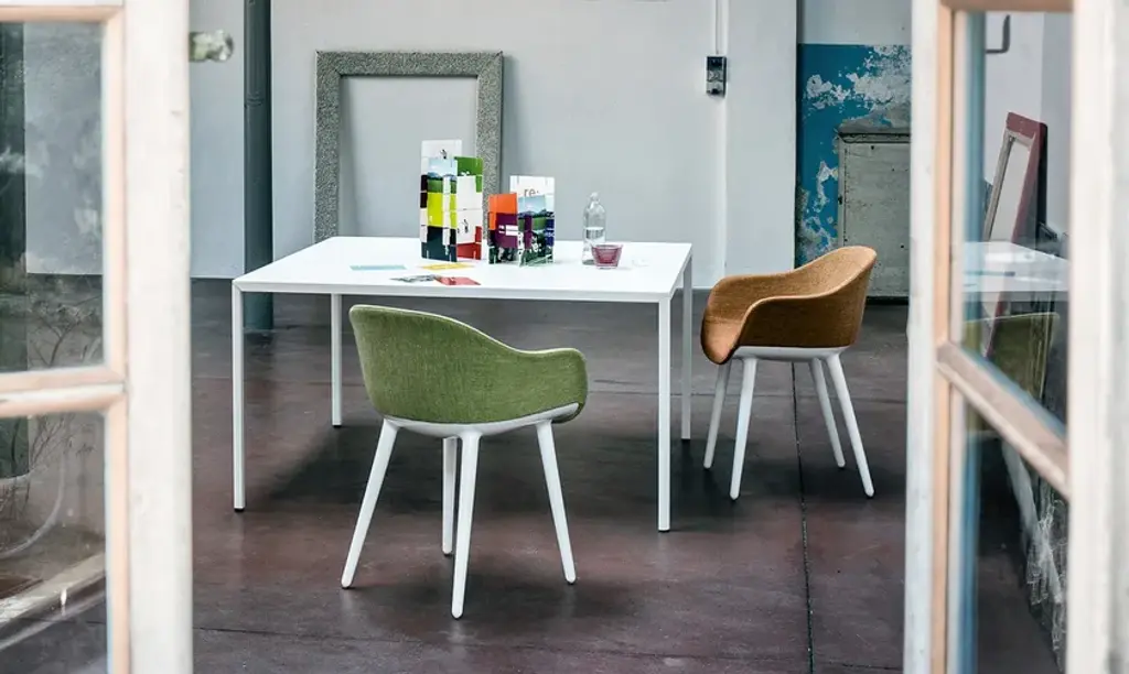 Material: frame in air-moulded polycarbonate. Seat and back in polyurethane foam covered in fabric (Kvadrat “Remix 2”) or in leather.