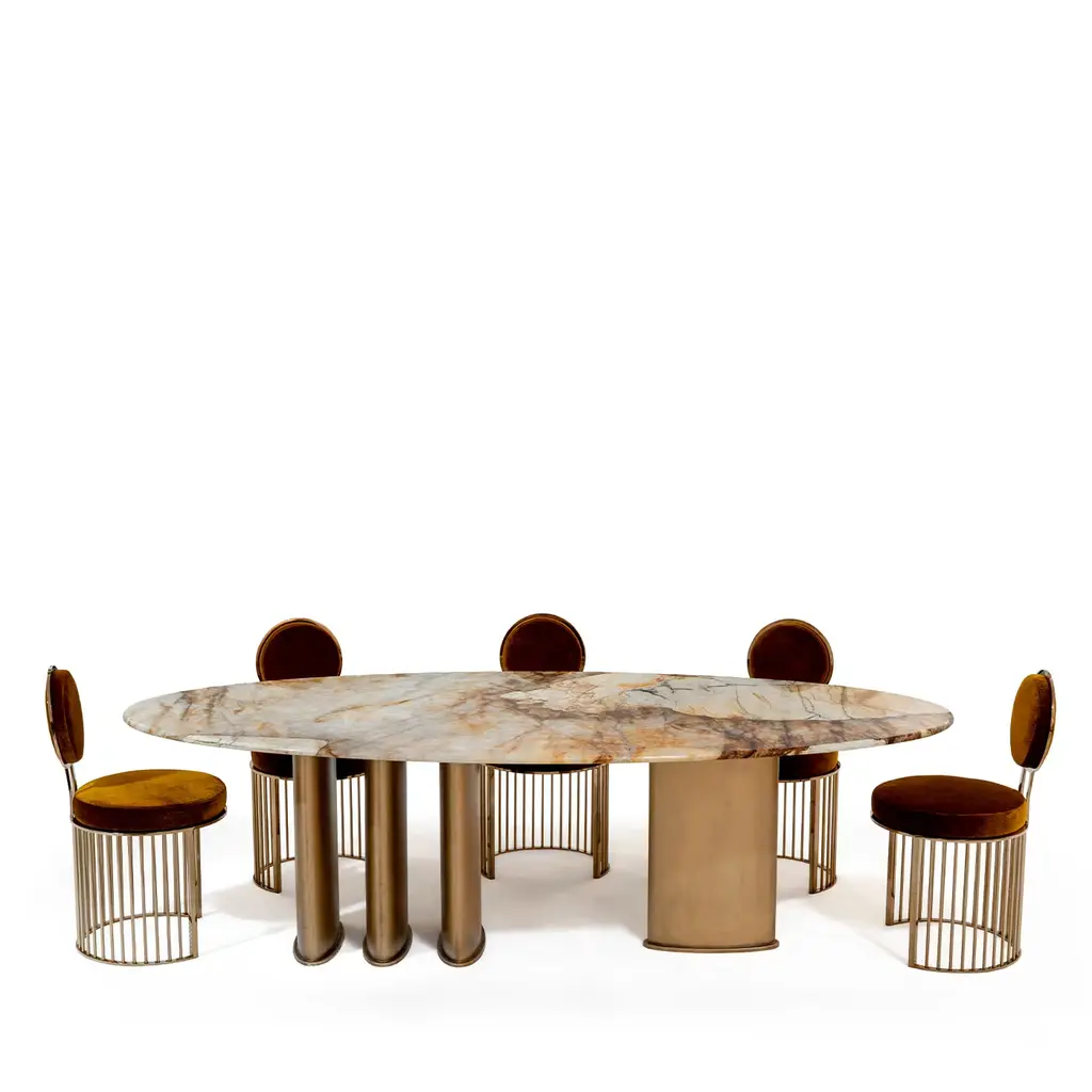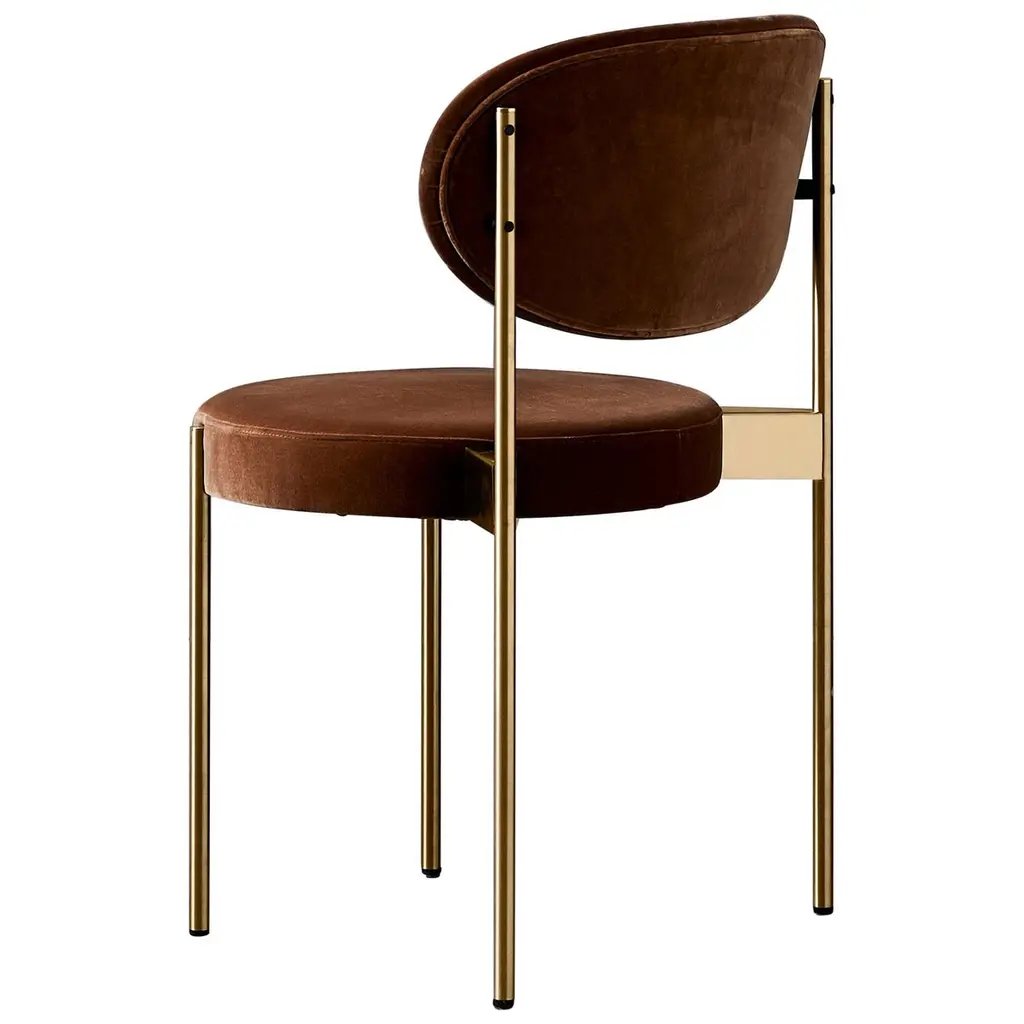 Style and refinement describe this gorgeous chair brimming with romantic vintage inspiration. It features a round seat and backrest, padded and upholstered with brown velvet, resting on a semi-circular series of dark gold-finished steel cylinders. Please consult with the Concierge for further information.