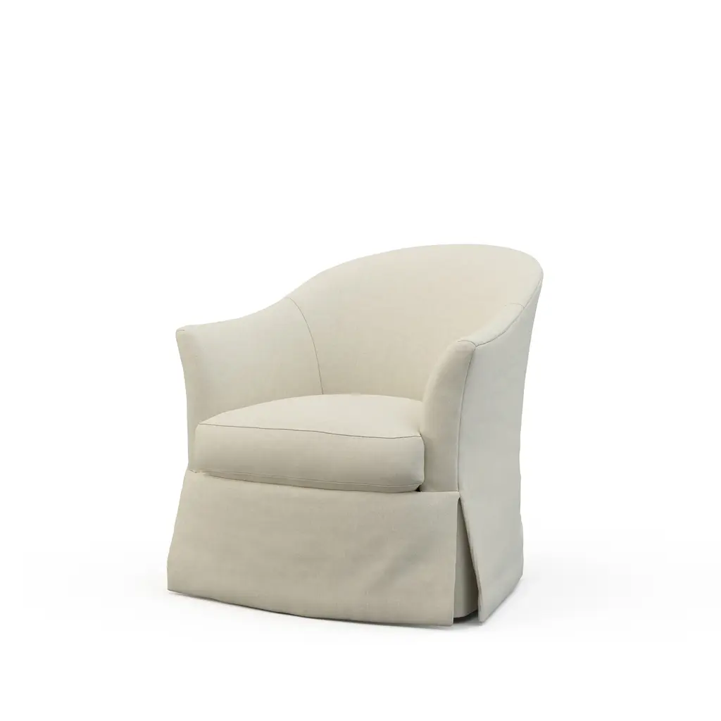 Featuring a curved back and dressmaker skirt, the Daphne Chair is a luxe mix of classic and contemporary. Easily style this customizable chair in any space, with the fabric of your choice. Ships In 8-10 Weeks Dressmaker skirt Tight back One loose seat cushion As Shown Fabric: Rayburn Oatmeal, Treescape Rosewood with Ivory Tape Around Skirt Bottom (lifestyle) As Shown Finish: Antique Walnut If you choose to purchase COM, once you have placed your order a customer service rep will contact you regarding where to send your fabric. Please note that current lead time is 17-19 weeks once your fabric arrives at the factory, and if unused fabric is under 1.5 yards, it cannot be sent back to you.This product can be special ordered in additional fabrics, leathers, finishes, and cushion fillings. Click here to email us for for additional information about special ordering.This image is for illustrative purposes only. The colors shown are accurate within the constraints of lighting, photography, and the color accuracy of your screen.