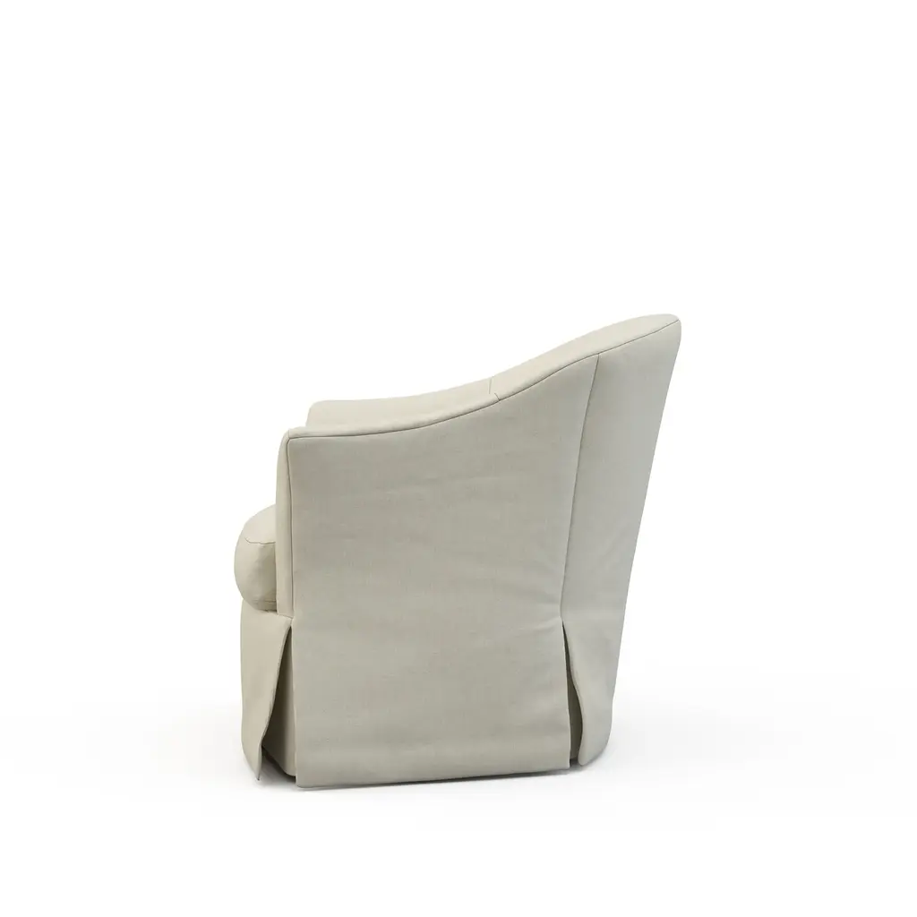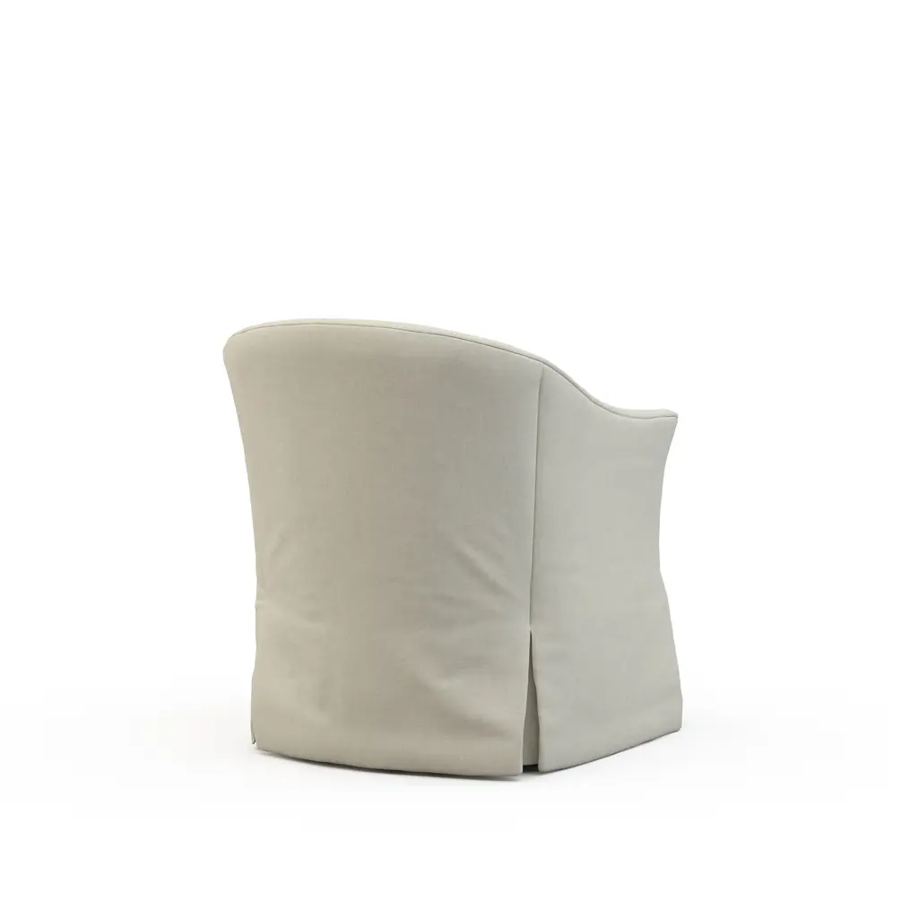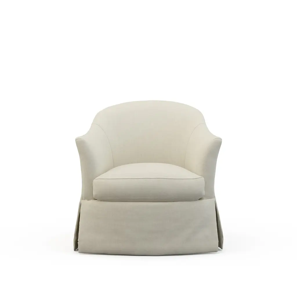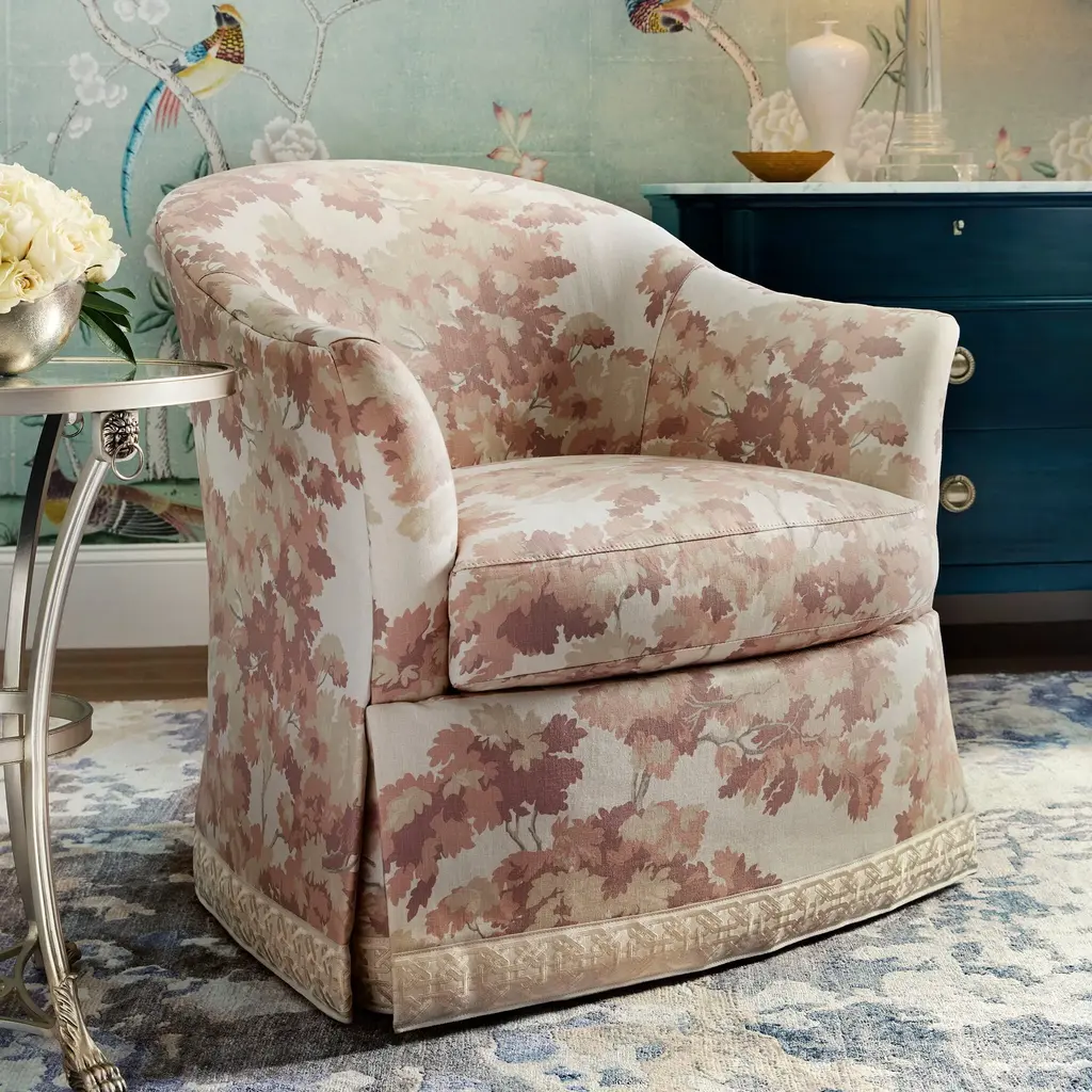 Featuring a curved back and dressmaker skirt, the Daphne Chair is a luxe mix of classic and contemporary. Easily style this customizable chair in any space, with the fabric of your choice. Ships In 8-10 Weeks Dressmaker skirt Tight back One loose seat cushion As Shown Fabric: Rayburn Oatmeal, Treescape Rosewood with Ivory Tape Around Skirt Bottom (lifestyle) As Shown Finish: Antique Walnut If you choose to purchase COM, once you have placed your order a customer service rep will contact you regarding where to send your fabric. Please note that current lead time is 17-19 weeks once your fabric arrives at the factory, and if unused fabric is under 1.5 yards, it cannot be sent back to you.This product can be special ordered in additional fabrics, leathers, finishes, and cushion fillings. Click here to email us for for additional information about special ordering.This image is for illustrative purposes only. The colors shown are accurate within the constraints of lighting, photography, and the color accuracy of your screen.