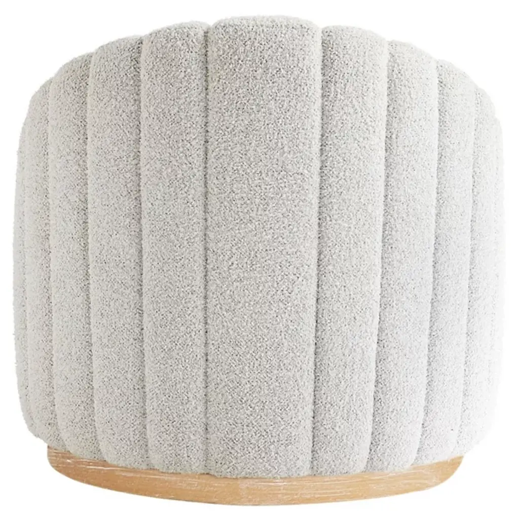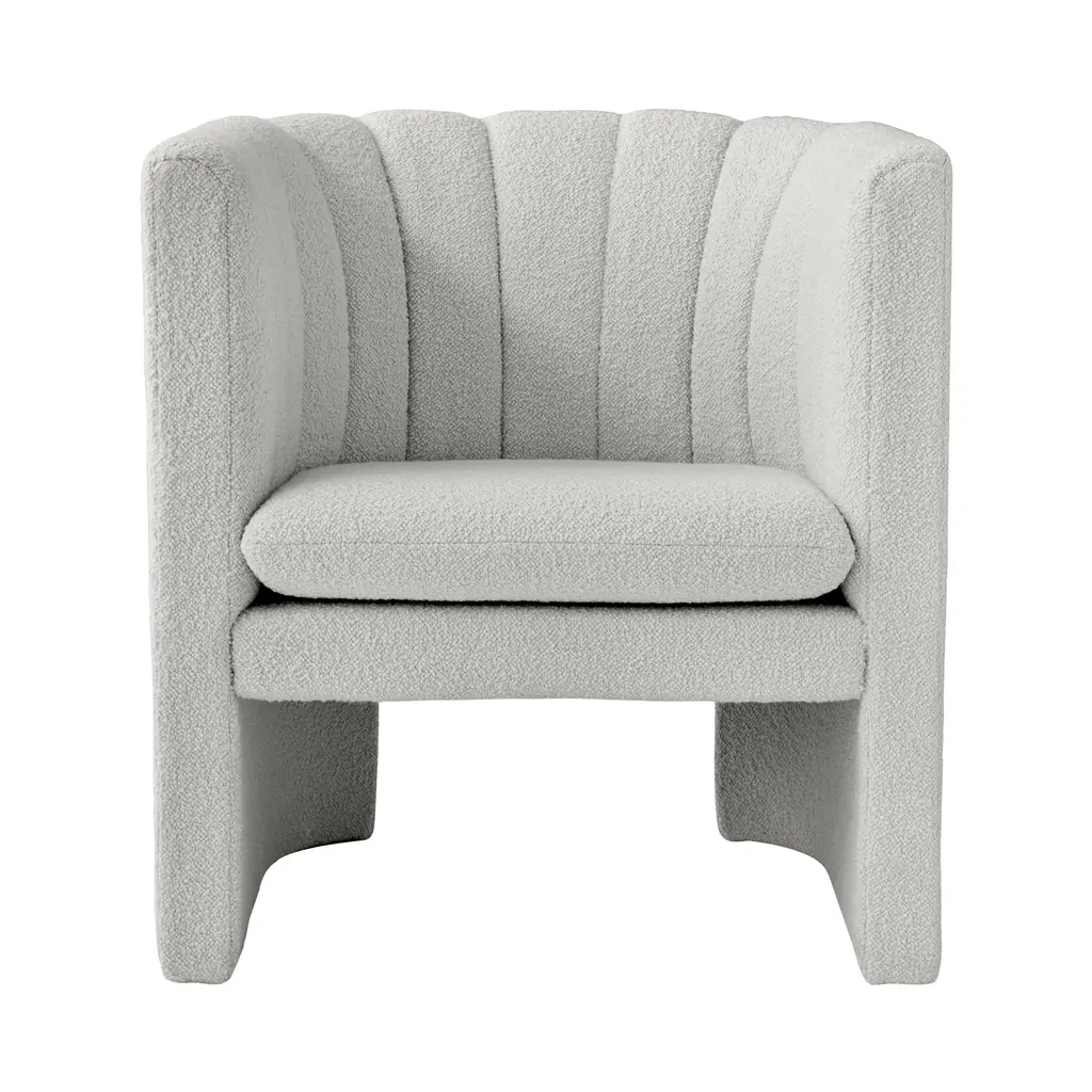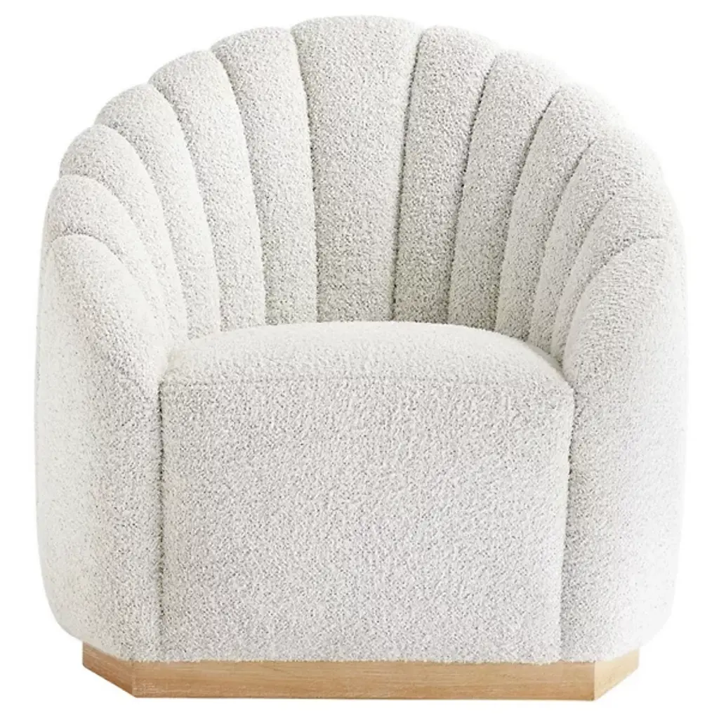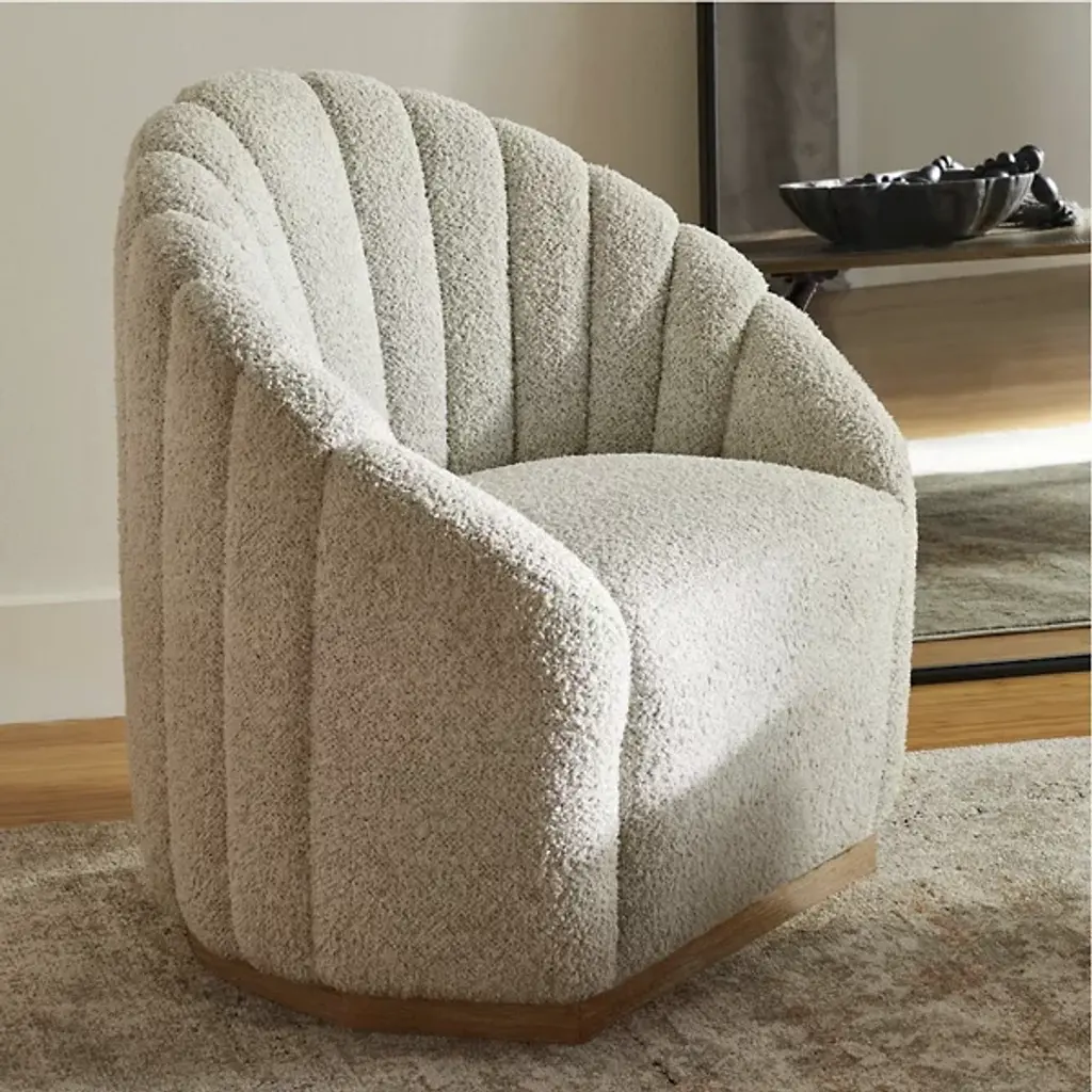 Make a memorable addition to Mid-Century Modern spaces with the plush and powerful lines of the Daria Chair from Cyan Design. A trapezoidal base of solid oak extends upward to a high, shell-shaped back that rises around a pouf-like cushion, ensconcing it in a wraparound back to provide a supportive structure. This is softened by bouclé material that creates a retro appeal suggestive of the seaside, echoing the name inspired by the Persian term for sea.