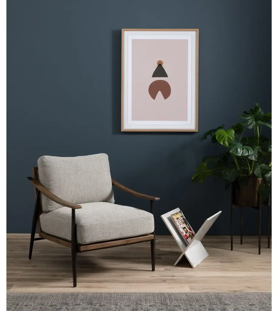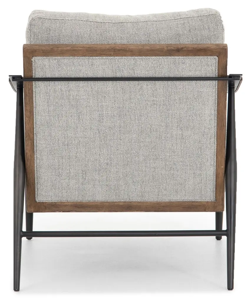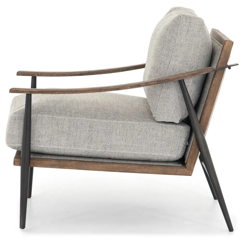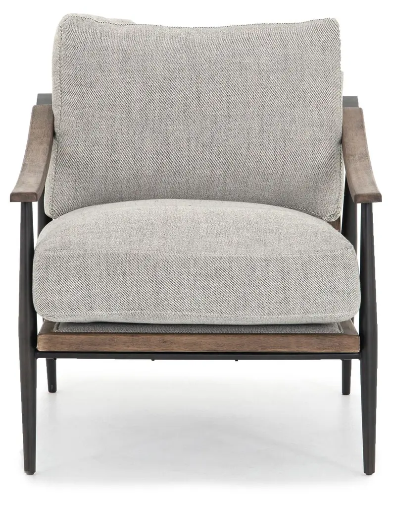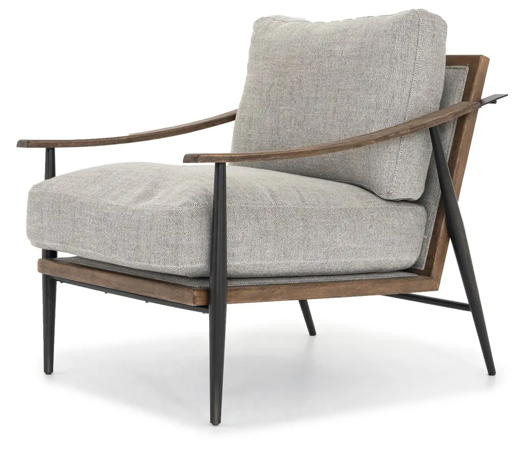 Comfort and class in one chic silhouette. Sloped wooden arms and forged, gunmetal-finished legs frame cushy feather-blend seating covered in a textural grey twill, striking great tonal balance between warm and cool.