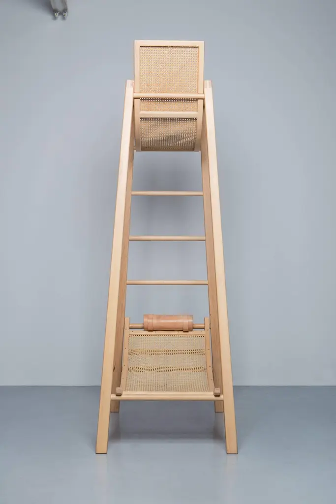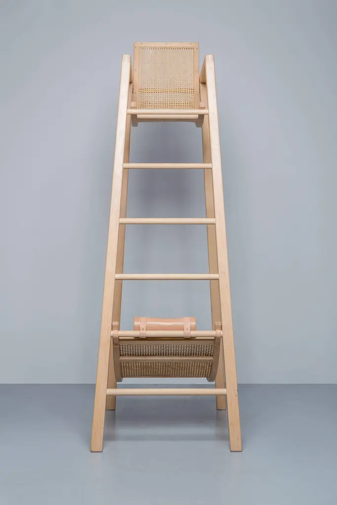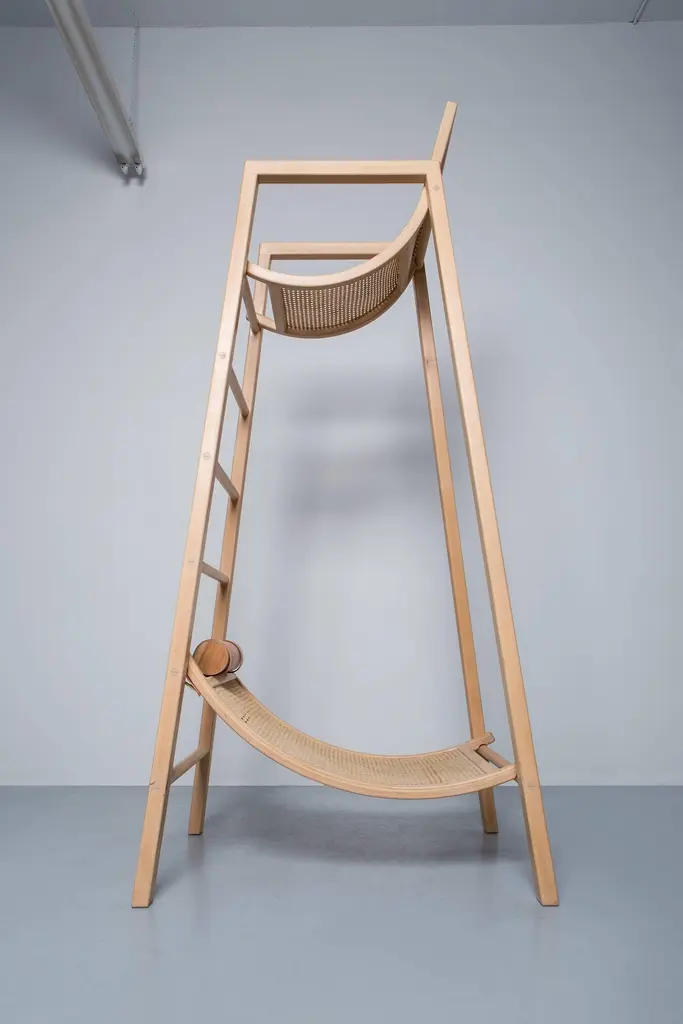 This chair is named in honor of the famous lifeguard. David Mazel Tov is a design focused on perspectives and it allows two people to co-exist in a space with different points of view. When looking in opposite directions, you can focus on conversation, referee your own arguments or just enjoy your environment sipping a cocktail from the top. The structure is stabilized by the seats, no bracing. It’s a study of shape and balance, of connections among people and the juxtaposition of scales between furniture and architecture.