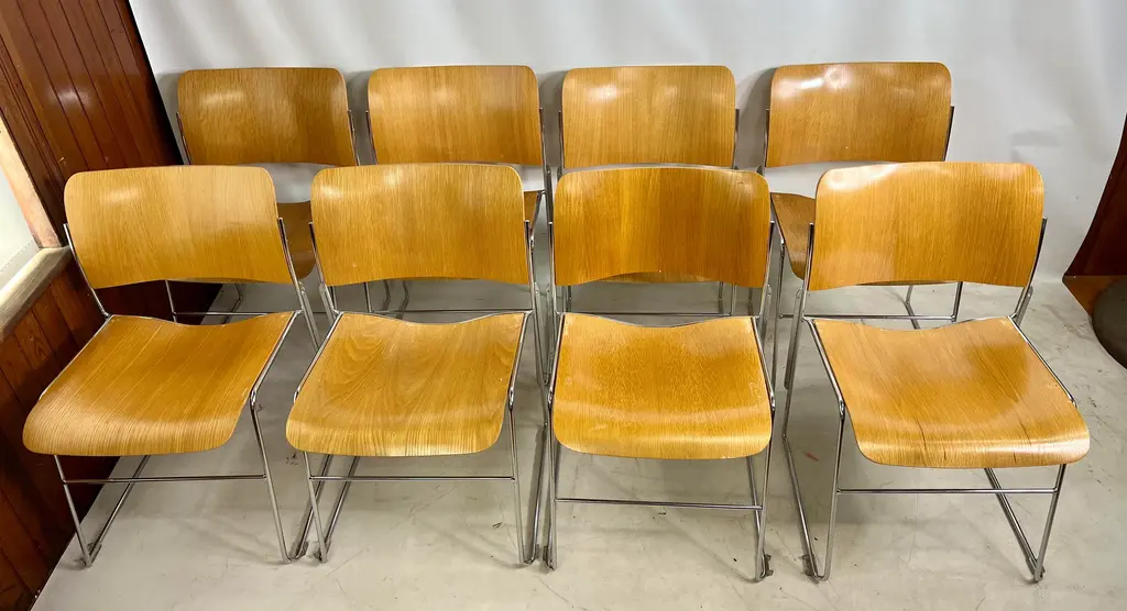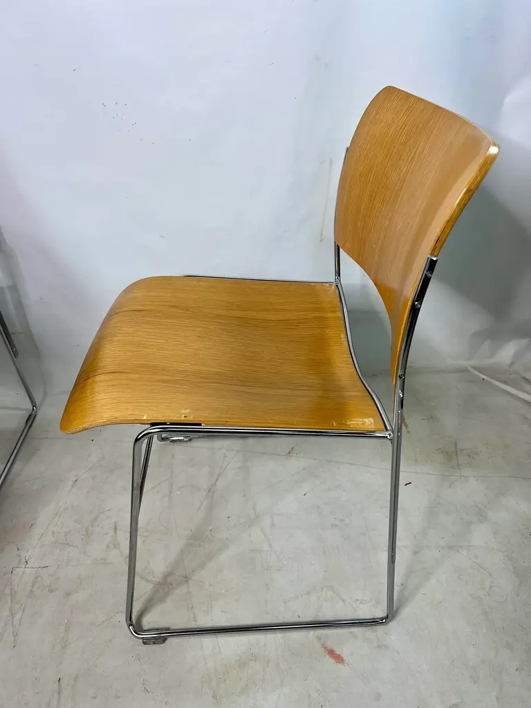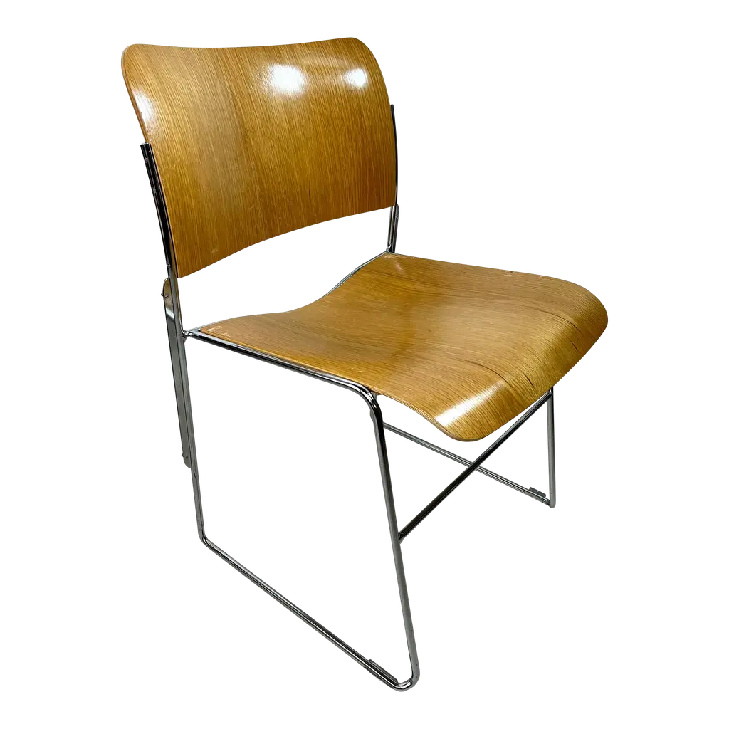 The 1990s David Rowland 40/4 Bentwood stackable chair is a classic design that showcases the elegance and functionality of bentwood furniture. Created by renowned designer David Rowland, this chair features a curved backrest and seat crafted from a single sheet of wood, providing both comfort and durability. Its unique design allows multiple chairs to be stacked together, making it a practical choice for spaces with limited storage. The 40/4 Bentwood chair is a timeless piece that has stood the test of time and continues to be a popular choice for both residential and commercial settings.