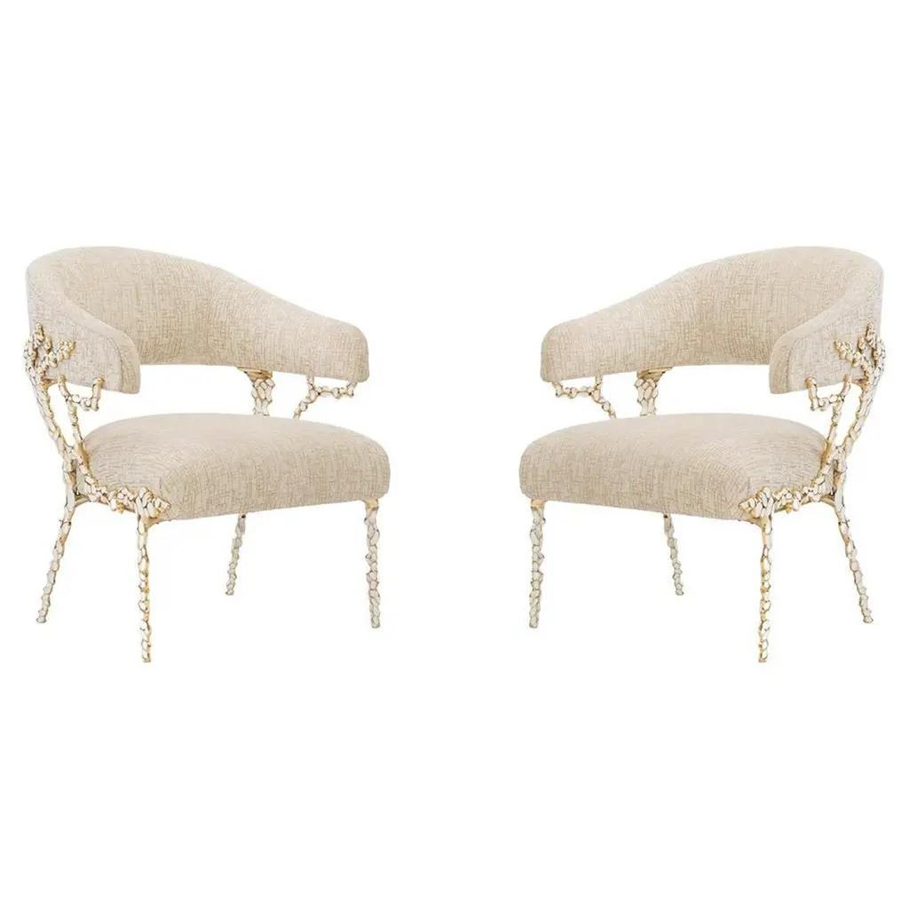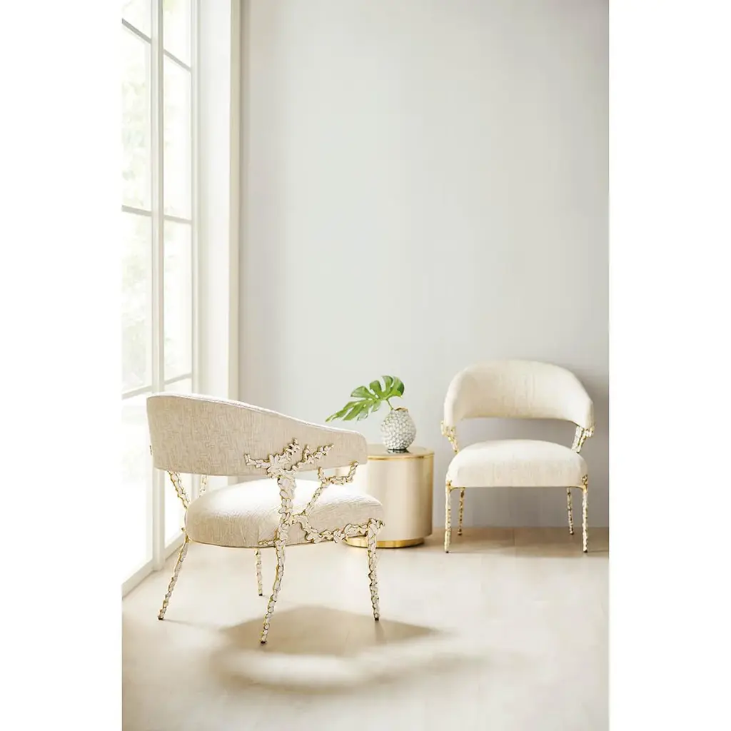 Inspired by the organic elegance of nature, its sculptural frame evokes the fluidity of branches or coral reaching for the light. Crafted from solid brass and finished in a lustrous Gold Brush with striking white enamel inlays, this chair radiates contemporary sophistication. The tight seat and curved back are richly upholstered in a soft, textured neutral fabric, offering both comfort and refinement. A bold yet graceful addition to any space, this chair redefines modern opulence with its artistic form and exquisite materials. Dimensions: 27.25" W x 27.25" D x 32.5" H Seat - 21.5" H Arm - 27.25" H