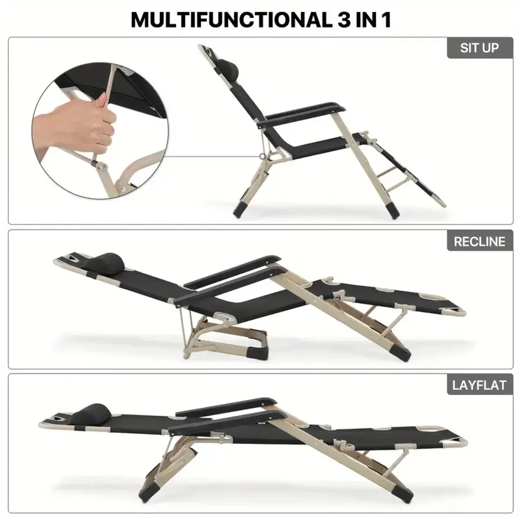 ¡¾Classic & Functional¡¿£ºWith a minimalist aesthetic and ergonomic design,the chaise lounge set in a classic simple style goes well with most outdoor landscaping.Its minimalist aesthetic adds a touch of sophistication to your outdoor space and can be perfect to invite over a friend,tan outside sipping tropical drinks and even more commercial use in the open air¡¾Upgraded Components¡¿:The backrest provides maximum comfort with 4 adjustable in preset angles. Textilene,the seat surface material features a perfect balance between firmness and softness,providing a sturdy but soft surface to reduce muscle tension and stress¡¾Easy to Carry¡¿:No installation required,easily fold. You can easily set the chair up or fold it for storage in minutes.That makes it highly portable and convenient to carry it to the beach,the pool or camping.¡¾Easy Maintaining & Clean¡¿:The textilene fabric material ensures hassle-free maintenance and gives pretty resistance to UV and water,non fading.Whether it's sunny or rainy,all-season is available
