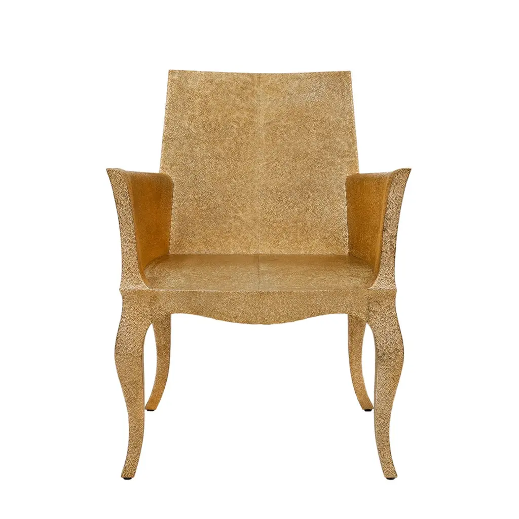 Introducing the Art Deco Chairs, a stunning Art Deco Chairs set designed by the renowned Paul Mathieu for Stephanie Odegard. This elegant Art Deco Chair duo boasts a unique curved profile that exudes a sophisticated and timeless charm, making it the perfect addition to any modern or classic interior.Crafted with utmost care and attention to detail, these Art Deco Chairs are made to order and are available in twelve metal clad finishes, ensuring that you can choose the perfect one to match your individual style and taste. The use of high-quality materials and expert craftsmanship ensure that each Art Deco Chair is not only beautiful but also a true piece of art.The curved legs and side arms of this Art Deco Chair are hand carved from solid pieces of teak. Pattern makers trace and cut complex forms that will cover the chair in a skin of copper, white bronze, brass or antiqued white bronze The metal finishes will tarnish over time. Regular non-abrasive household metal polishes can be used to restore the original luster.Overall, if you're looking for a piece of furniture that combines luxury, comfort, and style, then the Art Deco Chairs is an excellent choice. With its distinctive curved profile and multiple finish options, this Chair set is sure to elevate the look of any room it is placed in, and be a beloved addition to your home for years to come.The images shown in this listing are shot in different lighting conditions and/or are 3D illustrations. We encourage our customers to please request a sample or a full sample set of 12 finishes so that they can experience the finish first hand. Deco Chairs Fine Hammered in Brass by Paul MathieuSize- 26"x 27"x 33"HMaterials - Brass, Metal sheet, Teak, Wood, MetalTechniques: Hand-Crafted, Hand-Carved, Metal Work, Wood Work, Metal Wrapping, PolishedPlease note that moisture in air, sudden change in temperature and natural movement of wood over time causes the metal to wrinkle or bubble up. We use well seasoned, reclaimed teak and high quality marine grade MDF (wherever technically possible) to avoid and delay the mentioned changes. However a perfect stability of metal cannot be guaranteed. Please note that our smooth finish metal clad pieces will have some unavoidable tool marks. This is proof that everything is done by hand. The smooth finish will not come out like a machine made perfect surface and the master artisan will do their best to make it look as good/clean/stable/perfect as he possibly can.The antique white bronze finish is hand done by using an acidic chemical over the white bronze finish to recreate a natural patination. Like with the natural patination of silver, copper, or brass, the final result and color uniformity of the patina cannot be guaranteed. The goal of this finish is to achieve rainbow-like shades with dull, shiny, cloudy, and streaky patches to give an illusion of antiquing. Please note:None of our metal clad pieces are treated with a protective “finish” thus enabling the items to age naturally over time. We will of course polish them well before we pack them. a) Copper oxidizes faster than the other metals. In six to twelve months it will most likely lose its shine and will gradually turn to different shades of brown and/or green/blue. This aging process and its effect is referred to as verdigris. After a year the piece should not change much more. Copper does not rust, but does require periodic cleaning in order to retain its original shine if that the preferred option. ('BRASSO' or any known copper polish can be used to polish copper).b) Brass retains its shine for far longer than others, but will tarnish if not cleaned on occasion. ('BRASSO' is made to polish brass).c) White bronze, has the least tendency to show age or tarnish. If kept in a controlled climate, this metal will hold its shine for years. It can be cleaned with a cleanser and polished with a cloth. d) The antiqued white bronze finish will react with the natural elements the fastest in the beginning but it too will stop reacting and will settle down in a stable state like copper after 6-12 months. Since it is already antiqued and looked like it is tarnished, as described in an earlier message, this fast reaction will not change the over all look. In that way this surface is most forgiving. The images shown in this listing are shot in different lighting conditions and/or are 3D illustrations. We encourage our customers to please request a sample or a full sample set of 12 finishes so that they can experience the finish first hand.