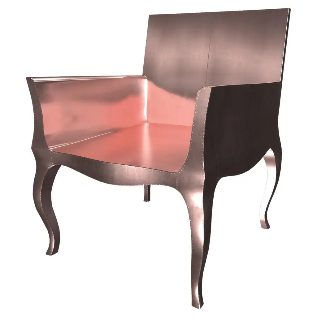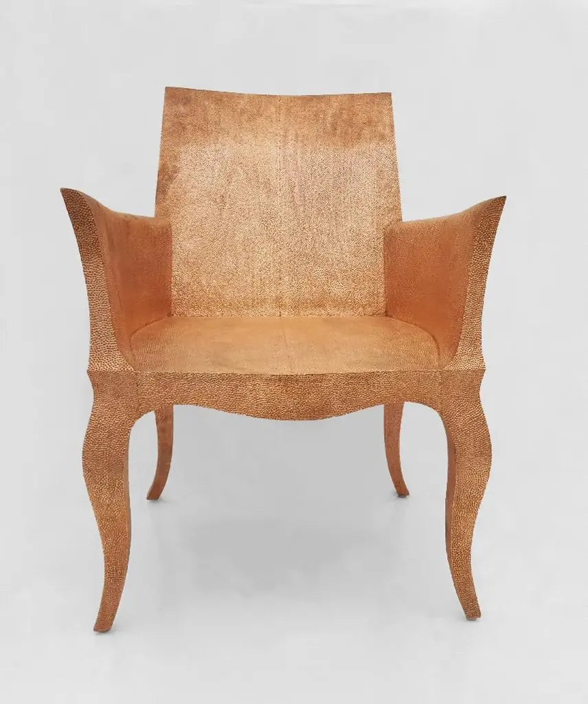 Introducing the Art Deco Chairs, a stunning Art Deco Chairs set designed by the renowned Paul Mathieu for Stephanie Odegard. This elegant Art Deco Chair duo boasts a unique curved profile that exudes a sophisticated and timeless charm, making it the perfect addition to any modern or classic interior.Crafted with utmost care and attention to detail, these Art Deco Chairs are made to order and are available in twelve metal clad finishes, ensuring that you can choose the perfect one to match your individual style and taste. The use of high-quality materials and expert craftsmanship ensure that each Art Deco Chair is not only beautiful but also a true piece of art.The curved legs and side arms of this Art Deco Chair are hand carved from solid pieces of teak. Pattern makers trace and cut complex forms that will cover the chair in a skin of copper, white bronze, brass or antiqued white bronze The metal finishes will tarnish over time. Regular non-abrasive household metal polishes can be used to restore the original luster.Overall, if you're looking for a piece of furniture that combines luxury, comfort, and style, then the Art Deco Chairs is an excellent choice. With its distinctive curved profile and multiple finish options, this Chair set is sure to elevate the look of any room it is placed in, and be a beloved addition to your home for years to come.The images shown in this listing are shot in different lighting conditions and/or are 3D illustrations. We encourage our customers to please request a sample or a full sample set of 12 finishes so that they can experience the finish first hand. Deco Chairs in Smooth Copper by Paul Mathieu for S. OdegardSize- 26"x 27"x 33"HMaterials - Copper, Metal sheet, Teak, Wood, MetalTechniques: Hand-Crafted, Hand-Carved, Metal Work, Wood Work, Metal Wrapping, PolishedPlease note that moisture in air, sudden change in temperature and natural movement of wood over time causes the metal to wrinkle or bubble up. We use well seasoned, reclaimed teak and high quality marine grade MDF (wherever technically possible) to avoid and delay the mentioned changes. However a perfect stability of metal cannot be guaranteed. Please note that our smooth finish metal clad pieces will have some unavoidable tool marks. This is proof that everything is done by hand. The smooth finish will not come out like a machine made perfect surface and the master artisan will do their best to make it look as good/clean/stable/perfect as he possibly can.The antique white bronze finish is hand done by using an acidic chemical over the white bronze finish to recreate a natural patination. Like with the natural patination of silver, copper, or brass, the final result and color uniformity of the patina cannot be guaranteed. The goal of this finish is to achieve rainbow-like shades with dull, shiny, cloudy, and streaky patches to give an illusion of antiquing. Please note:None of our metal clad pieces are treated with a protective “finish” thus enabling the items to age naturally over time. We will of course polish them well before we pack them. a) Copper oxidizes faster than the other metals. In six to twelve months it will most likely lose its shine and will gradually turn to different shades of brown and/or green/blue. This aging process and its effect is referred to as verdigris. After a year the piece should not change much more. Copper does not rust, but does require periodic cleaning in order to retain its original shine if that the preferred option. ('BRASSO' or any known copper polish can be used to polish copper).b) Brass retains its shine for far longer than others, but will tarnish if not cleaned on occasion. ('BRASSO' is made to polish brass).c) White bronze, has the least tendency to show age or tarnish. If kept in a controlled climate, this metal will hold its shine for years. It can be cleaned with a cleanser and polished with a cloth. d) The antiqued white bronze finish will react with the natural elements the fastest in the beginning but it too will stop reacting and will settle down in a stable state like copper after 6-12 months. Since it is already antiqued and looked like it is tarnished, as described in an earlier message, this fast reaction will not change the over all look. In that way this surface is most forgiving. The images shown in this listing are shot in different lighting conditions and/or are 3D illustrations. We encourage our customers to please request a sample or a full sample set of 12 finishes so that they can experience the finish first hand.