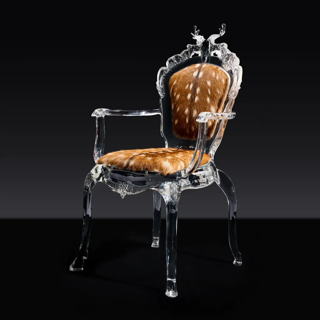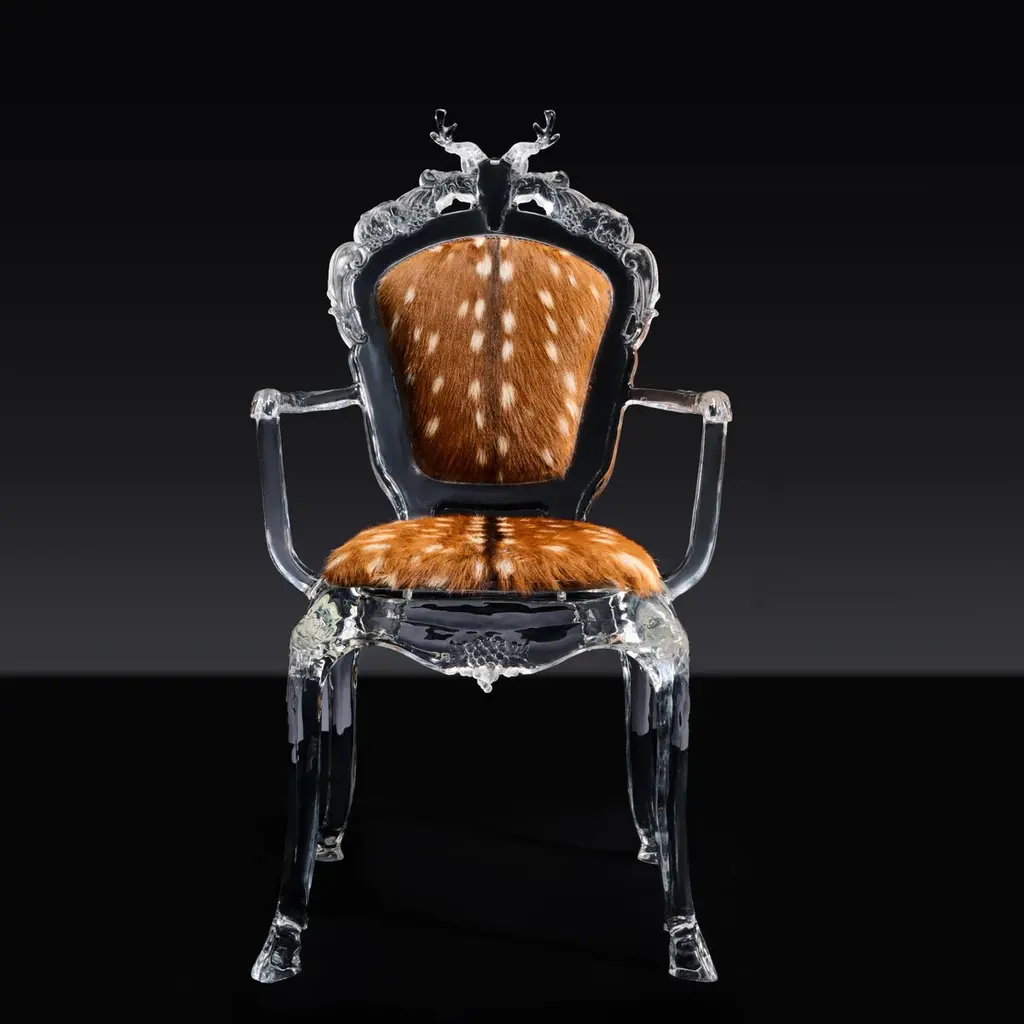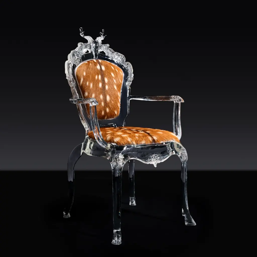 The chair is based on a Rococo style antique chair. This style of furniture flourished in the 30s of the 18th century, emphasizing beautiful art decoration and smooth curved shapes, and is one of the milestones in the history of furniture art.Artist Cai Zhisong was invited to artistically treat the chair shape, incorporating the representative deer elements in his works, and casting them in Artificial crystals, supplemented by fur soft bags, which is of great artistic and collectible value.