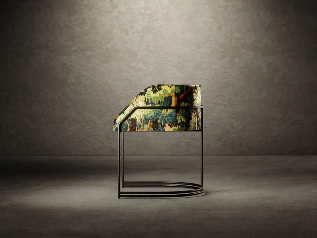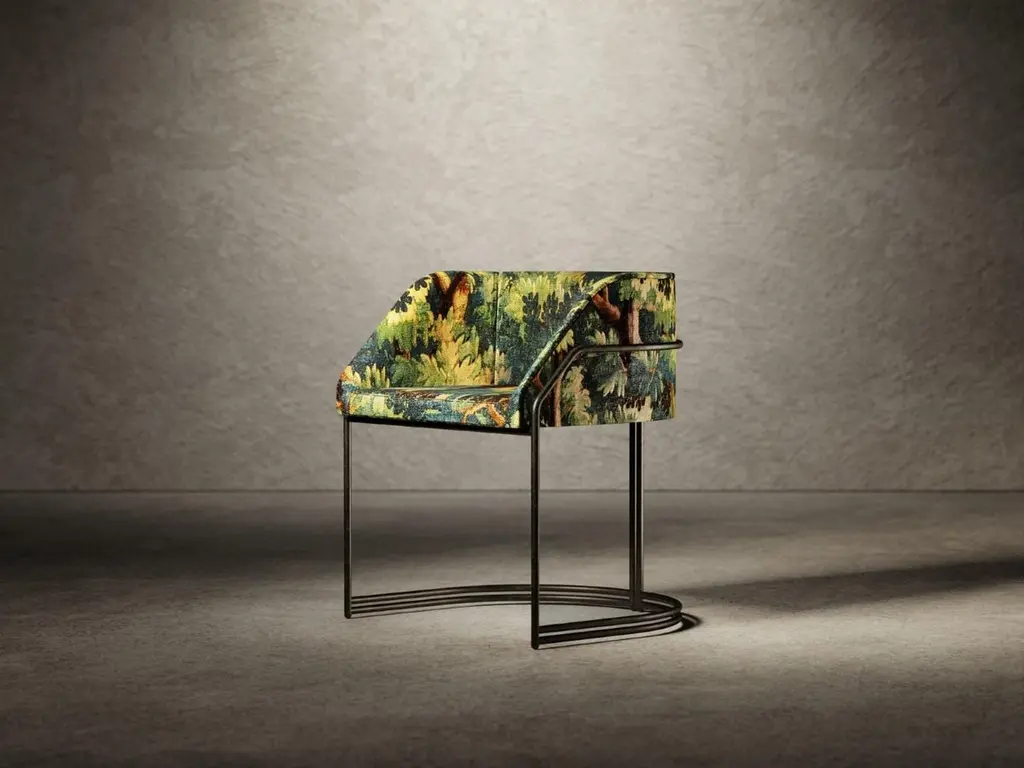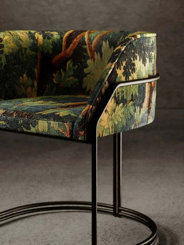 Déjà Vu chair is composed of a wooden shell padded with different densities polyurethane foam and finished with an upper layer of acrylic fiber. The seat is available completely covered in fabric or leather, while the base is in the metal finishes of the collection.The metal tubular base wraps around the seat.This version of Déjà Vu chair is upholstered with Schwarzwald by Dedar, a fabric with a seventeenth-century tapestry design boasts decisive and powerful pictorial personality. Feet are in black matte metal.DIMENSIONS:W59xD55xH69 (seat H47) cm