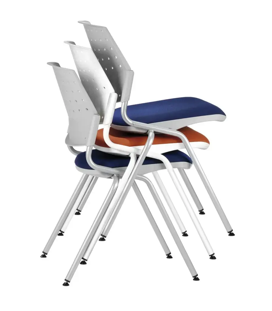 Delfi Brio 063 - Upholstered fabric reception chair.Nesting - Stacking chairs with flip-up seat for frontal nesting.Seat always padded and upholstered in fabric or leather.UnderSeat and back in copolymer available in various colors.3 backs available: round for Delfi, square for DelfiBrio, mesh for DelfiNet.4 legs metal base with or without arms and adjustable glides.Available version with 4 castors and/or 2 and 2.Available version with anti-panic writing tablet.Ideal for: conference rooms, clinics, hospitals, schools, front desk.Optional: Front panel padded and upholstered seat or seat and back, connecting ganging, left tablet, big size tablet for PC, transport dolly, floor metal bracket alignment.