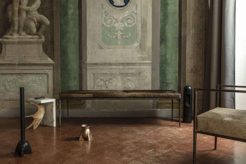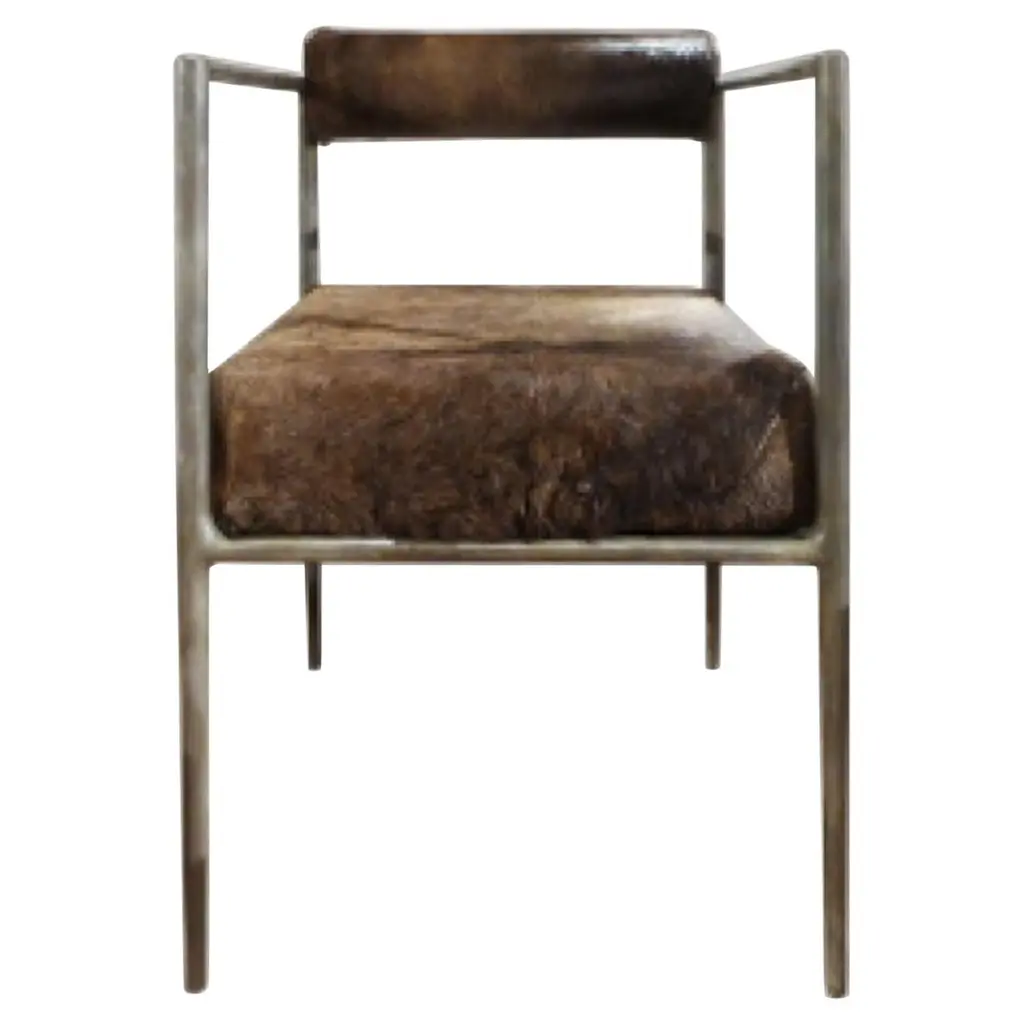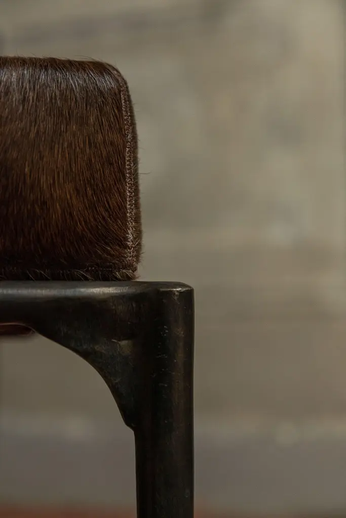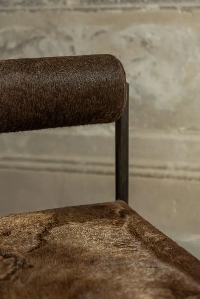 Desk alchemy chair by Rick Owens.2015Dimensions: L 50 x W 50 x H 81 cmMaterials: Bronze, camel skinWeight: 35 kgSeat Height with the cushion: 53 cmRick Owens is a California-born fashion and furniture has developed a unique style that he describes as “luxe minimalism.”Though his designs are simple and spare, Owens thrives on theatricality - producing wildly original runway shows featuring gender-fluid models of all ages and shapes. Inspired by his longtime partner and muse, Michele Lamy, clothes and furniture alike feature dark grays, blacks and browns. Like his frontier forebears, Owens finds his strongest influences in nature - his furniture and housewares have simple, organic shapes, and a few items even feature his distinctly 21st century take on antlers.
