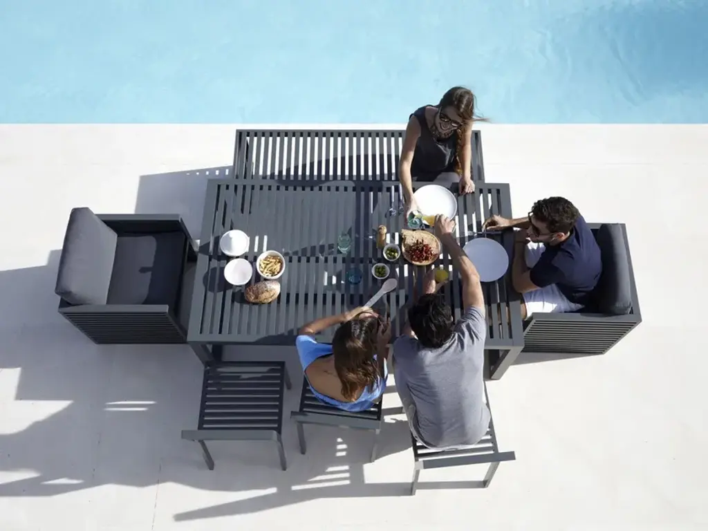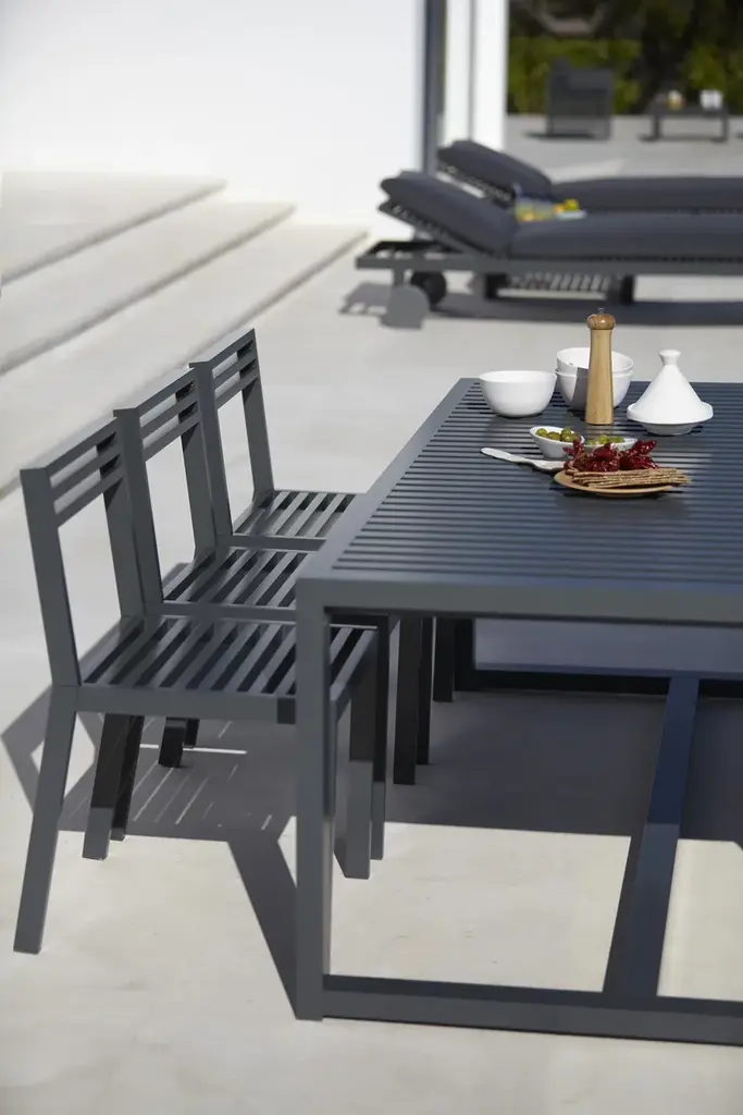 “I have always felt attracted by the patterns of light and shadows filtering through Mediterranean shutters, as well as by the work of certain architects from the Far East who work with wooden slats and bamboo cane. DNA is an outdoor furniture collection that reinterprets the essence of these horizontal shapes.”José A. Gandía-BlascoDNA is a collection of outdoor furniture inspired by the subtle play of the modulations of light and shadows filtering through Mediterranean shutters and it praises the shadows of Japanese aesthetics in traditional and contemporary architecture – the positive and the negative dispossessing any superfluous adornment.Made of anodized or thermo-lacquered aluminium profiles. Polyurethane foam rubber covered with water-repellent fabric. Removable fabric cover.Collections colour sample: anodized, white, agate grey, cement grey, sand, bronze, wine red, blue grey, grey blue, signal grey, anthracite and black.