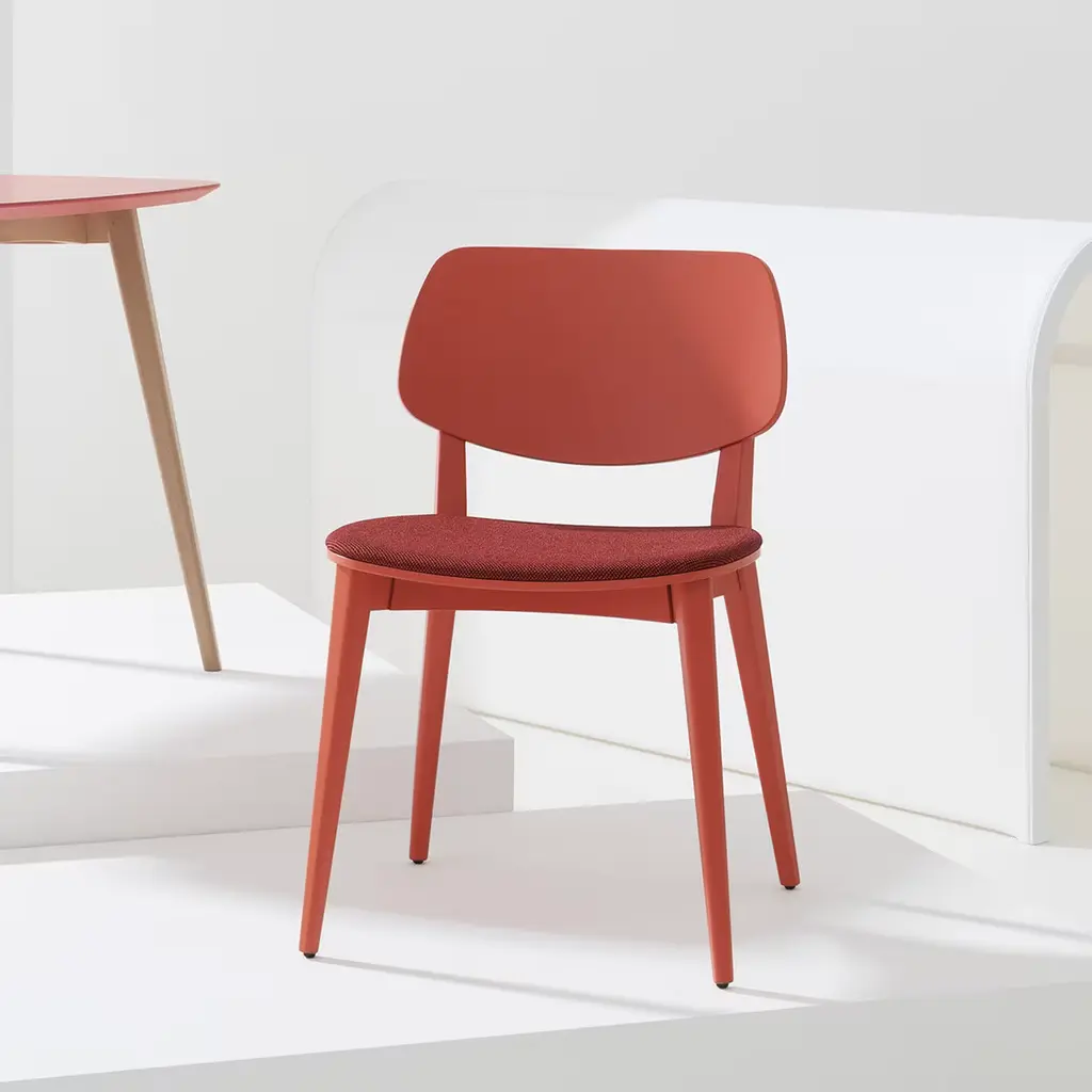 A simple aesthetic emphasized by vibrant colors and prized materials, this chair is crafted of solid ash and lacquered in bright red. Its stylish design brims with seductive allure, and its silhouette is comprised of four slim, tapered legs supporting an open backrest and the 47cm-high seat, which is upholstered in a matching fabric to a cohesive look.