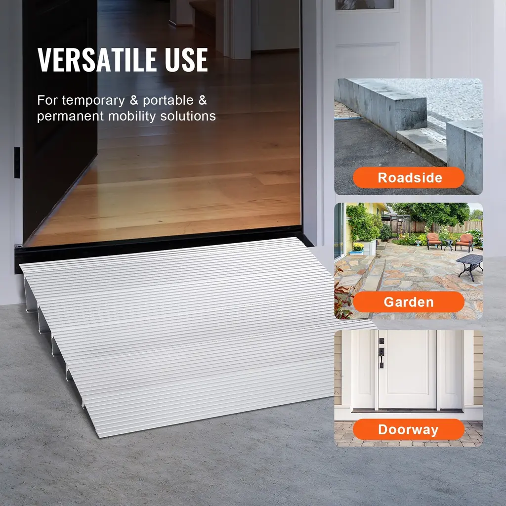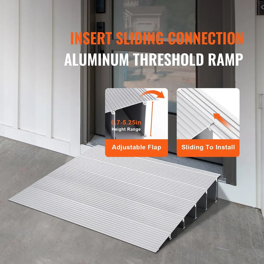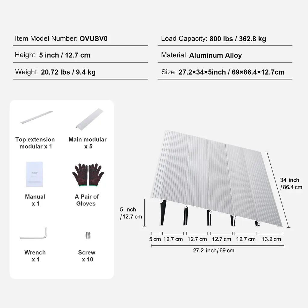 Modular Connection Design: Slide, join, go! Our door threshold ramp can be used independently or in combination, allowing you to expand the area or reduce the incline based on specific needs. Just slide to connect multiple units. No tools, just fun. Size: 22.2 x 34 x 4 in/27.2 x 34 x 5 in/32.2 x 34 x 6 in. Enhanced Usage: We've enhanced the stability of our threshold ramp. It comes with screws and installation gloves to ensure a scratch-free and secure setup. It's designed for long-term use with refined edges. Say goodbye to tire scratches and hello to smooth rolling. Durable Construction: Crafted from sturdy aluminum alloy, our wheelchair ramp boasts superior durability. It can withstand prolonged use while maintaining its stability and integrity. Forget rust, embrace the rain, and groove on with that slip-resistant texture, even when the skies open up. 800 lbs Load Capacity: Supporting a nifty 800 pounds, this door ramp is ready for wheelchairs, scooters, and for pushing or pulling wheeled items like bicycles up or down steps. It provides a convenient mode of transport for those with mobility challenges. It's not just about strength; it's about smooth rides and safe vibes. Everywhere & Anywhere: Stairs, doorways, and those pesky height differences? We've got 'em covered. Whether you're rolling into a family BBQ or a business meeting, our lightweight, non-slip scooter ramp is your go-to for smooth transitions. Security and convenience are wrapped in one stylish package. NOTE: To avoid being cut by the edges, please wear gloves before installation. Package Content 1 x Top Extension Modular Ramp (4 x Main Modular Ramps)for 4" Rise option/ (5 x Main Modular Ramps)for 5" Rise option/ ( 6 x Main Modular Ramps)for 6" Rise option 1 x Pair of Gloves 1 x Wrench (8 x Screws)for 4" Rise option / (10 x Screws)for 5" Rise option / (12 x Screws)for 6" Rise option 1 x User Manual