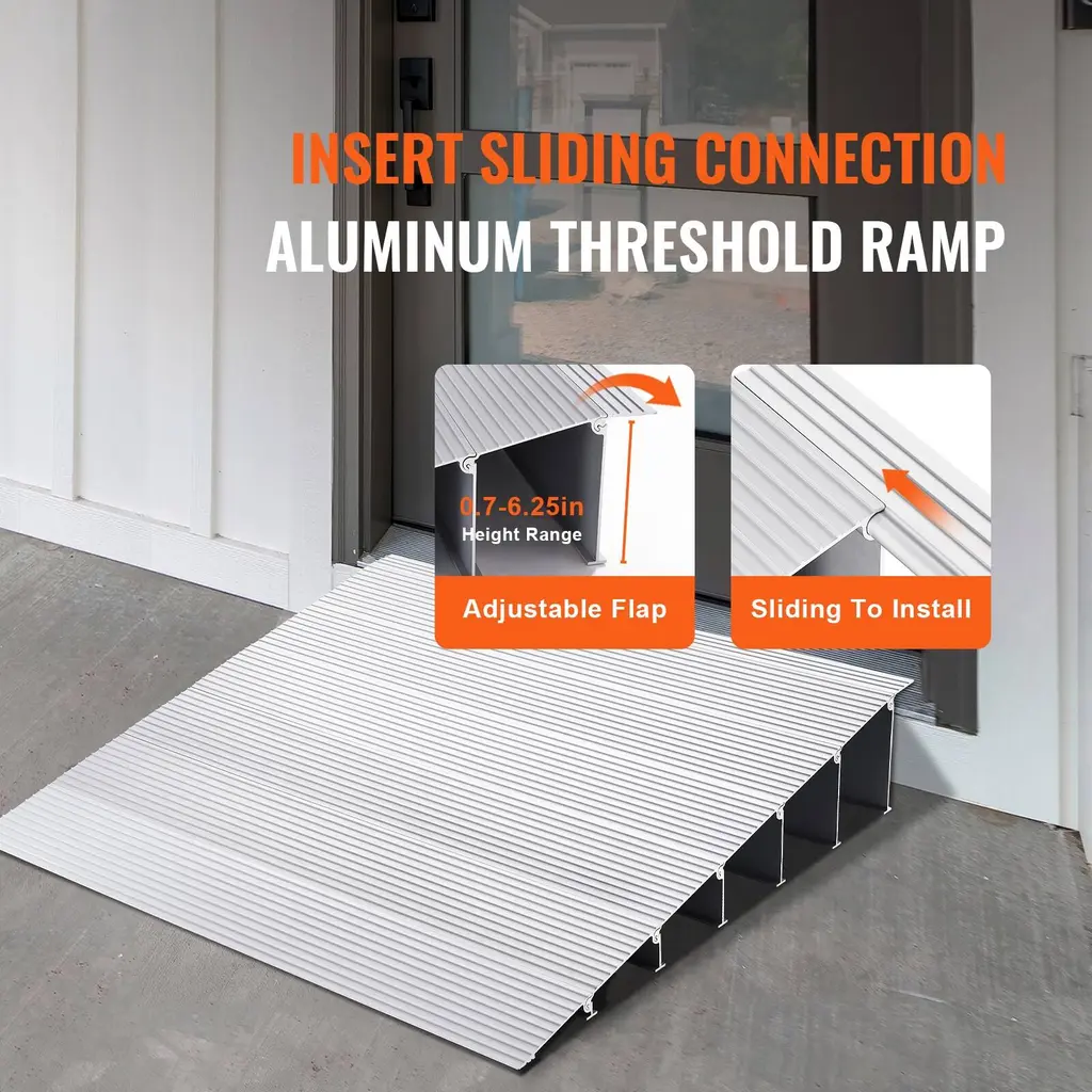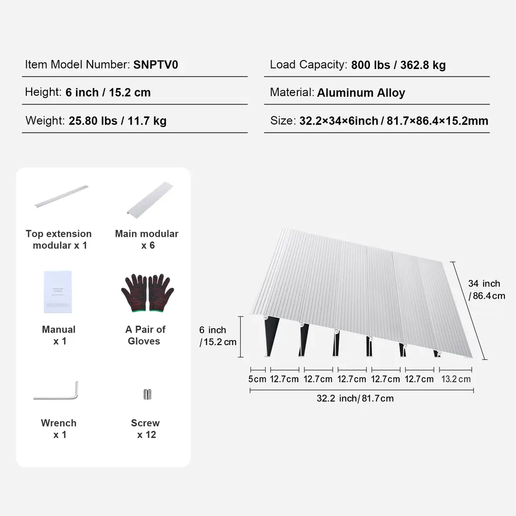 Modular Connection Design: Slide, join, go! Our door threshold ramp can be used independently or in combination, allowing you to expand the area or reduce the incline based on specific needs. Just slide to connect multiple units. No tools, just fun. Size: 22.2 x 34 x 4 in/27.2 x 34 x 5 in/32.2 x 34 x 6 in. Enhanced Usage: We've enhanced the stability of our threshold ramp. It comes with screws and installation gloves to ensure a scratch-free and secure setup. It's designed for long-term use with refined edges. Say goodbye to tire scratches and hello to smooth rolling. Durable Construction: Crafted from sturdy aluminum alloy, our wheelchair ramp boasts superior durability. It can withstand prolonged use while maintaining its stability and integrity. Forget rust, embrace the rain, and groove on with that slip-resistant texture, even when the skies open up. 800 lbs Load Capacity: Supporting a nifty 800 pounds, this door ramp is ready for wheelchairs, scooters, and for pushing or pulling wheeled items like bicycles up or down steps. It provides a convenient mode of transport for those with mobility challenges. It's not just about strength; it's about smooth rides and safe vibes. Everywhere & Anywhere: Stairs, doorways, and those pesky height differences? We've got 'em covered. Whether you're rolling into a family BBQ or a business meeting, our lightweight, non-slip scooter ramp is your go-to for smooth transitions. Security and convenience are wrapped in one stylish package. NOTE: To avoid being cut by the edges, please wear gloves before installation. Package Content 1 x Top Extension Modular Ramp (4 x Main Modular Ramps)for 4" Rise option/ (5 x Main Modular Ramps)for 5" Rise option/ ( 6 x Main Modular Ramps)for 6" Rise option 1 x Pair of Gloves 1 x Wrench (8 x Screws)for 4" Rise option / (10 x Screws)for 5" Rise option / (12 x Screws)for 6" Rise option 1 x User Manual