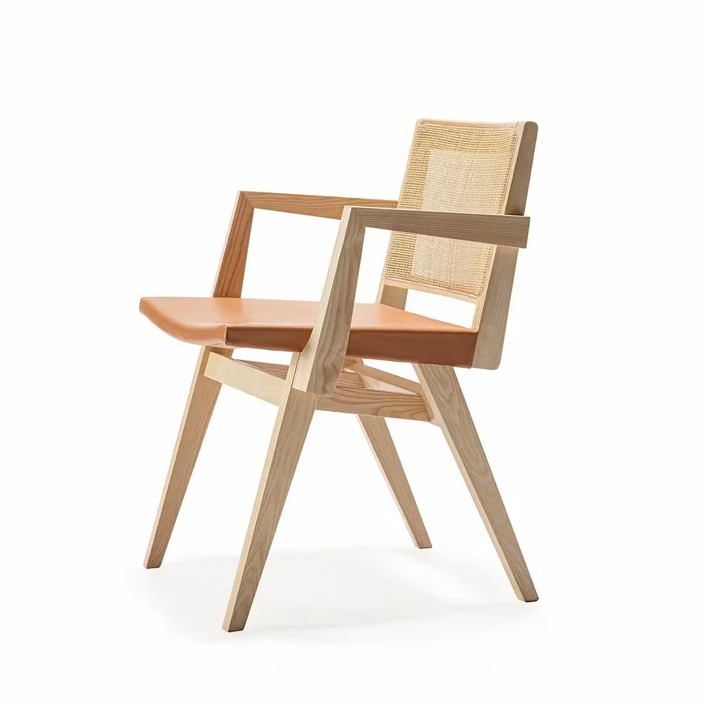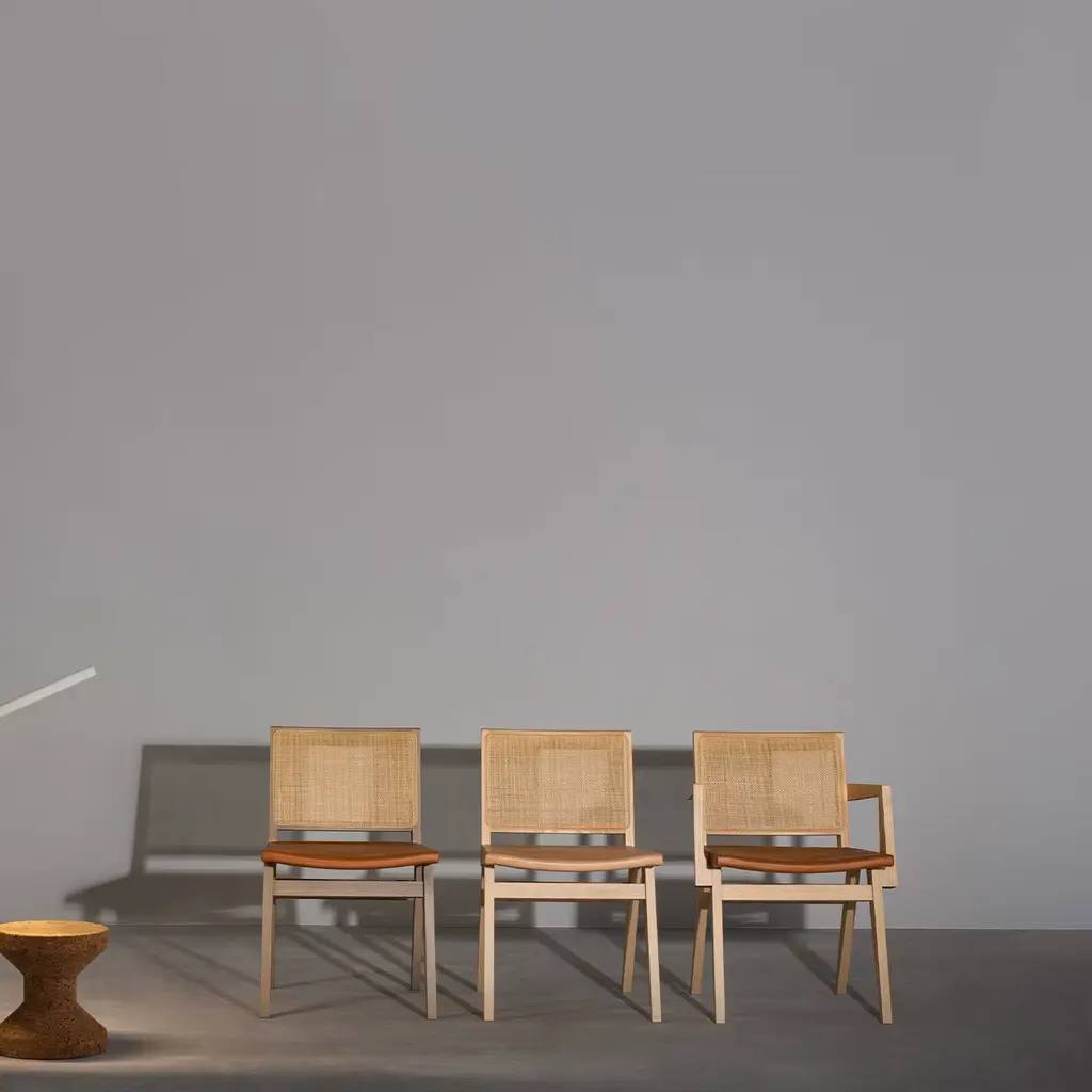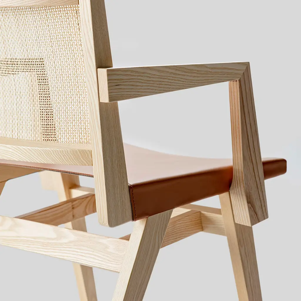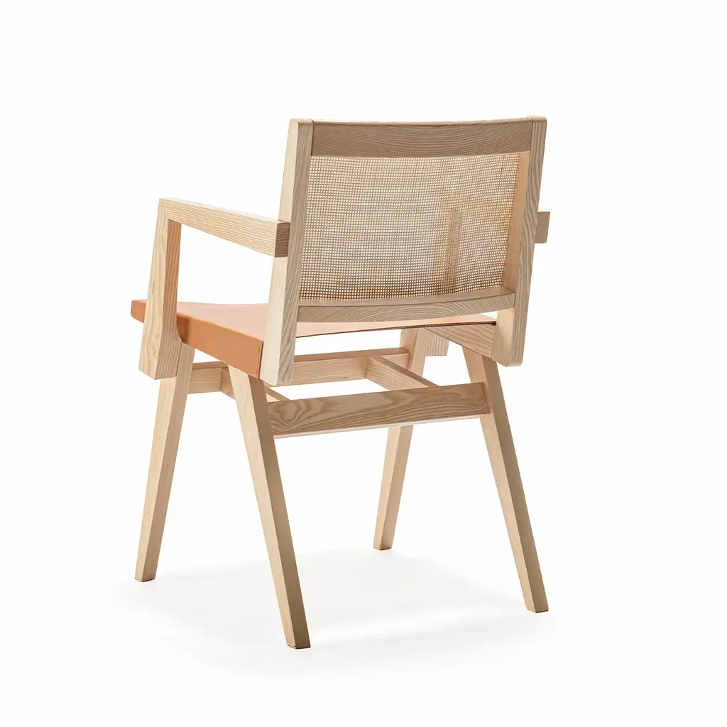 The new Dorothea chair combines a design with an essential character with the iconic rattan weaving of the backrest. The whole family is made up of a chair, armchair and stool made of ash wood with a straw-covered back inside a wooden frame and a seat covered with a double layer of leather. The thickness of the leather, coming from the best Tuscan tanneries, is coupled to the canvas underneath to guarantee an excellent holding to the seat.