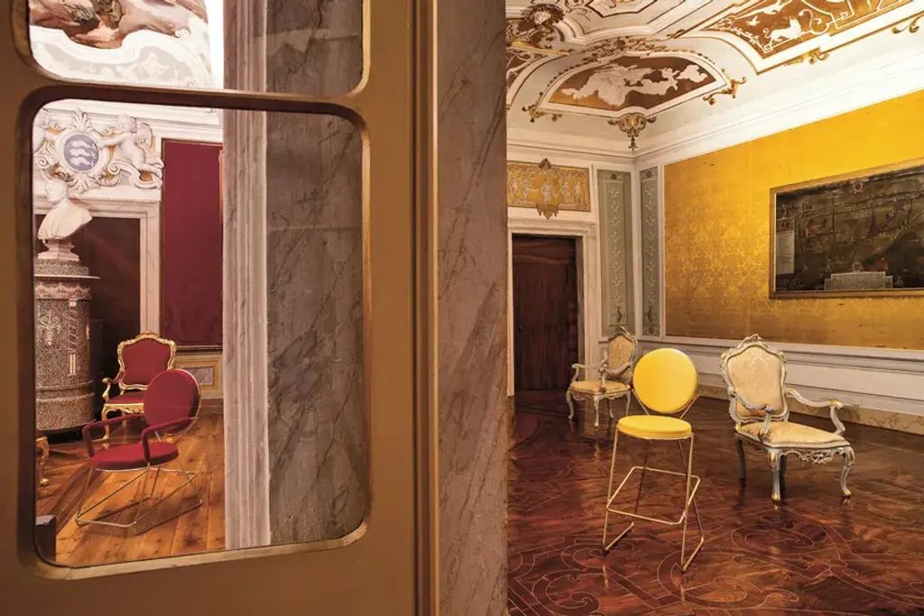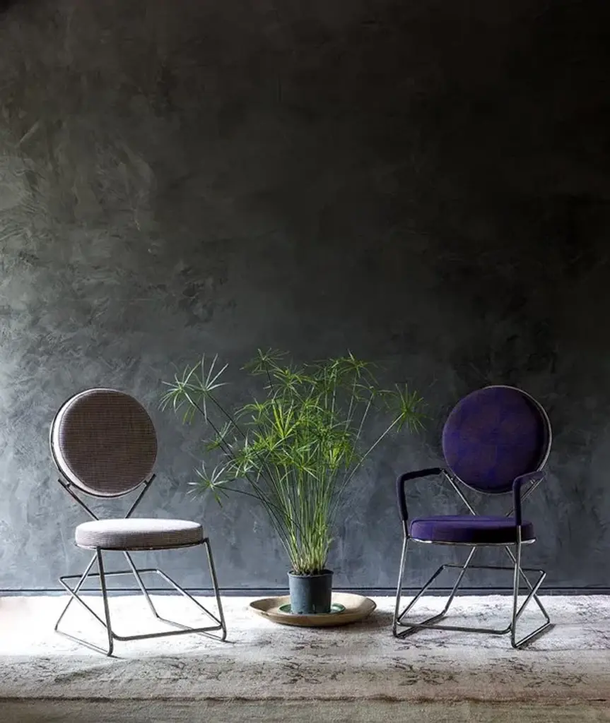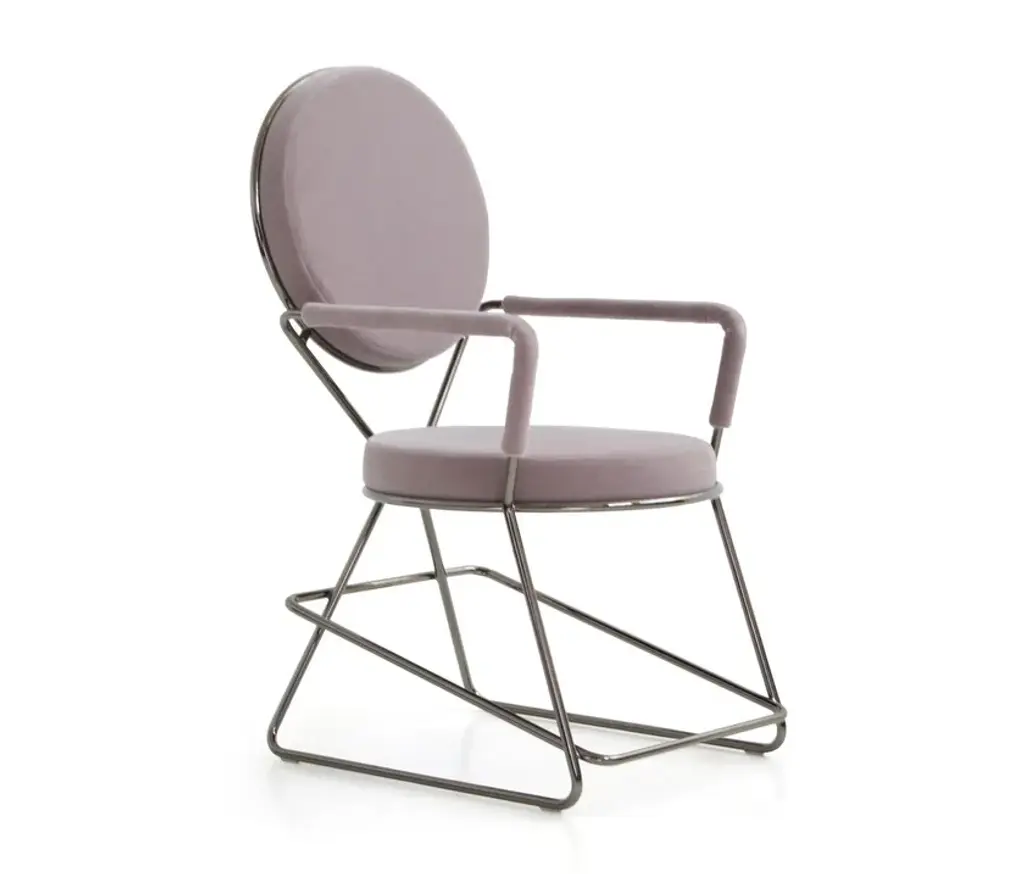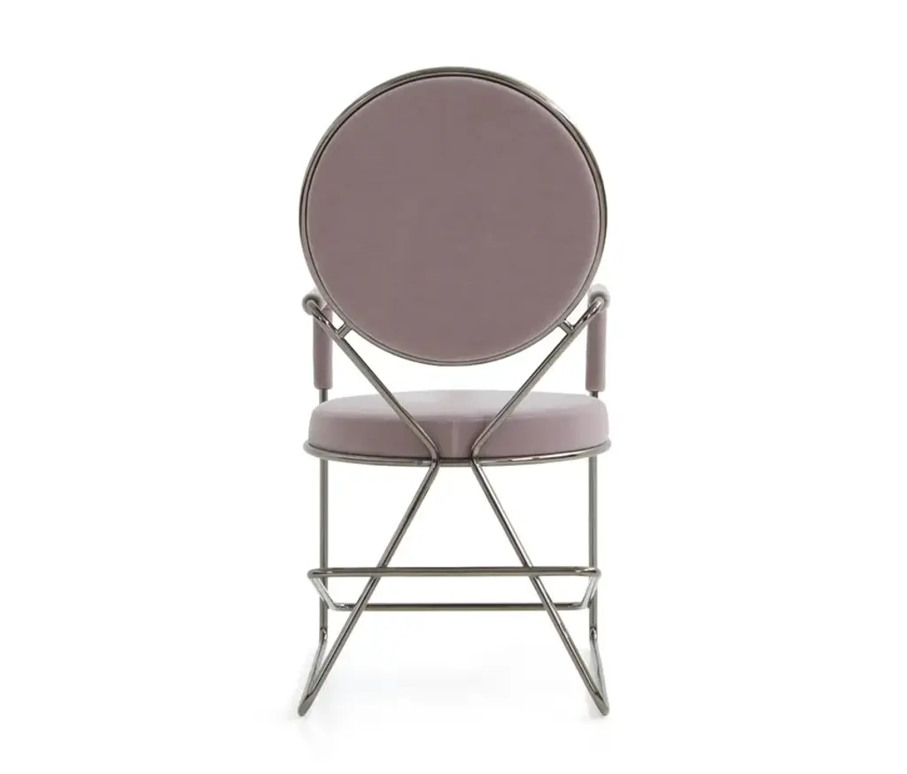 Double Zero has a frame in tubular steel with polished black chrome or gold chrome finish. Seat and back are injected flame-retardant polyurethane foam over plywood panel; on polyethylene glides. Available in fabric or leather.Double collection covers are not removable.Two circles, two elementary modules grafted into a construction geometry of art deco inspiration, openly communicate the tendency towards maximum formal simplification. This is the prelude to top-quality industrial production, an elegant economy of volumes expressed by the possibility offered by the chromed steel frame to structure the design into a complete seating family. Thus a chair and a stool are born, with and without armrests, with the addition of a small two-seater sofa, a sophisticated formal evolution dictated by good taste and class. This is a return to order, a transition towards a simultaneously luxurious and synthetic language.