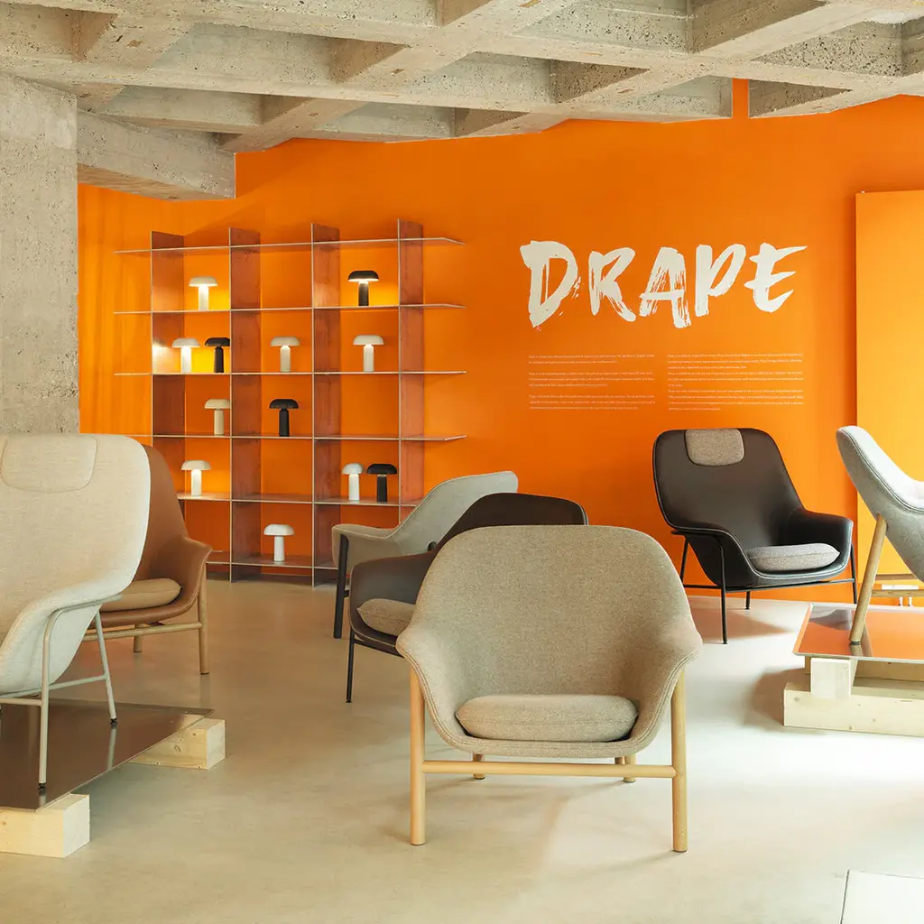 Drape is a lounge chair collection characterized by its sharp precision and soft curves. The upholstery is “draped" around the chair giving an elegant and organic outline, inviting you to take a well-deserved rest.Drape is available in our wide selection of upholstery and can be altered with two different base variations. The steel base has a light and slim silhouette giving a sleeker and more modern look, while the solid oak legs add a warm and artisanal touch to the design.Drape also offers additional customization than any other product in the extensive Normann Copenhagen collection. With piping following the desired upholstery chosen for the seat, Drape can be modified down to the smallest detail. Make a bold statement and choose contrasting piping and seat cover to add a personal touch or adorn the lounge chair in the same upholstery to create a coherent visual expression.