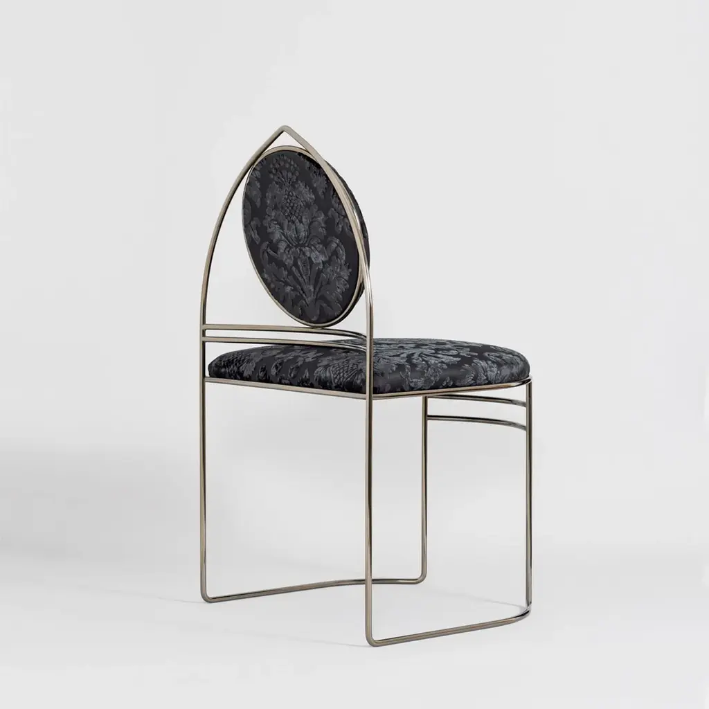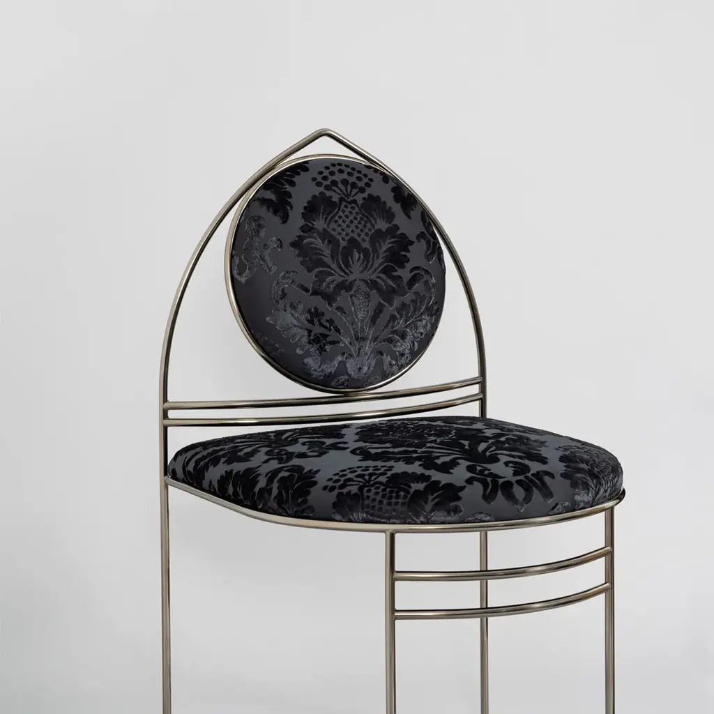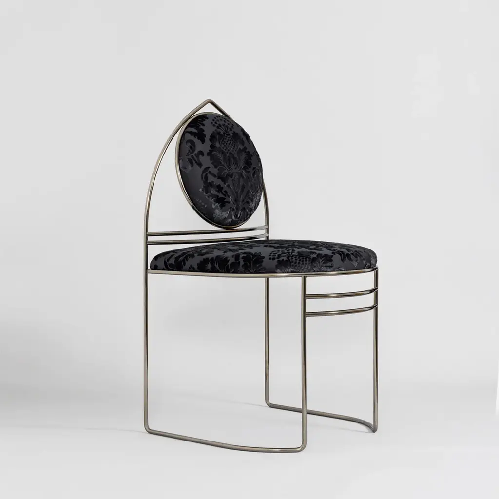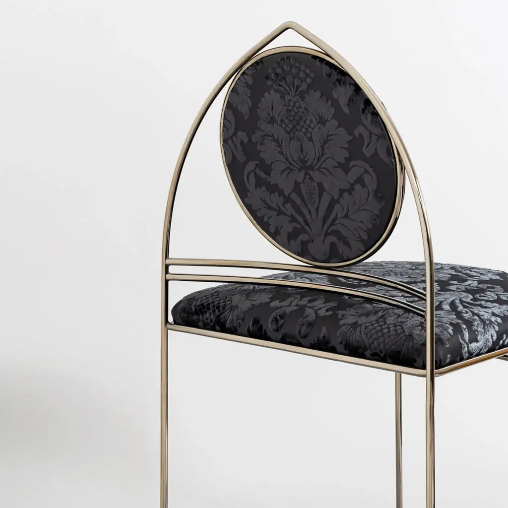 In the Ducal Collection, Enrico Girotti pays homage to the city of Venice by reinterpreting elements of Venetian Gothic. A palingenetic journey that fuses design and craftsmanship through metal and textiles. Ducale-ST Black features a Gothic arched back with a circular backrest supported by double curved elements. The chair is made of solid shaped steel with an open front. Customizable, it comes with a certificate of authenticity. Please, contact the Concierge for more information.