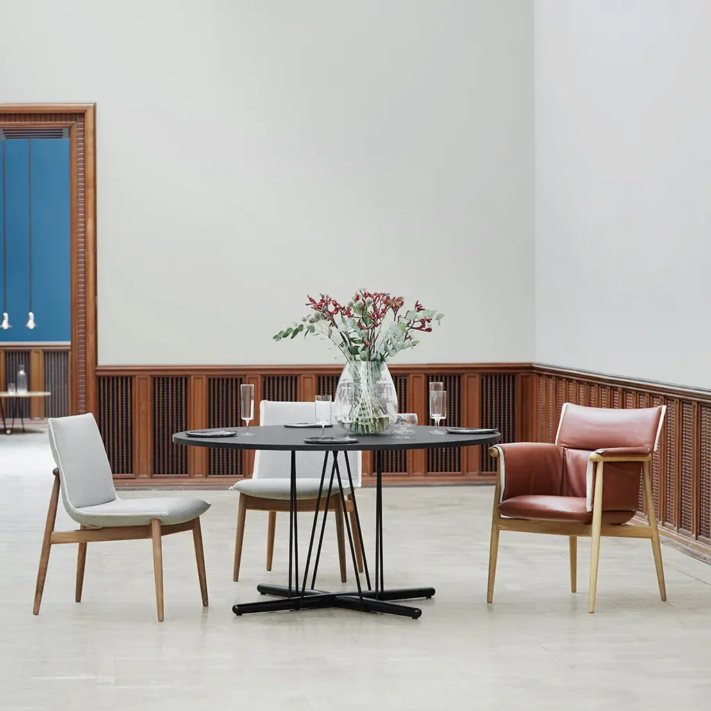 The Embrace Chair is a 2019 addition to the Embrace Series by Austrian design trio EOOS. Visually light in its expression, the chair has no armrests and will take up less space, fitting with any table. The design allows for great freedom of movement, a quality that enables users to communicate and interact freely. The upholstery is folded in two dimensions and the relaxed air of the upholstery contrasts the perfectly shaped wooden frame. It is a testimony to the unity between the craftsmanship and heritage of Carl Hansen & Son and the innovative design approach of EOOS.