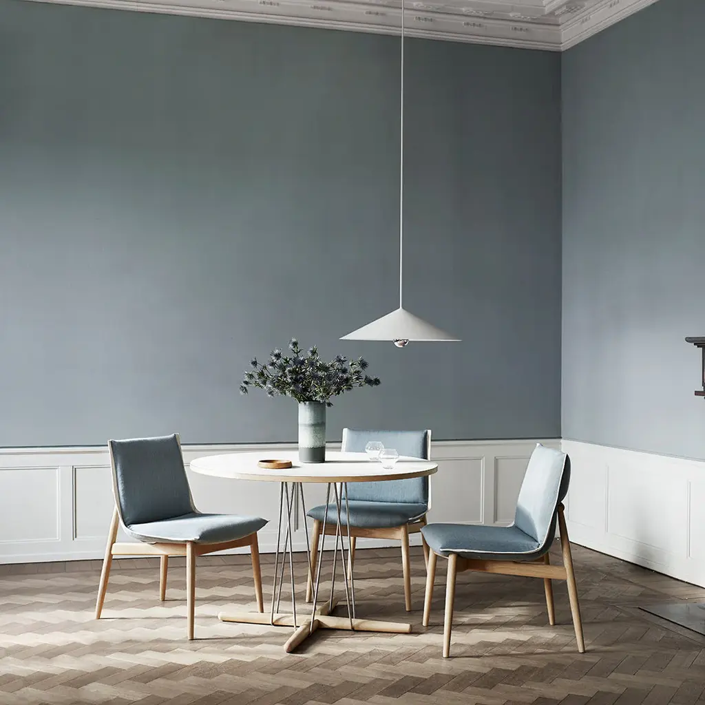 The Embrace Chair is a 2019 addition to the Embrace Series by Austrian design trio EOOS. Visually light in its expression, the chair has no armrests and will take up less space, fitting with any table. The design allows for great freedom of movement, a quality that enables users to communicate and interact freely. The upholstery is folded in two dimensions and the relaxed air of the upholstery contrasts the perfectly shaped wooden frame. It is a testimony to the unity between the craftsmanship and heritage of Carl Hansen & Son and the innovative design approach of EOOS.