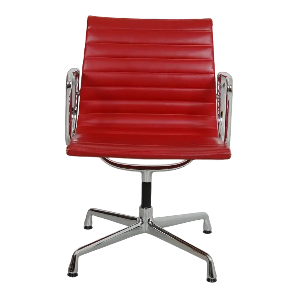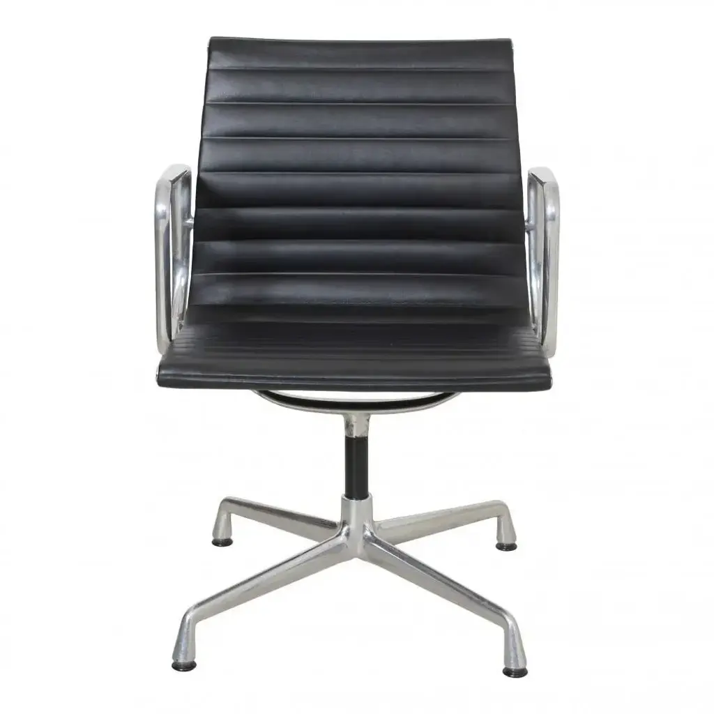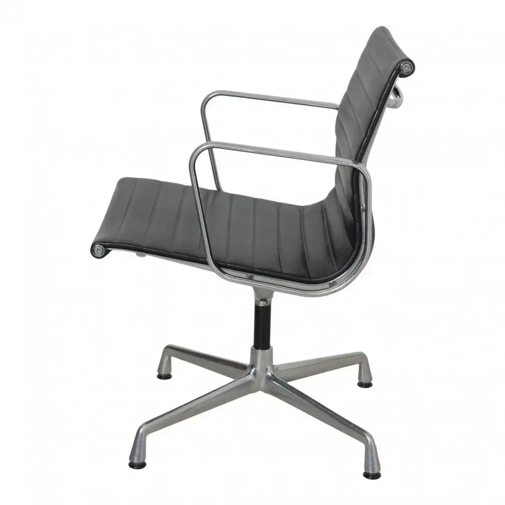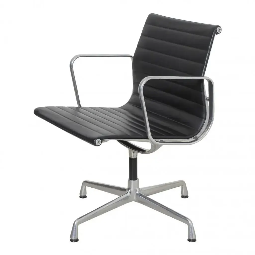 Designer: charles eames. Manufacturer: vitra. Model: ea-108. Measurements: h: 83 x w: 52,5 x d: 59 x arm height: 67,5 x sh: 42,5 cm. Materials: black leather, aluminium armrests, frame and chrome ring. Functions: swivel stand. Condition: nice patina and minor wear. This piece has an attribution mark, i am sure that it is completely authentic and take full responsibility for any authenticity issues arising from misattribution