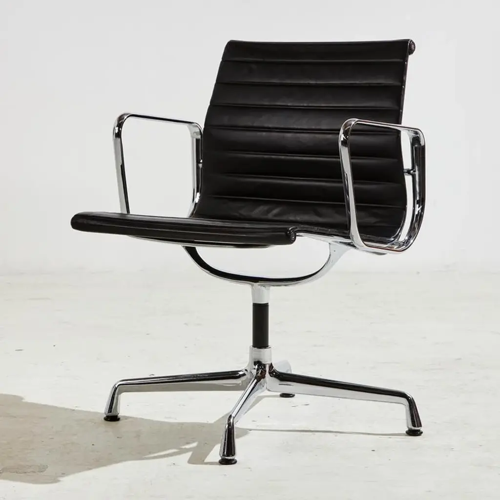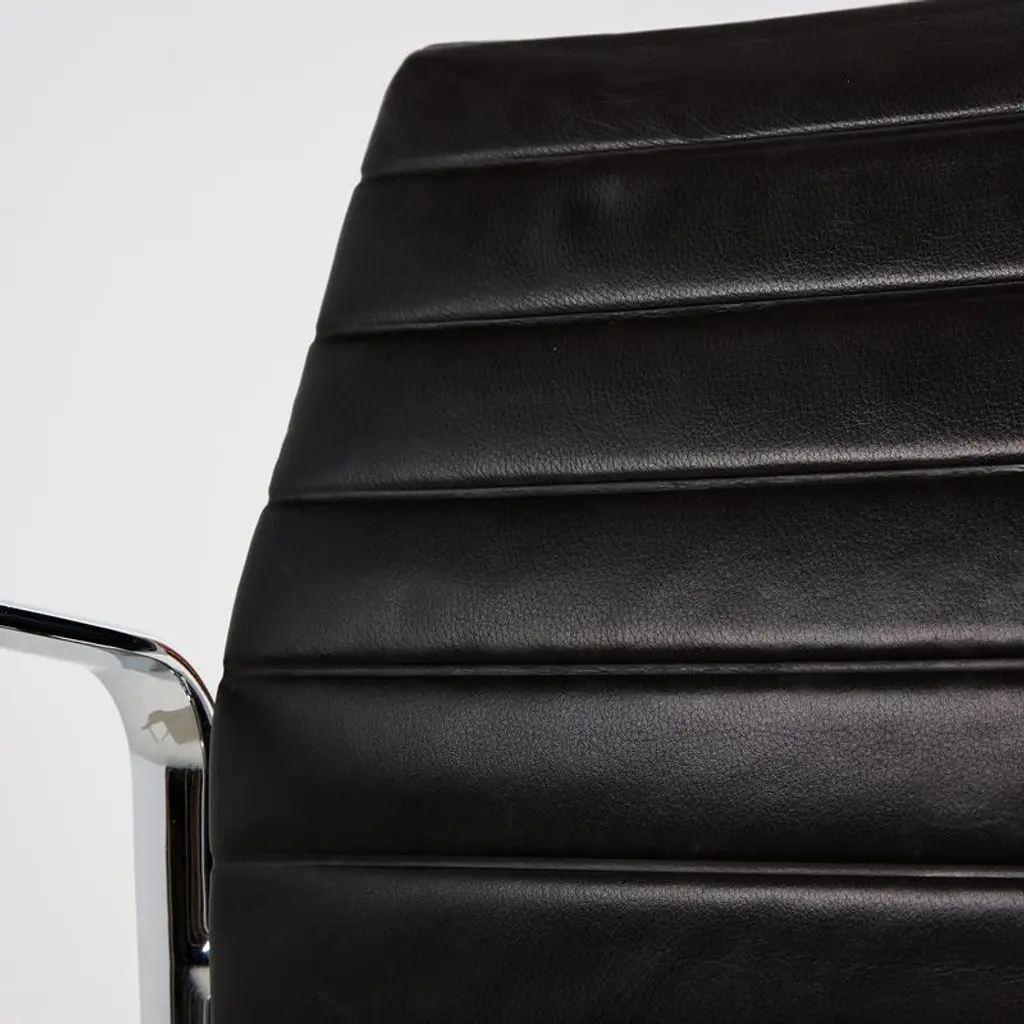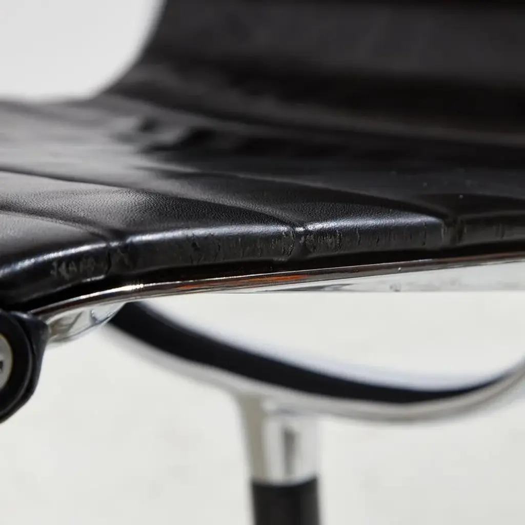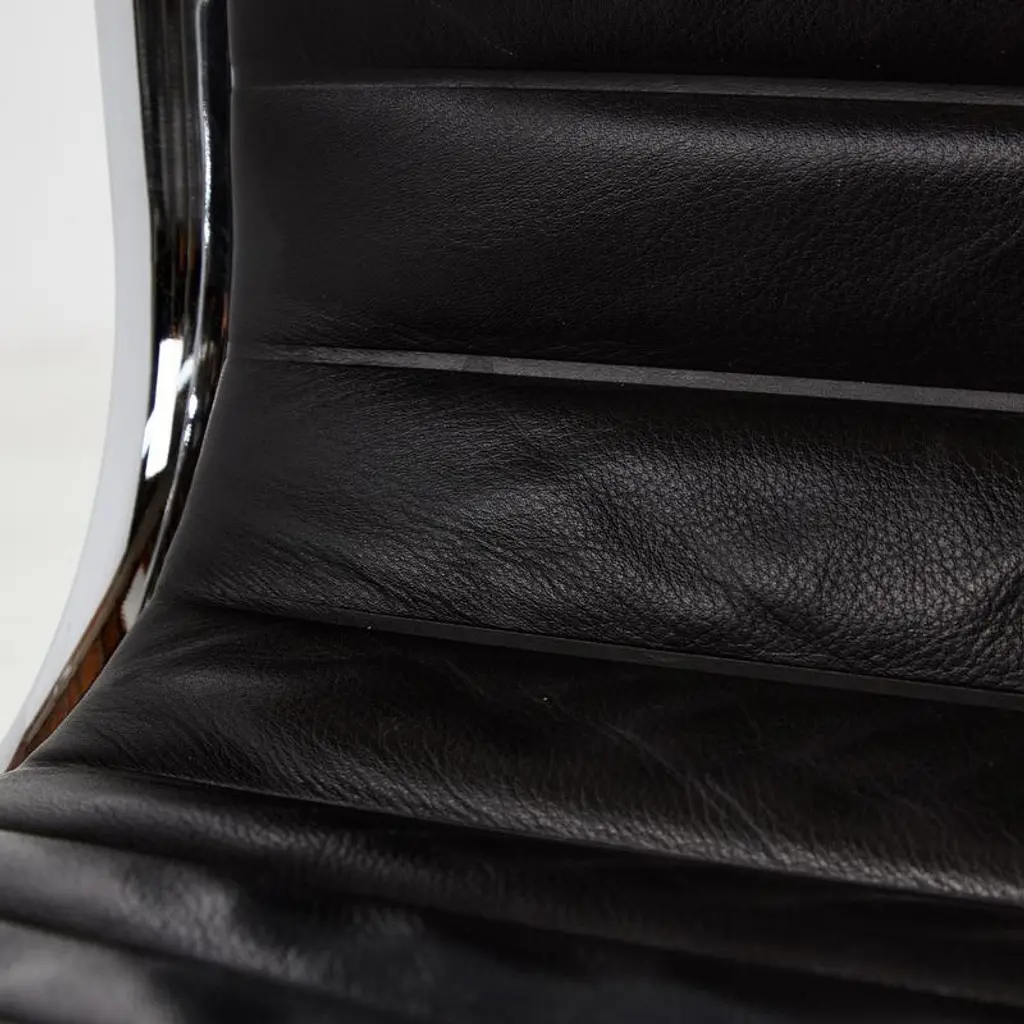 Iconic ‘EA108’ office swivel armchair from the 1950s designed by Charles & Ray Eames and produced by Vitra. Ergonomical leather seat and backrest on chromed steel base. with some surface scratches, stains and wear on the leather and steel parts.