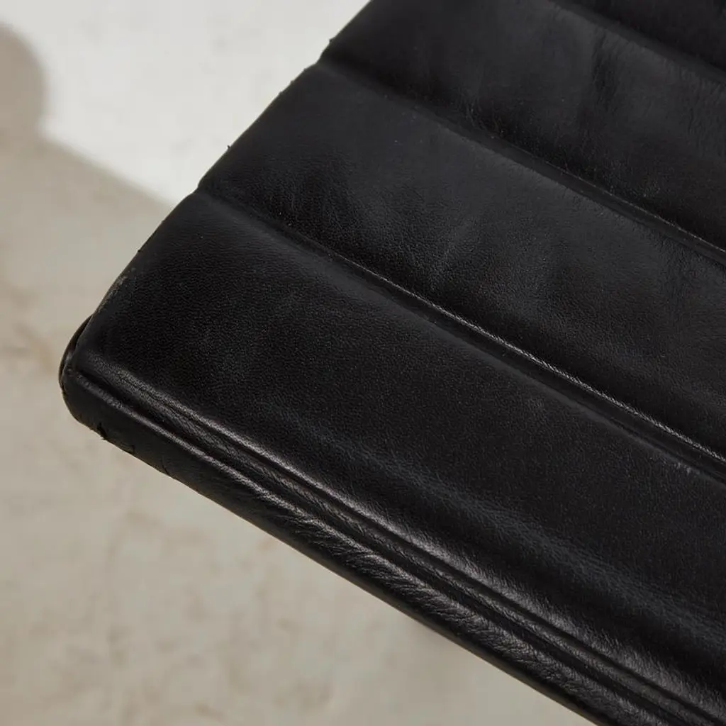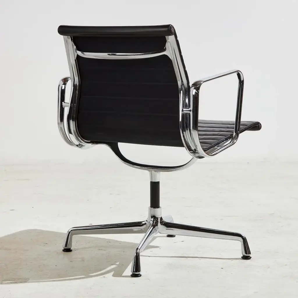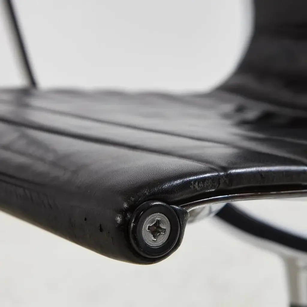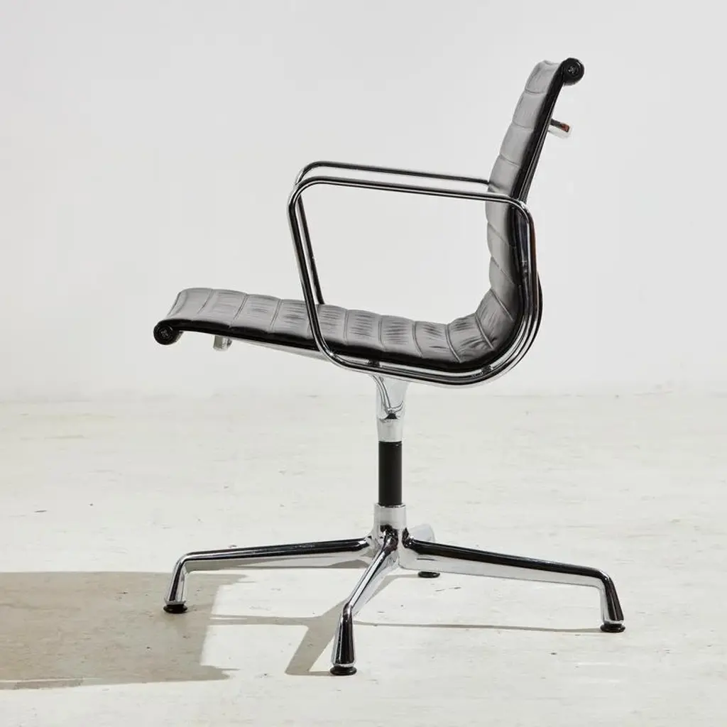 Iconic ‘EA108’ office swivel armchair from the 1950s designed by Charles & Ray Eames and produced by Vitra. Ergonomical leather seat and backrest on chromed steel base. with some surface scratches, stains and wear on the leather and steel parts.
