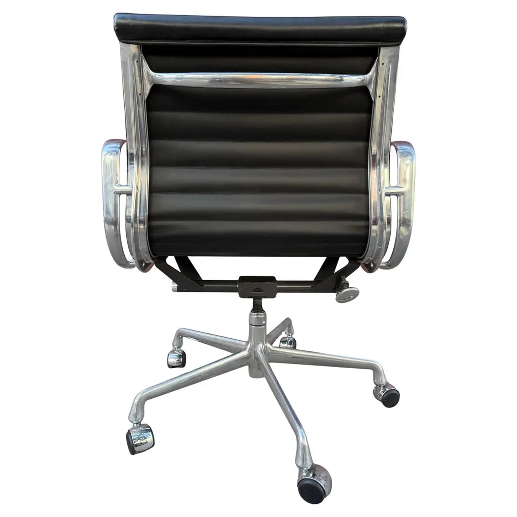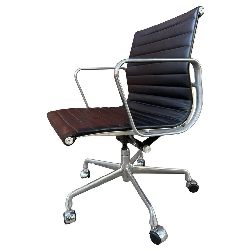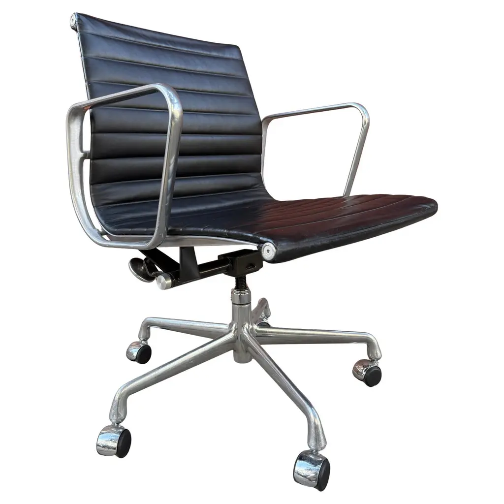 Eames Aluminum Group chairs in black leather designed by Eames for Herman Miller. All in very good original condition showing very minimal wear to arm that we can polish out if requested. With manual tilt and height adjustment. Arm Height 24.5 - 27.5'' Height (in): 34 Height Min (in): 31.25 Width (in): 23 Depth (in): 23 Seat Height (in): 19.75 Seat Height Min (in): 17 Seat Depth (in): 18 Weight Capacity (lbs): 300 Arm Height Max (in): 27.5Ask for custom shipping quote.
