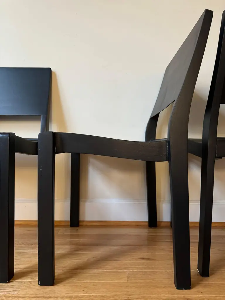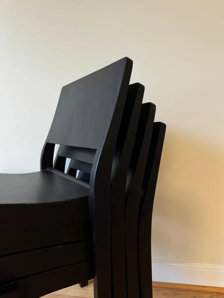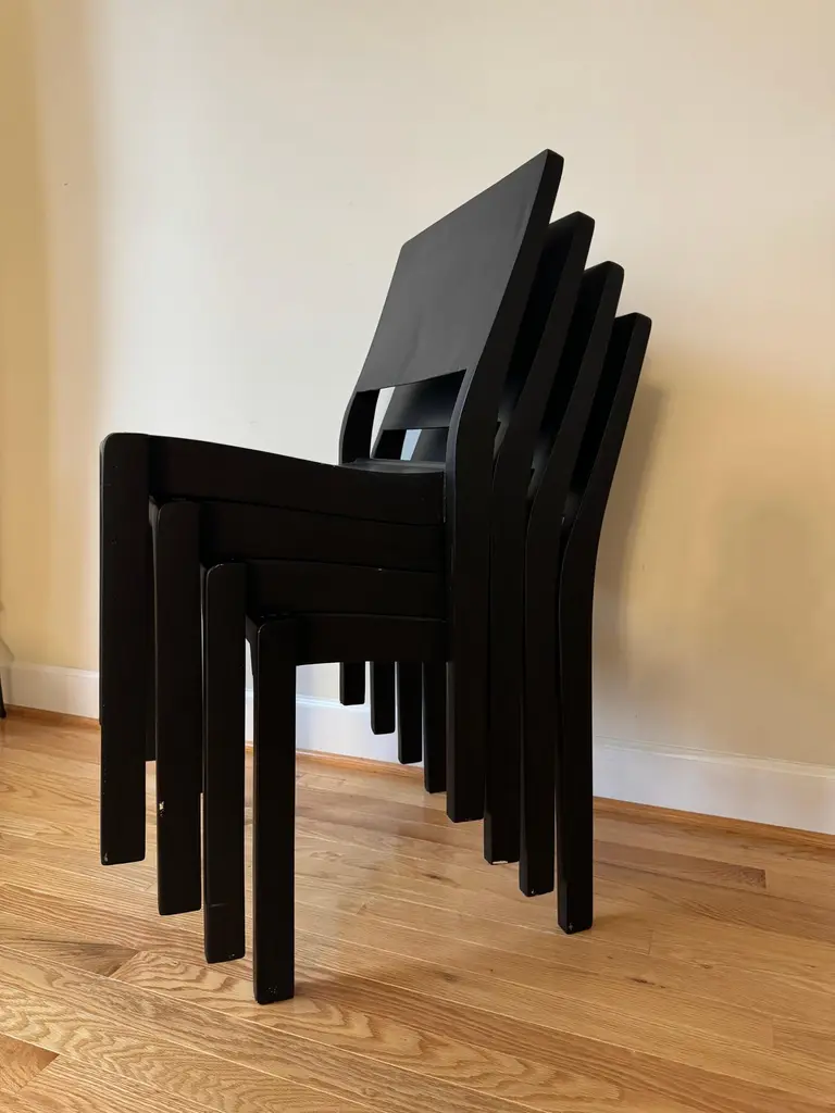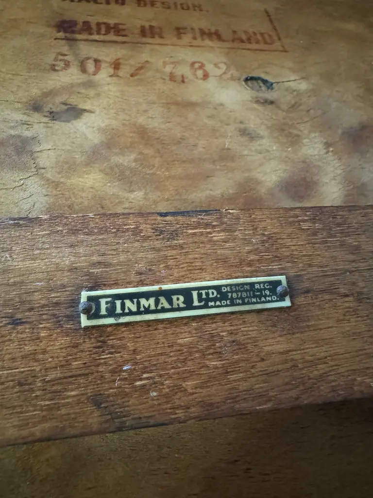 Chair 11 (with Finmar label)Designer: Alvar AaltoYear: 1929One of Alvar Aalto’s first modern furniture designs.“Advertised as the ‘auditorium chair bar none’, the so-called row chair was created in 1929 through the cooperation of master carpenter Otto Korhonen and Alvar Aalto. This stacking auditorium chair is ideally suited as furniture in public spaces. It is known to have been used for this purpose for the first time in the Jyväskylä Defence Corps Building (Alvar Aalto 1926-29).”Description from Alvar Aalto Foundation Finmar Ltd.- Finmar Ltd., a wholesale firm, was one of the major importers of Scandinavian furniture to the UK in the period 1934-65.- Finmar had imported Alvar Aalto’s plywood furniture from Finland before the war (World War II, 1939).Information from a journal article “Scandinavian Furniture in Britain: Finmar and the UK Market, 1949-1952”The chairs have been collected from the same place, which means they are a set. 4 chairs available. Price PER chair. Repainted at some point. See the images for the Finmar tag condition:1 chair has 1930's Artek Stamp(AALTO DESIGN - MADE IN FINLAND) and perfect Finmar tag1 chair has Finmar tag with some repaint residue on it. 1 chair has Finmar tag with some repaint residue and hard to read, but still see "AR" from FINMAR1 chair missing the Finmar tag, but has two nails for holding the tag. If you want a specific model from above, please contact me before placing an order