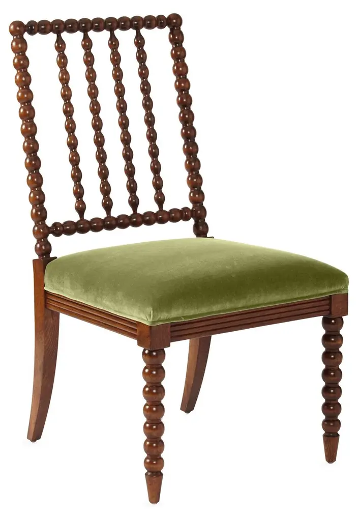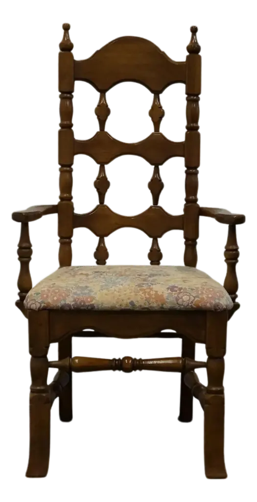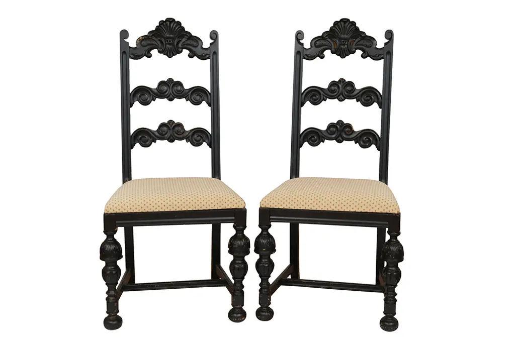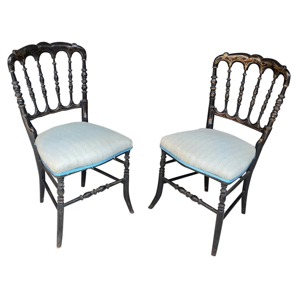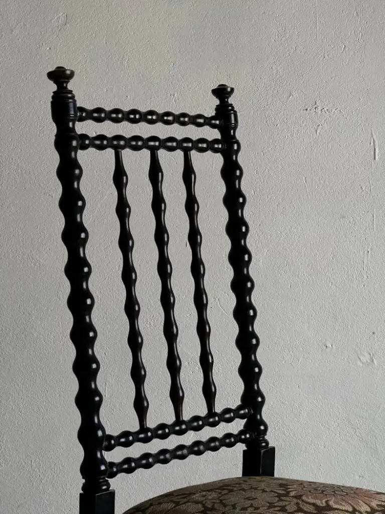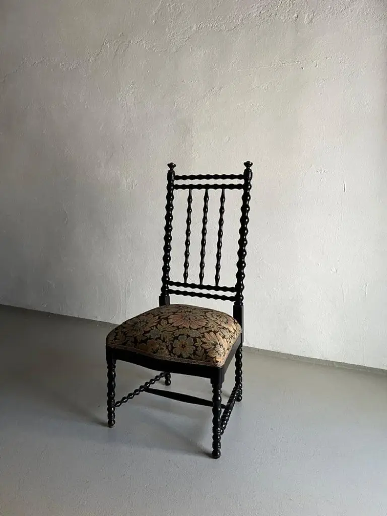 French nursery chair with ebonized oak bobbin frame and beautiful tapestry upholstery with floral design. I have 3 similar chairs in stock.Additional information:Country of manufacture: FrancePeriod: 1850sDimensions: 46 W x 46 D x 105 H cmSeat: 43 H cmCondition: Good vintage condition according to its age - fully functional, but the backs are not so strong in comparison with modern chairs.