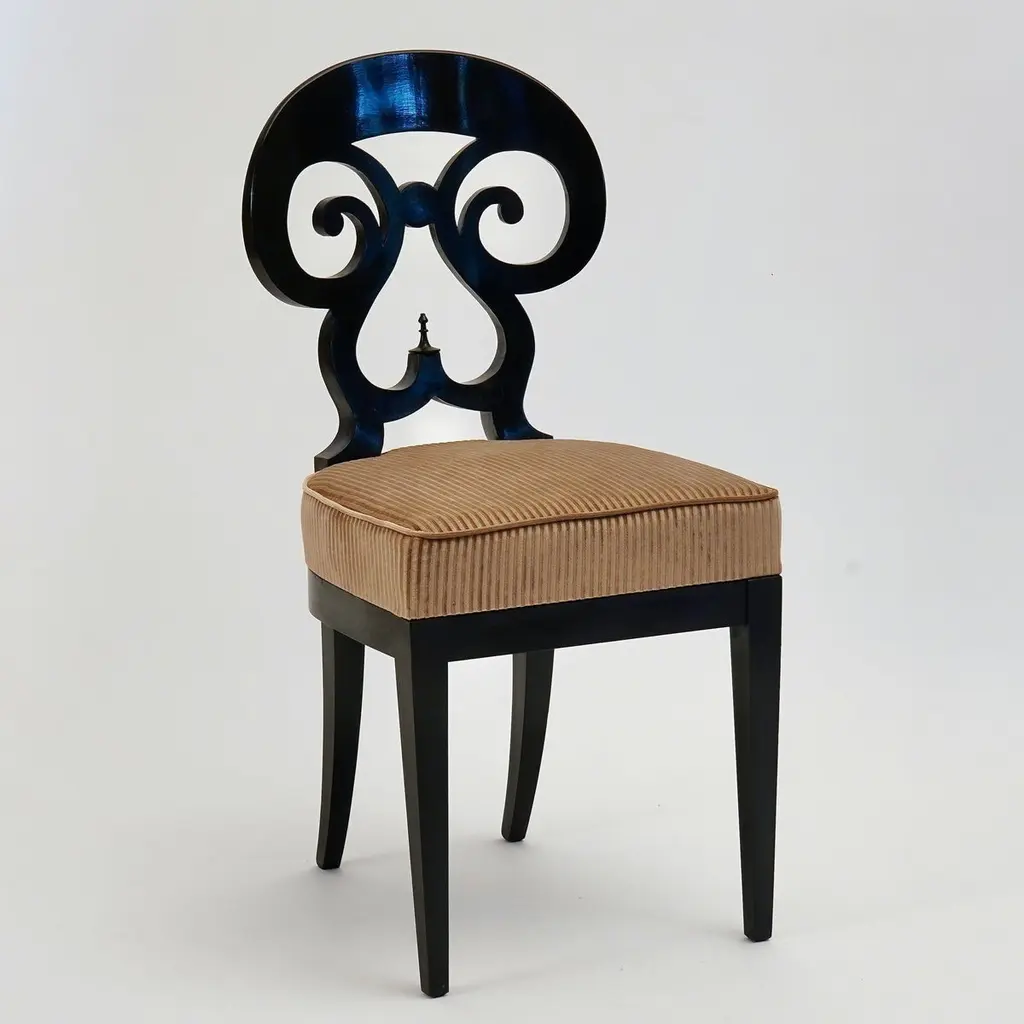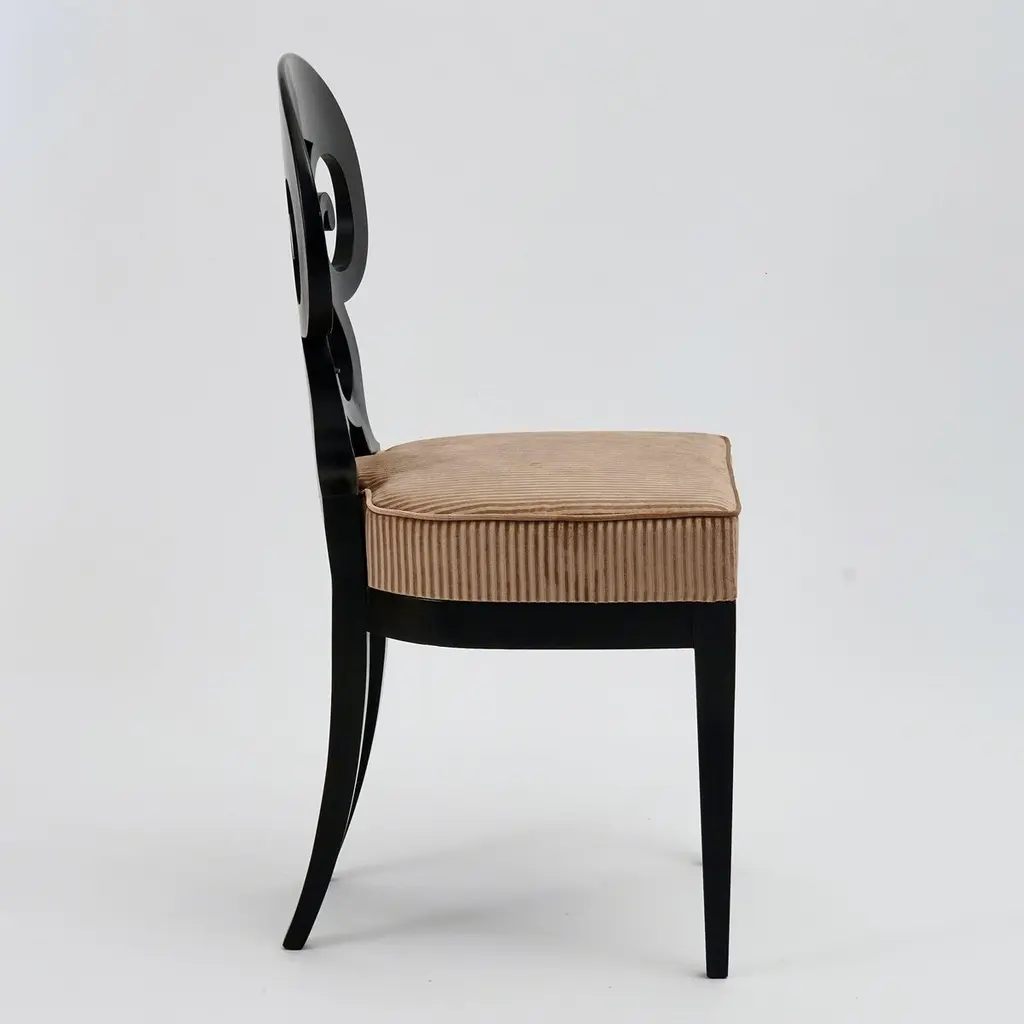 The Eclectica collection is a group of Biedermeier chairs.This listing offers the model Maria-Theresia.The chairs are made from precious solid Italian walnut wood.; The ebonized finish is attained by stained black and finished with shellac applied by hand using the French polish method for a warm, smooth and glossy finish.Boxed seat, padded with a firm T35 foam base and a softer top layer for comfort. The seat is finished with neat piping and upholstered in a corduroy-style velvet from Alessandro Bini, matched with plain velvet in the same color for the piping. Shown here in a warm coffee tone, the fabric creates a beautiful contrast with the ebonized wood frame.Biedermeier has a growing success. It was an early approach to modern furniture. It was the first style to prioritize comfort through curved forms and lumbar support, rather than just thick padding. These chairs feel more modern than earlier styles like Louis XVI or Empire. For this reason the name was read between the lines "not named after a king" like any furniture style before.It represented a fresh, modern approach embraced by a new wealthy class outside the aristocracy — like calling a chair "Mr. So-and-So" to make clear that this style didn’t come from royal courts, but from the new mansions and emerging design culture of the time. Unlike earlier styles shaped for palaces like Versailles and adopted by nobles, Biedermeier design began in private mansions and reflected a individual, forward-thinking way of living. This explain the modernity and its appeal on contemporary interior design.Transportation is not possible to prequote as depends on many factors. When inquiry please help me getting you the right cost.1) Number of chairs2) Zip code3) If sent to private home or to a receiver4) Anything I should know about delivery (urban area, residential area, elevator and so on)Please understand cost of transportation is an important factor on chairs as they use space, it might be a significative percentage of the chair's value. Transportation will be made with Tramo ocean shipment so even delivery timing will be long. White glove and debris removal option is possible depending on the area.For trade customers best transportation pricing will be if delivered to Tramo's warehouses (NJ, FL and CA) and followed by your appointed mover.
