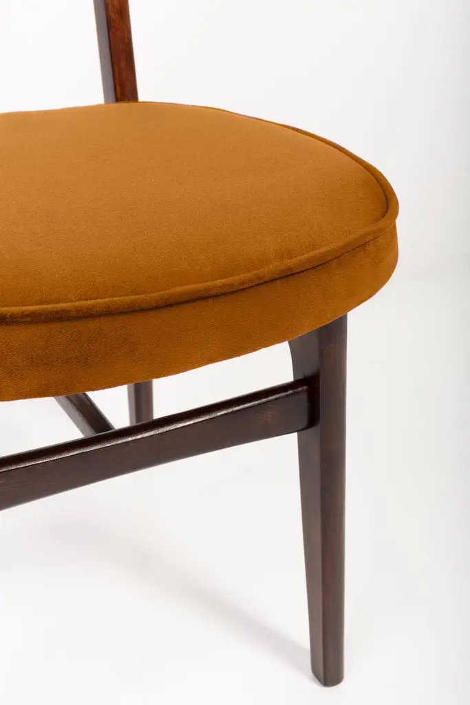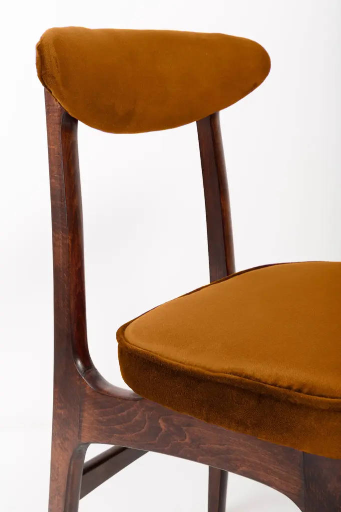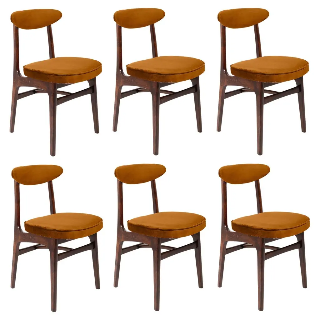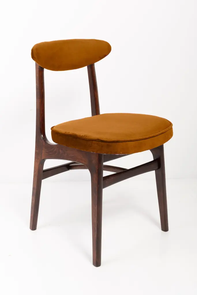 Eight chairs designed by Prof. Rajmund Halas. It has been made of beechwood. Chairs are after undergone a complete upholstery renovation, the woodwork has been refreshed. Seats and backs were dressed in a copper (color 960), durable and pleasant to the touch velvet fabric. The chairs are stabile and very shapely. Chair was produced in former furniture factory in Goleniów in the 1960s. We can prepare also set of two, six or more chairs in other fabric. Check the last picture with velvet colors.