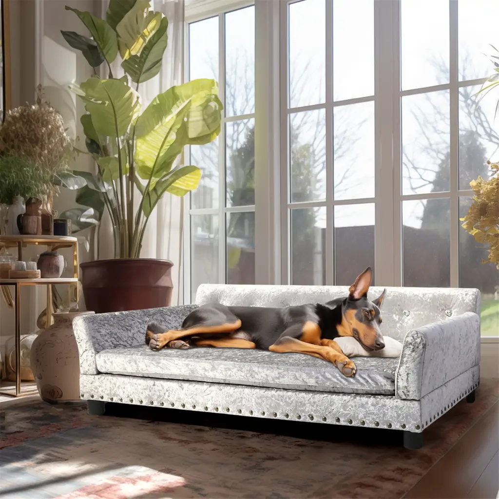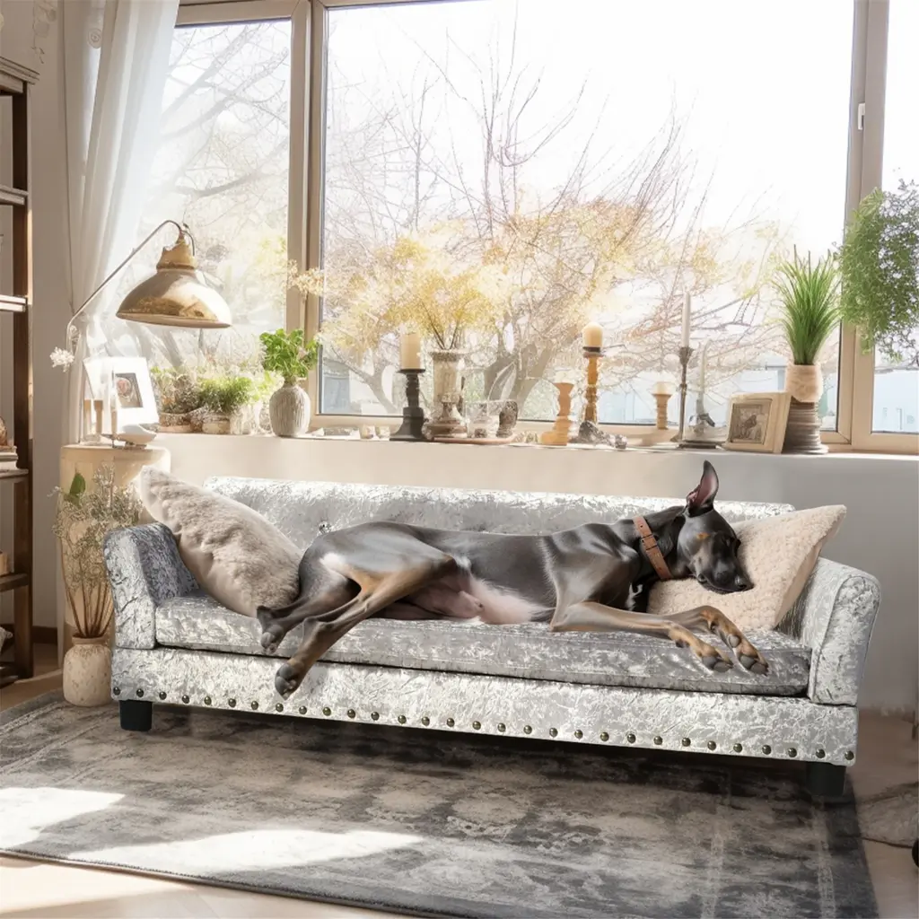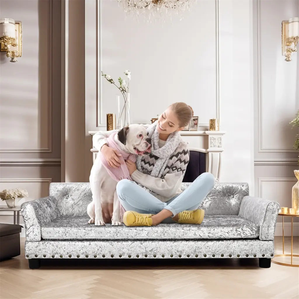 Elevated Pet Dog Bed Silver Velvet Upholstered Pet Sofa Couch Chair - 47.2x29x15.7 Inch