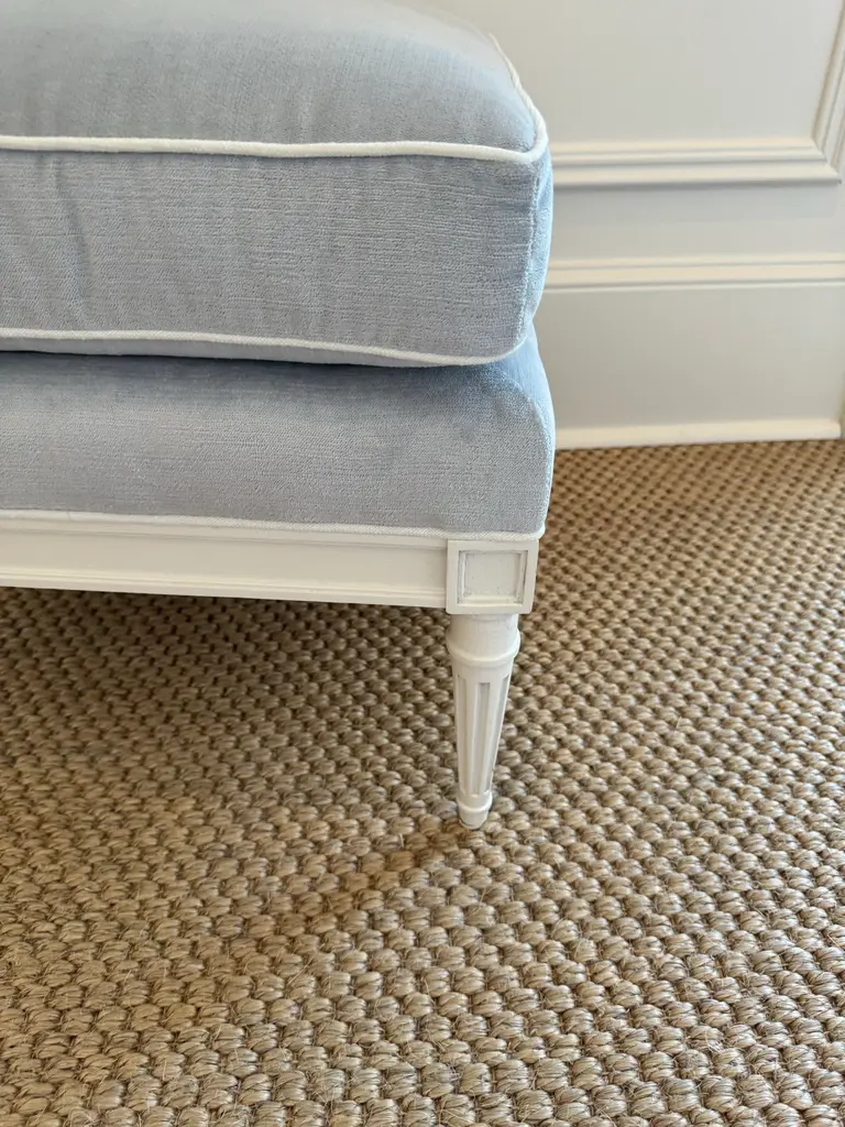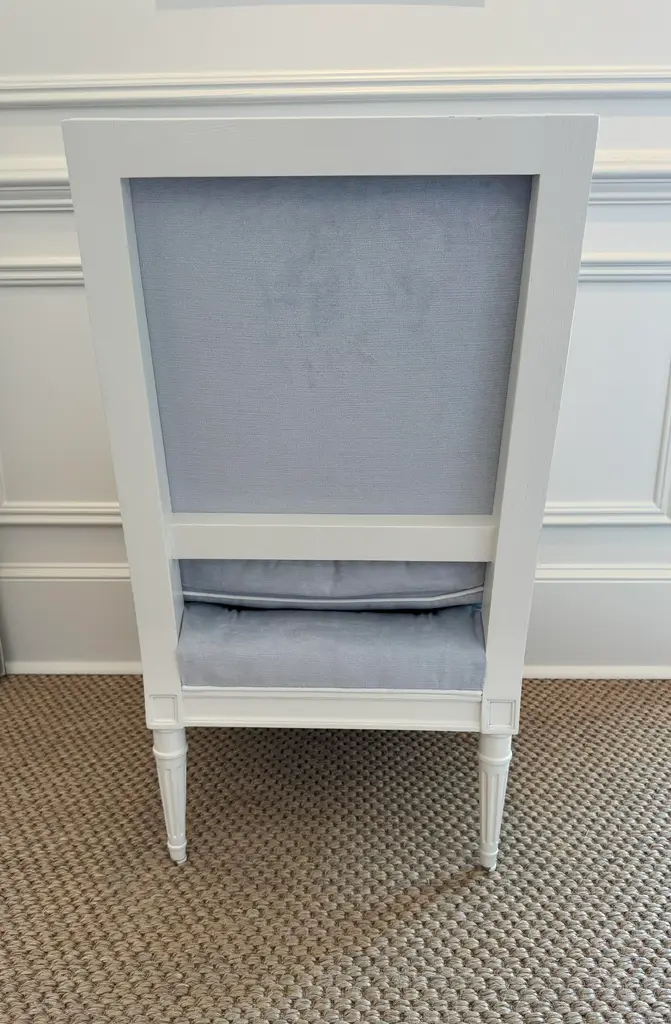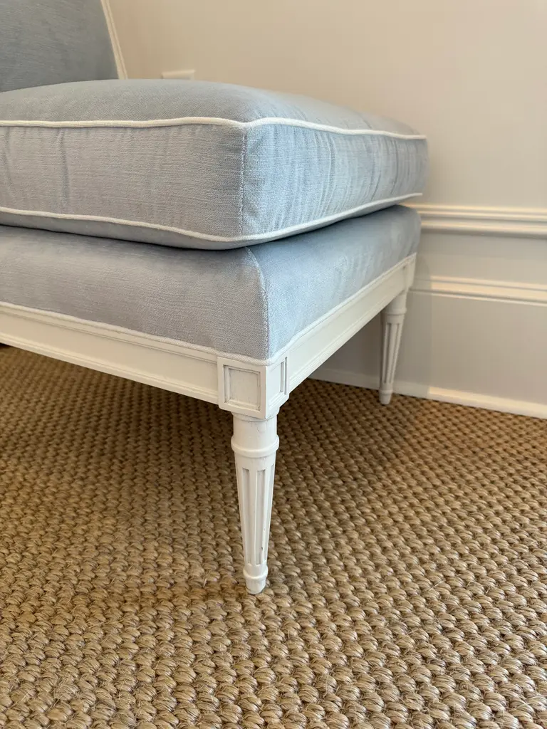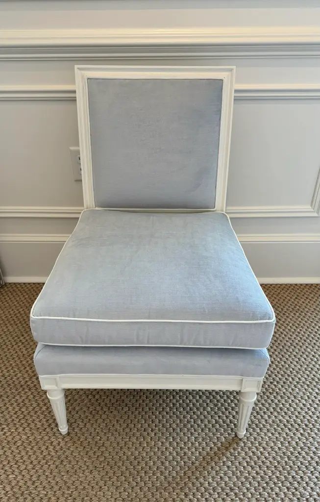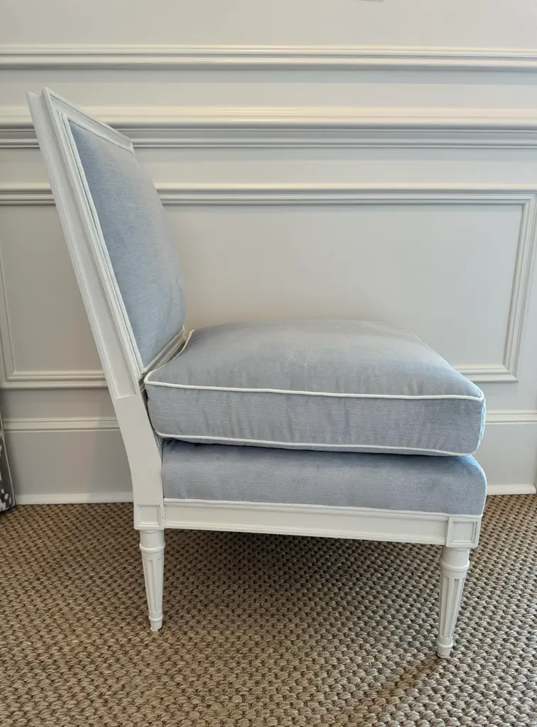 Ella Slipper Chair by Highland House Furniture in beautiful pale blue velvet with white contrast piping. The wood frame and Louis XVI style legs are painted a soft white.