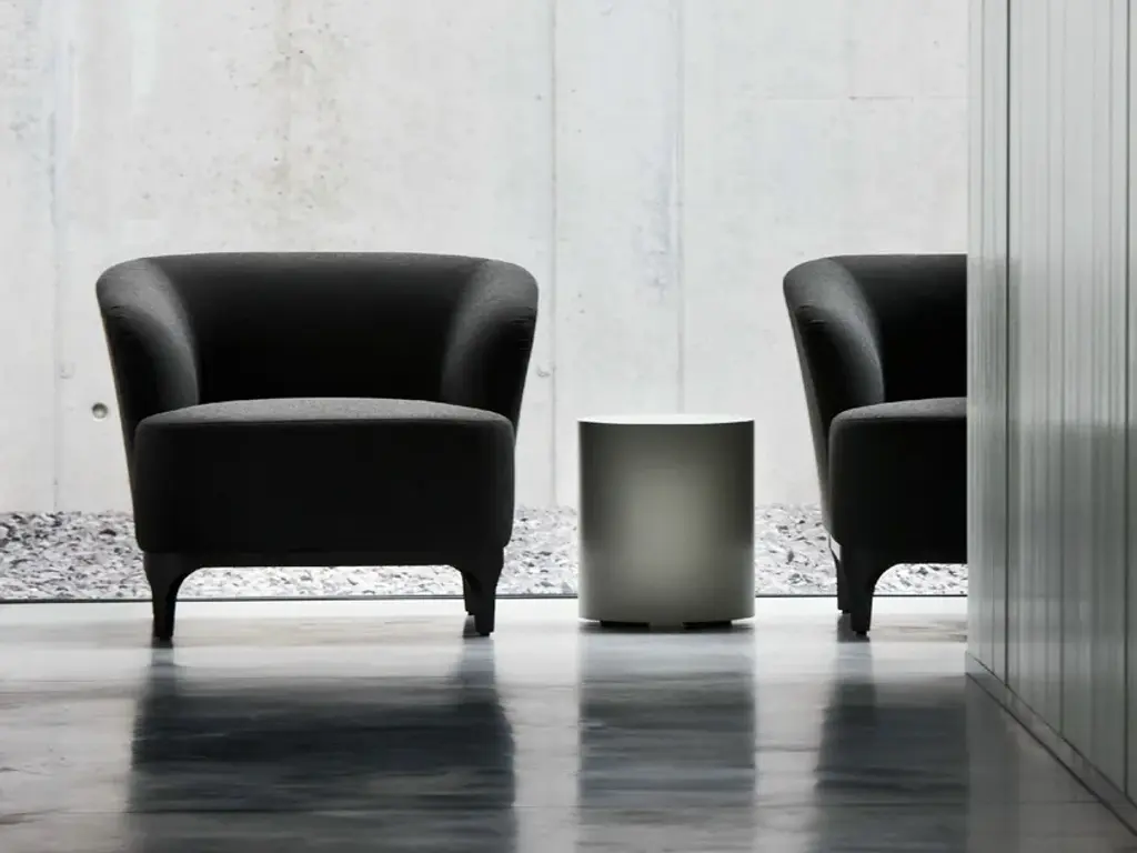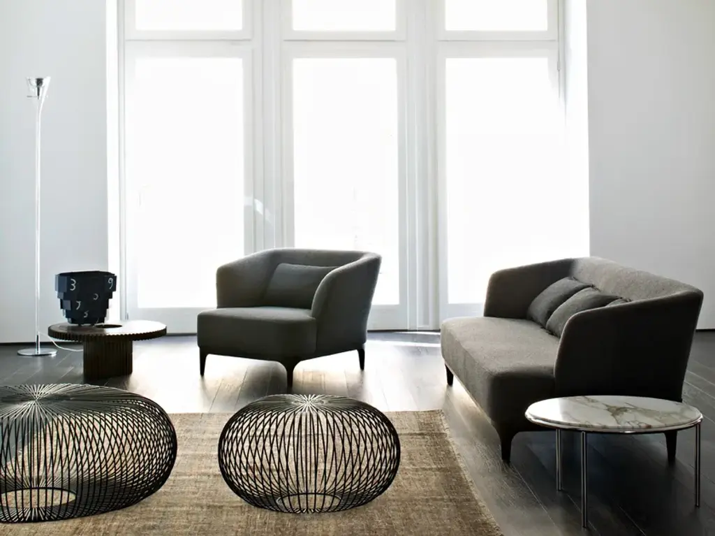 An update of the design introduced in 2011, Elle/P features feet and base in lacquered wood. This bold new version of Elle/P is suitable for any environment. The wood frame is covered with non-deforming, expanded polyurethane of different thicknesses and polyester fibre. Elle is available with fabric or leather upholstery.Beech wood base lacquered black RAL 9005.