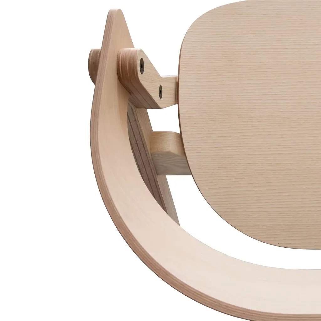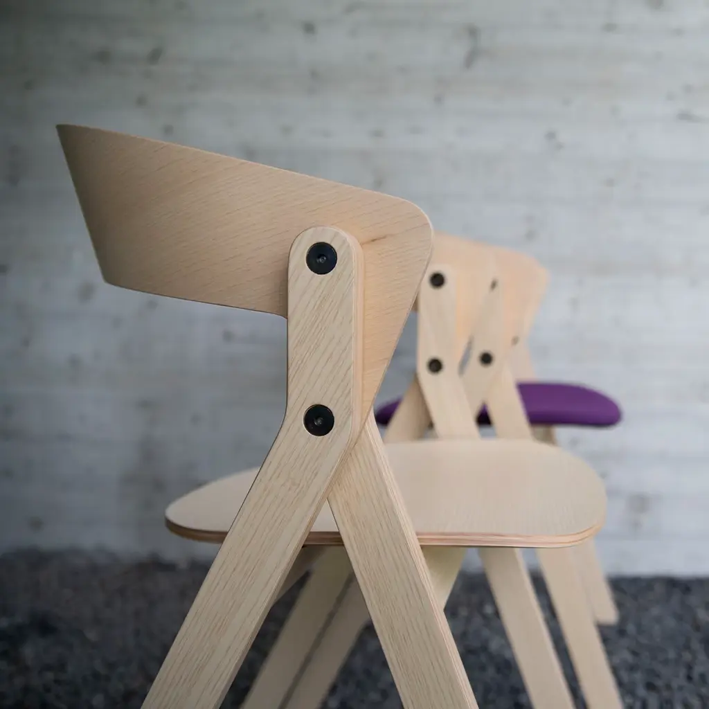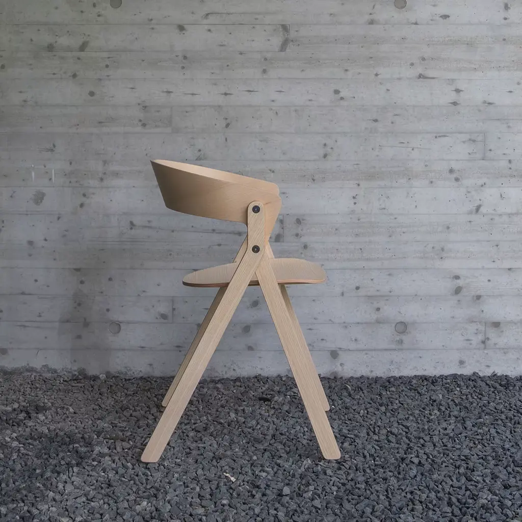 A testament to bold design and precise craftsmanship, this chair transforms the traditional silhouette with its striking A-shaped profile. This innovative piece integrates the backrest seamlessly with the leg structure, balancing unique geometry with functionality. Made from formaldehyde-free, veneered ash plywood, it offers both sustainability and a contemporary edge. The natural ash finish highlights its modern elegance, making it a captivating addition to any setting.