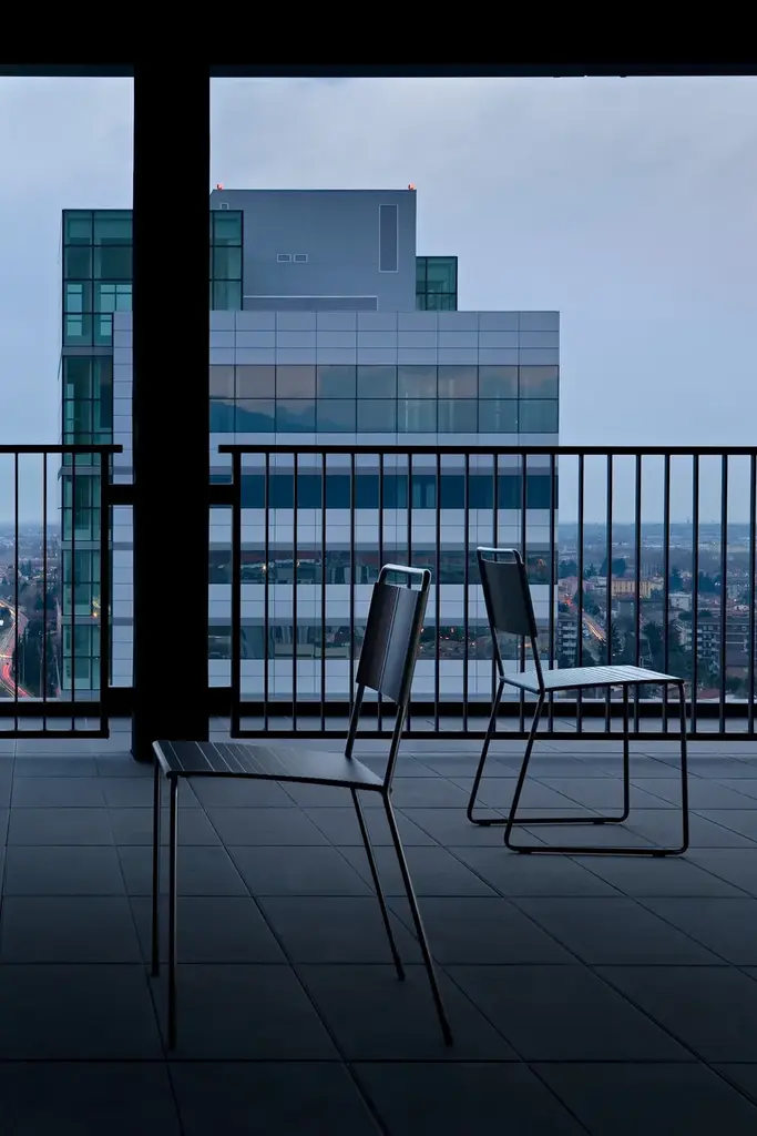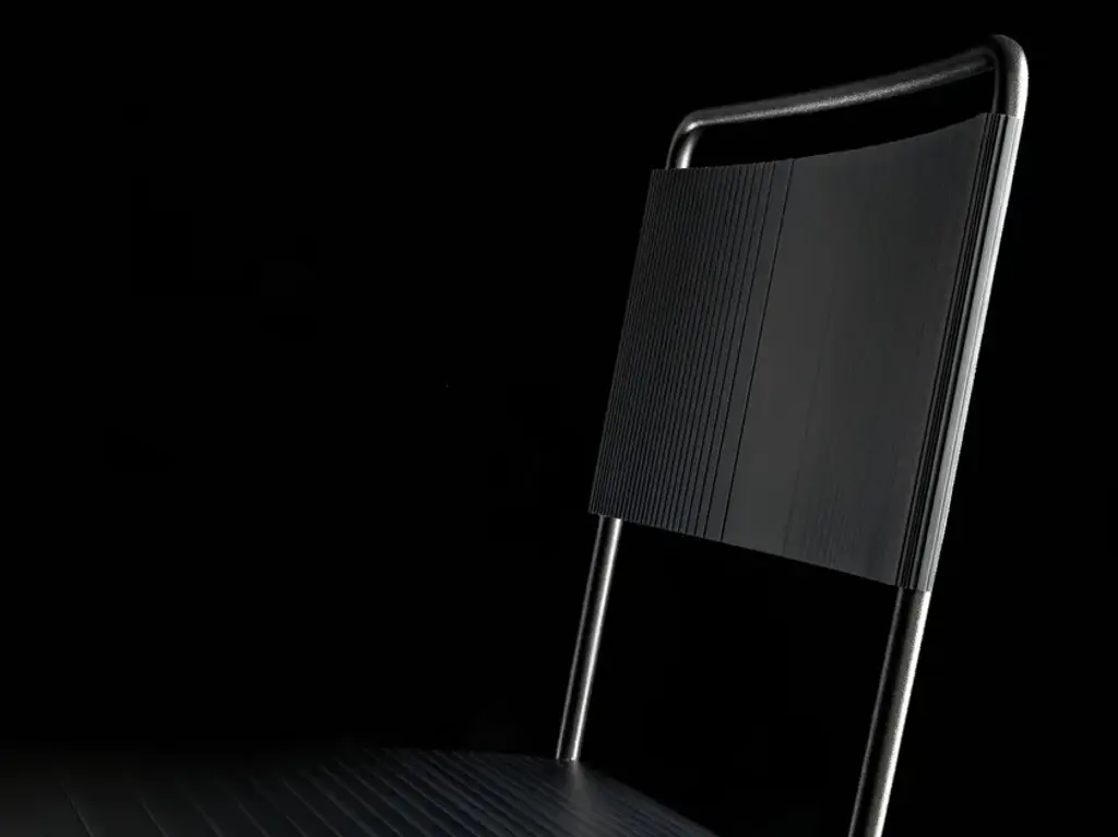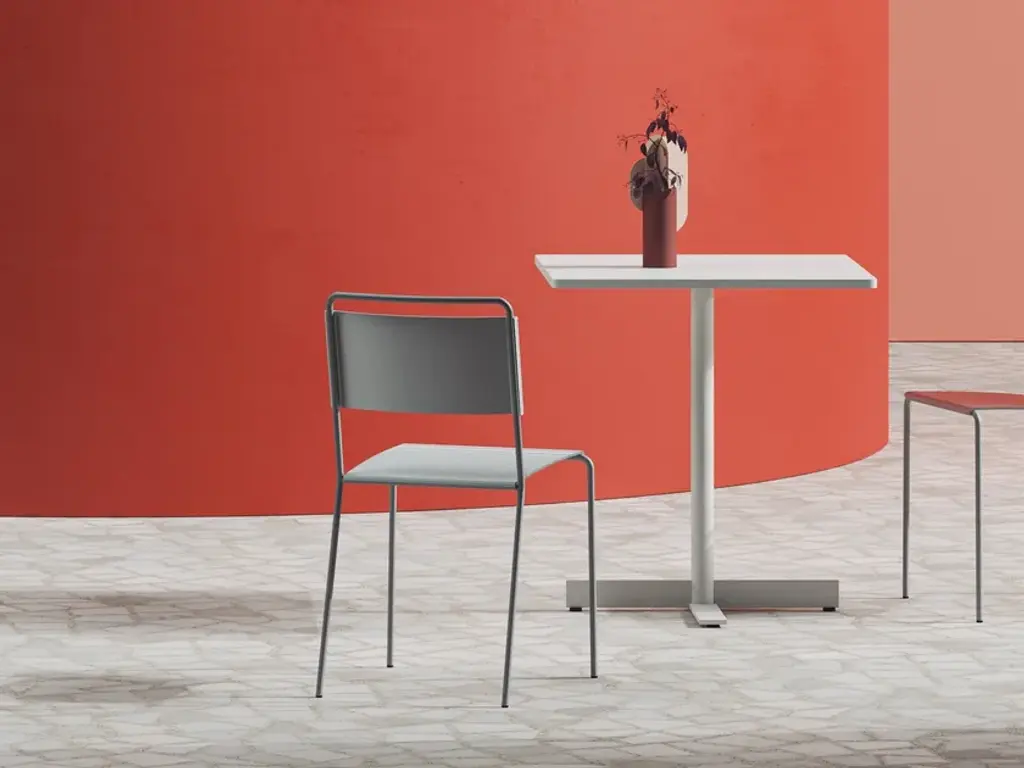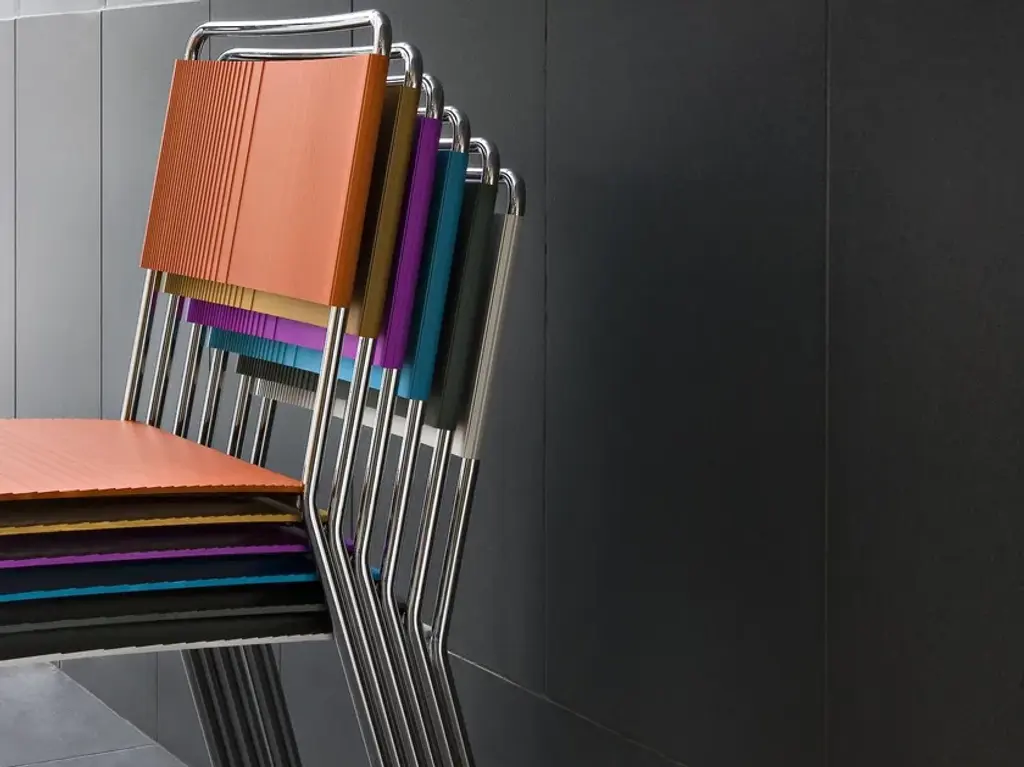Estrosa is a stackable chair for contract and residential spaces. Versions: 4 legs frame. Materials and colors: chrome plated steel, painted aluminium, black. Aluminium anodized black or gray, other colours available for projects.Multicolored and smart, the coldness and strictness of the metal become a warm piece of furniture. The particular aluminium profile makes that natural light is reflected in different ways at every shifting, in this way Estrosa earn a new identity in each place. Estrosa chair, stool and bench: thousands natures’ furniture complements, fit outdoor and indoor spaces of bars, restaurants, home, offices and waiting areas, thanks to the 8 colors that make her, at the same time, rigorous and informal.