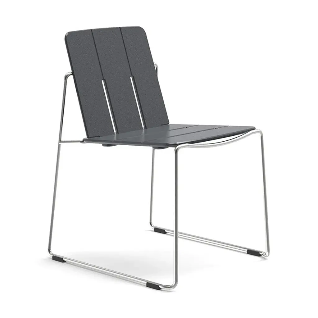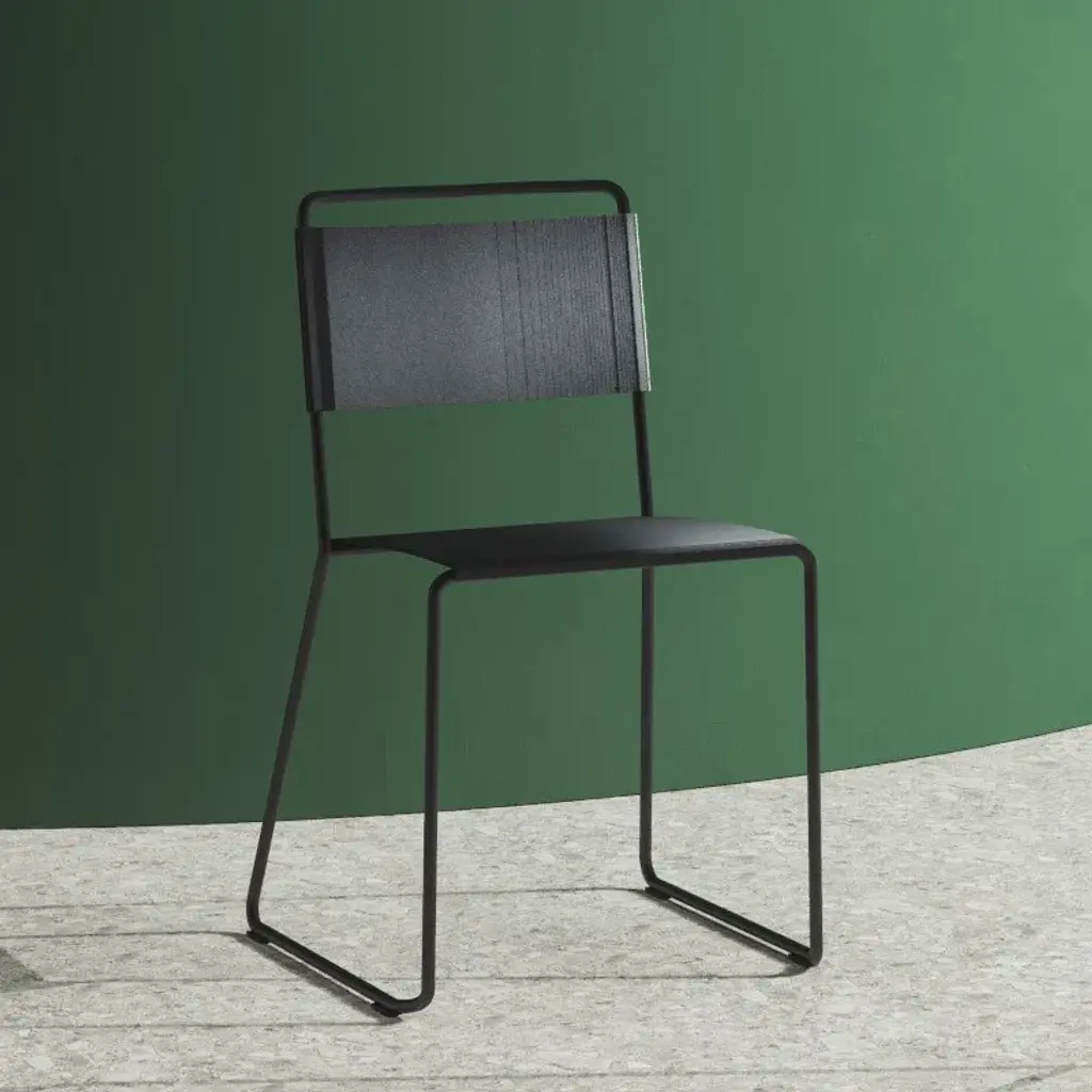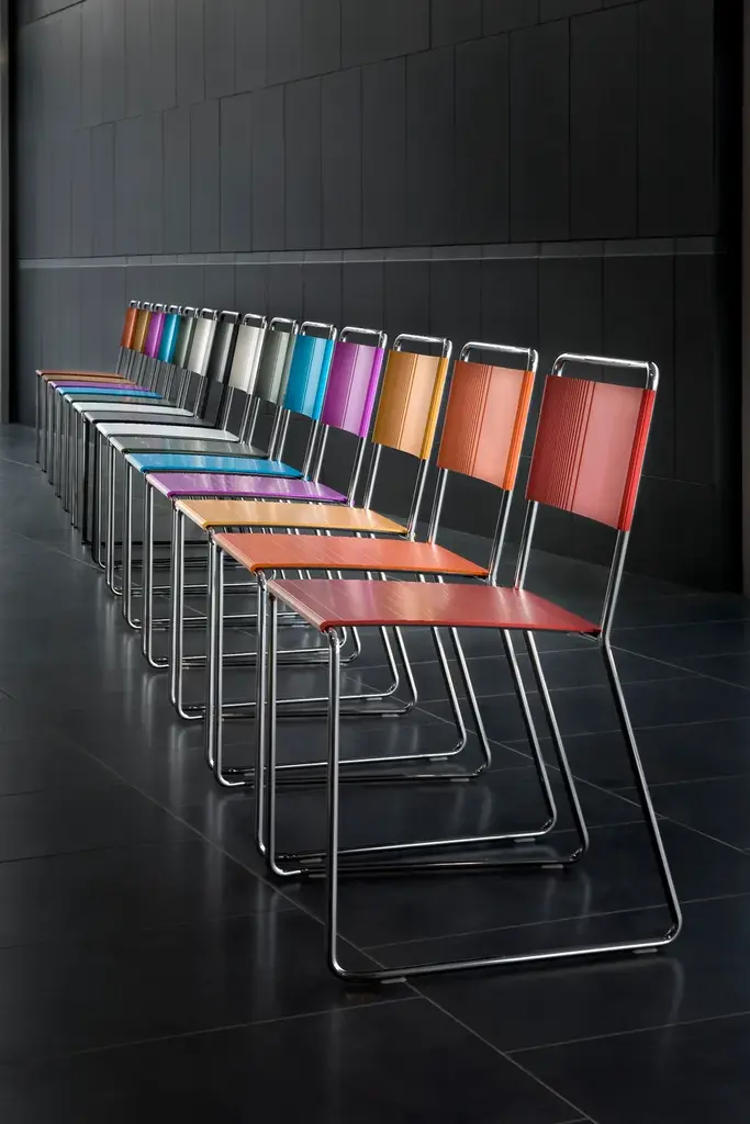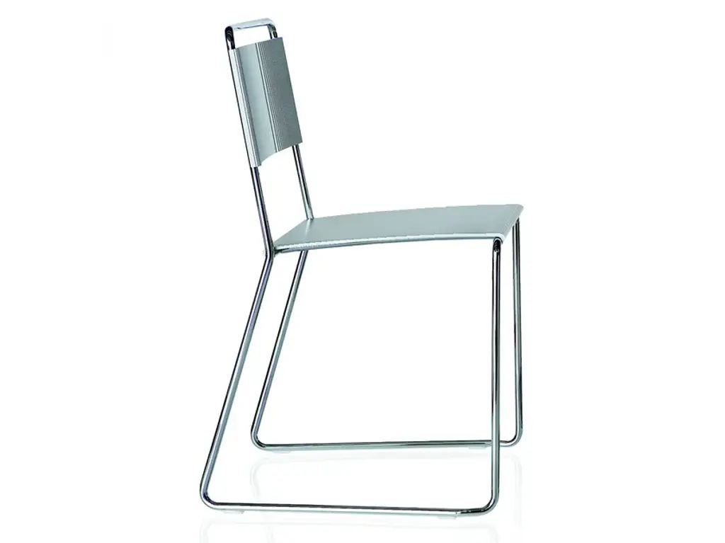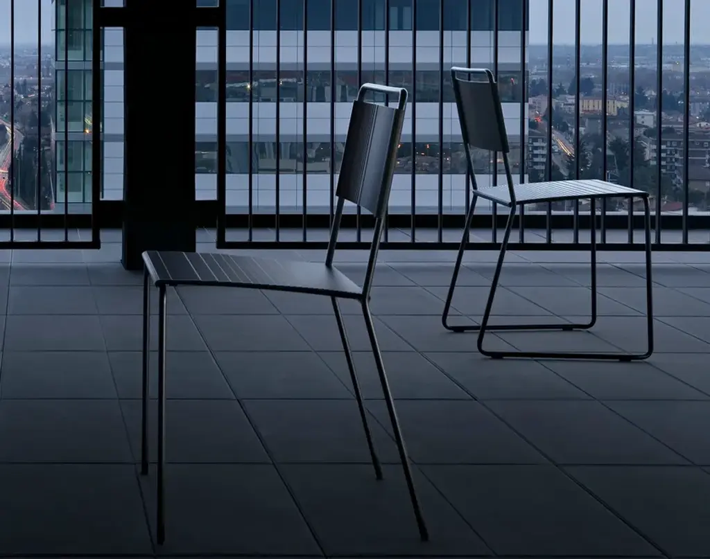 Estrosa is a stackable chair for contract and residential spaces. Versions: skid frame. Materials and colors: chrome plated steel, painted aluminium, black. Aluminium anodized black or gray, other colours available for projects.Multicolored and smart, the coldness and strictness of the metal become a warm piece of furniture. The particular aluminium profile makes that natural light is reflected in different ways at every shifting, in this way Estrosa earn a new identity in each place. Estrosa chair, stool and bench: thousands natures’ furniture complements, fit outdoor and indoor spaces of bars, restaurants, home, offices and waiting areas, thanks to the 8 colors that make her, at the same time, rigorous and informal.