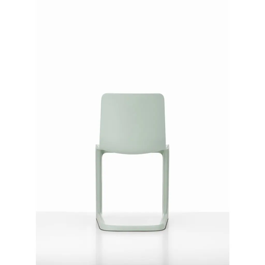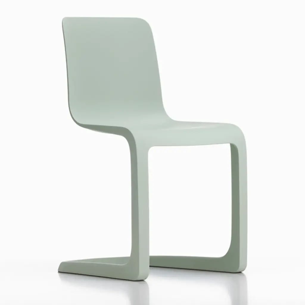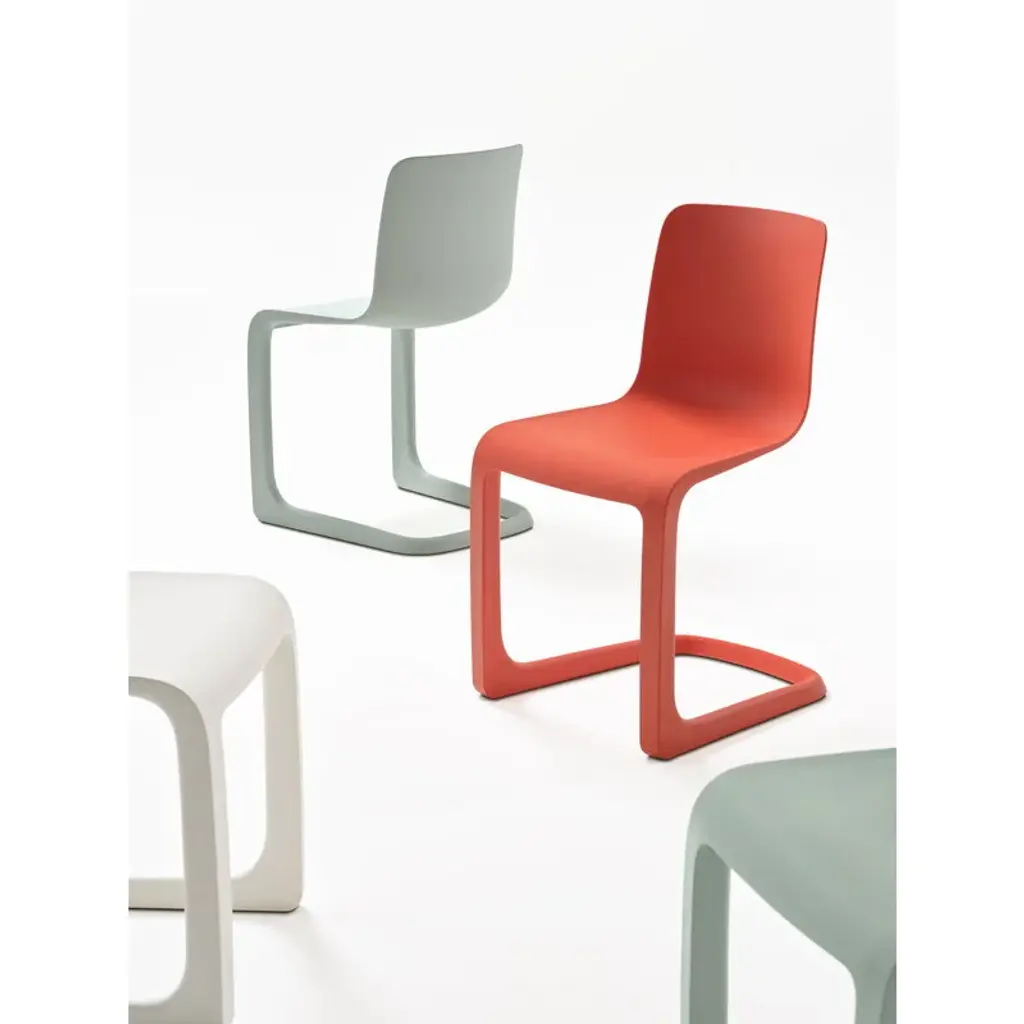 The Vitra EVO-C is a plastic chair designed by Jasper Morrison in 2020, whose sleek expression represents the supernormal design that is typical of Morrison, stripped of all unnecessary details. The chair is a fresh interpretation of the classic cantilever chair: it seamlessly combines the L-shaped leg structure familiar from metal-framed chairs with an ergonomic seat that flexes comfortably when sat on. EVO-C is made of only one material, polypropylene, and is therefore 100% recyclable.