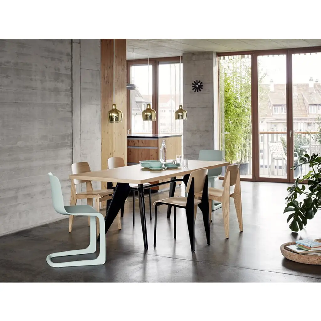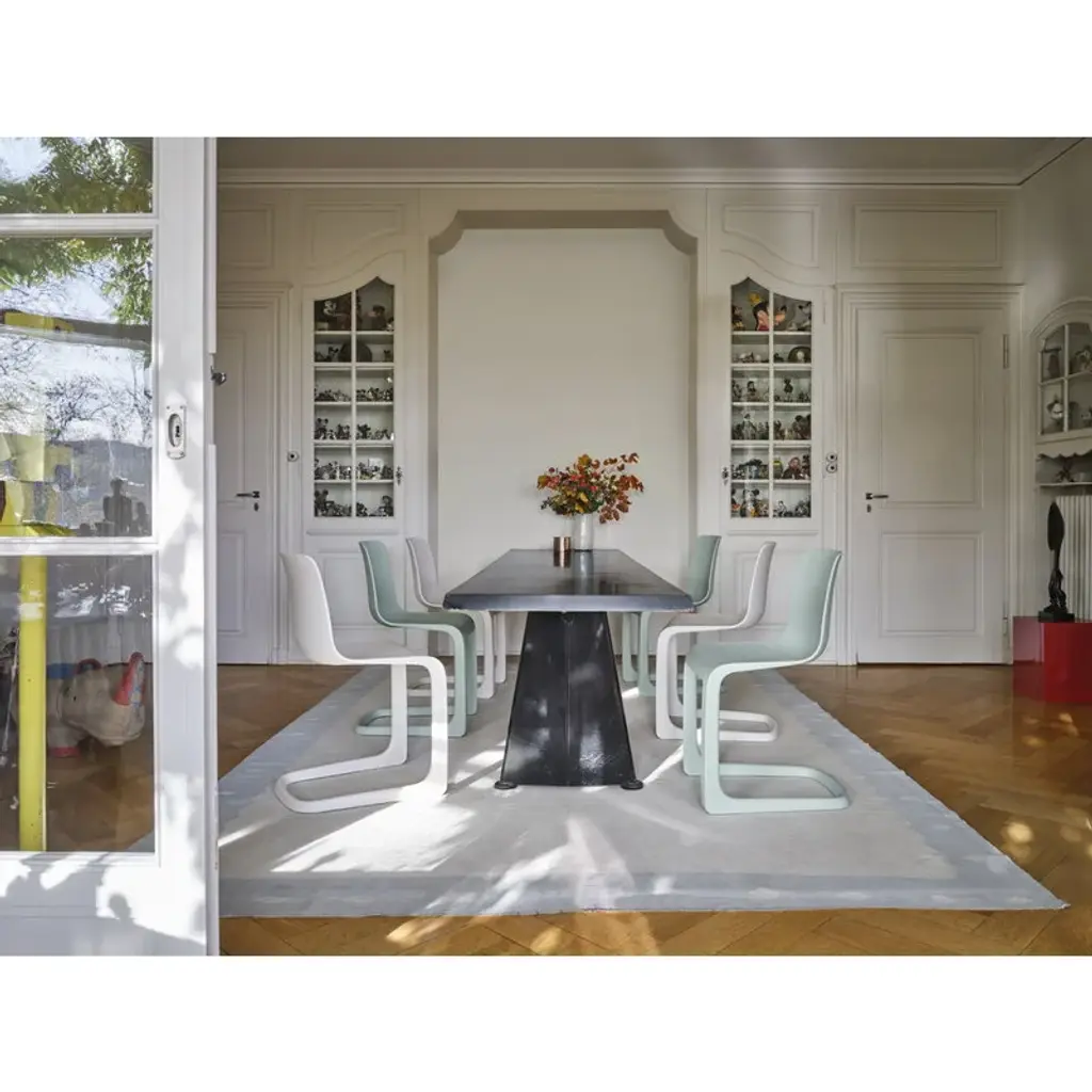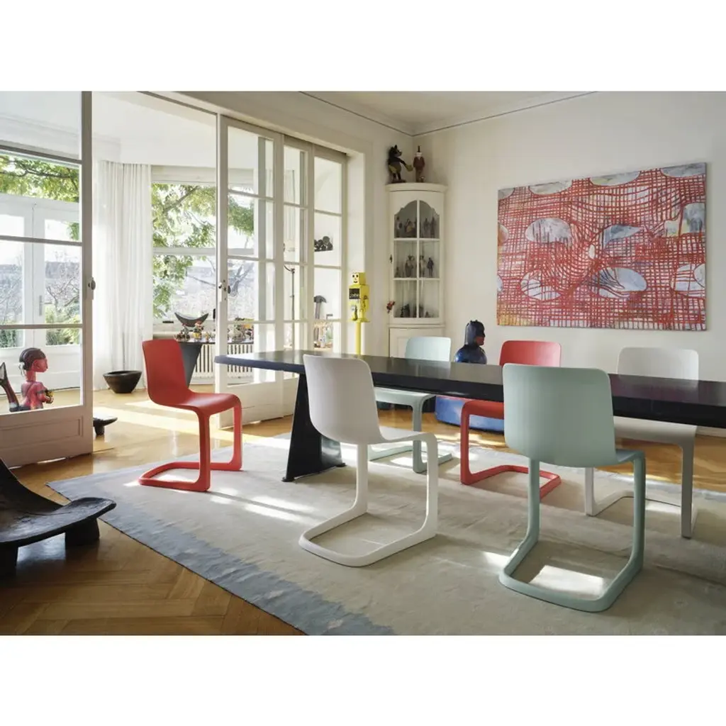 The Vitra EVO-C is a plastic chair designed by Jasper Morrison in 2020, whose sleek expression represents the supernormal design that is typical of Morrison, stripped of all unnecessary details. The chair is a fresh interpretation of the classic cantilever chair: it seamlessly combines the L-shaped leg structure familiar from metal-framed chairs with an ergonomic seat that flexes comfortably when sat on. EVO-C is made of only one material, polypropylene, and is therefore 100% recyclable.