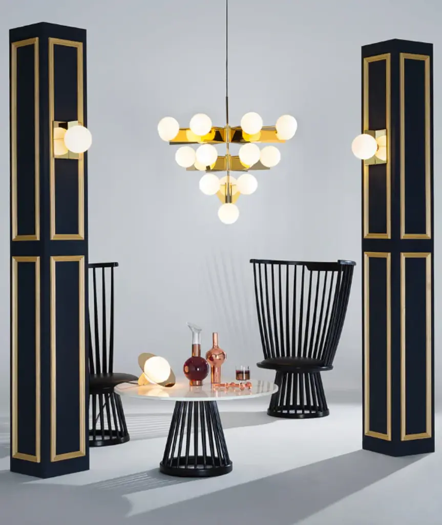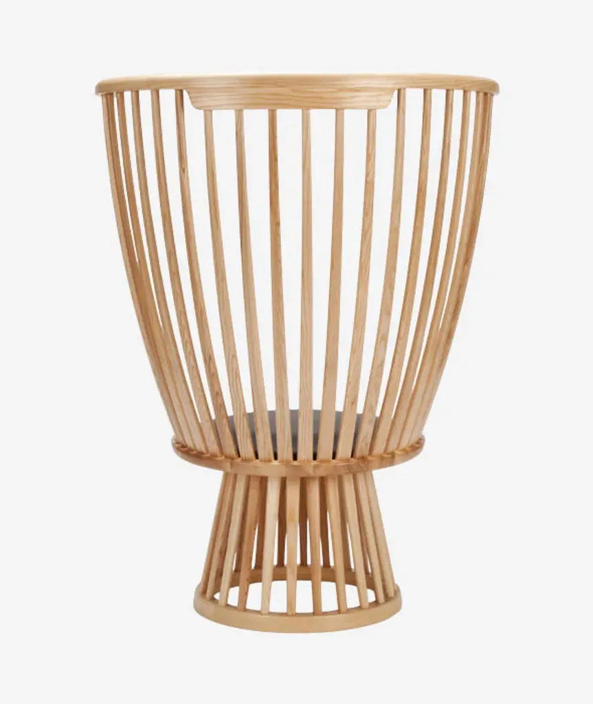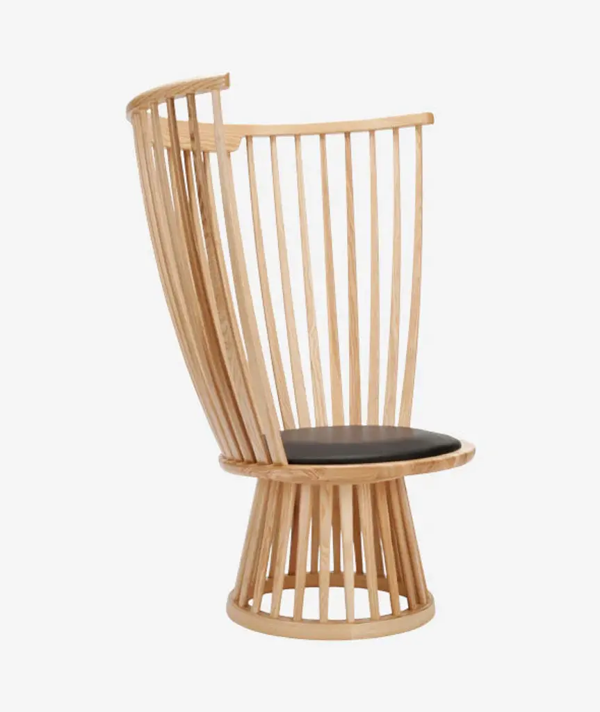Fan is a modern take on the classical Windsor chair. A British archetype converted to a contemporary silhouette, creating an exclamation mark in the home with a semi-transparent structure that takes up minimal visual mass for a large and imposing chair. Originally a dramatic and sculptural take on a British design classic, Fan is available as a high back chair, dining chair, stool and table. The stools and chairs have a black leather seat pad, while the chairs feature a curved back, offering support and comfort. The lounge chair is available in black or natural ash.l Oak.