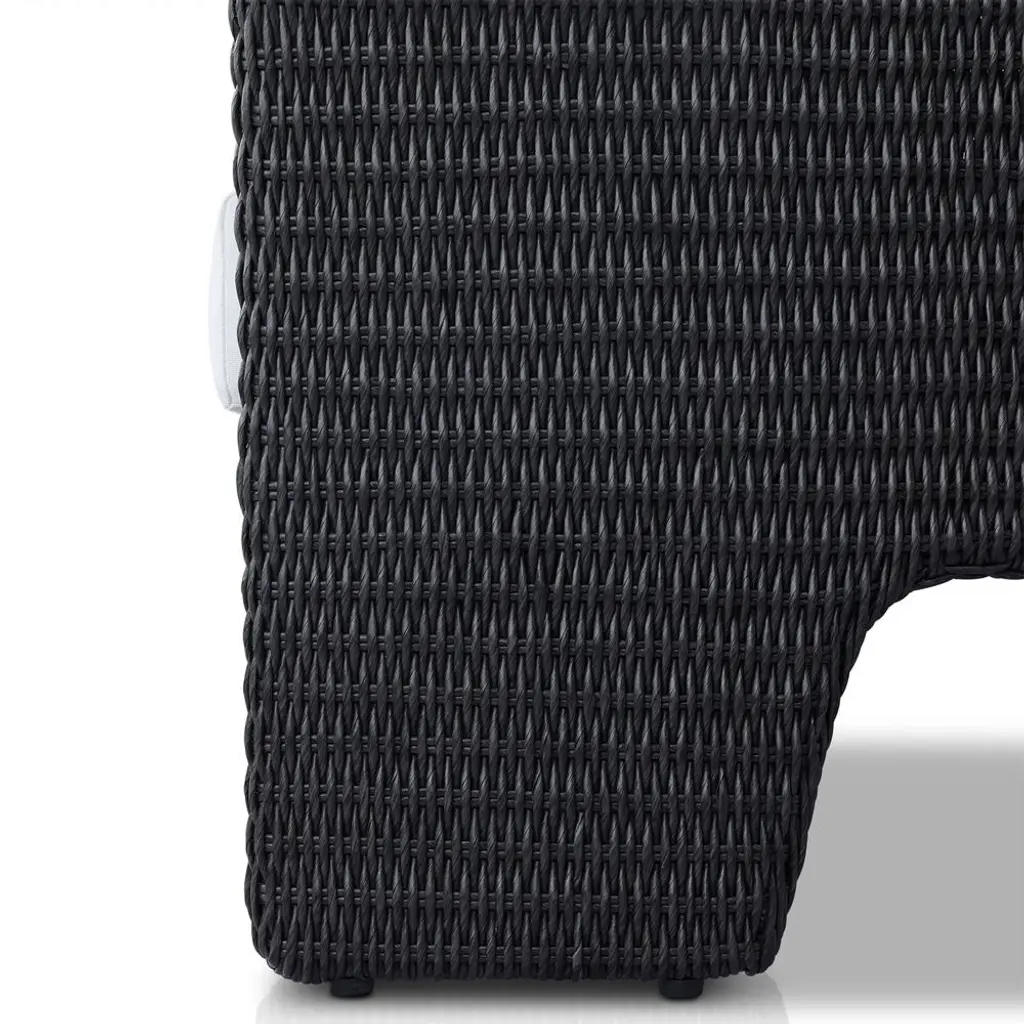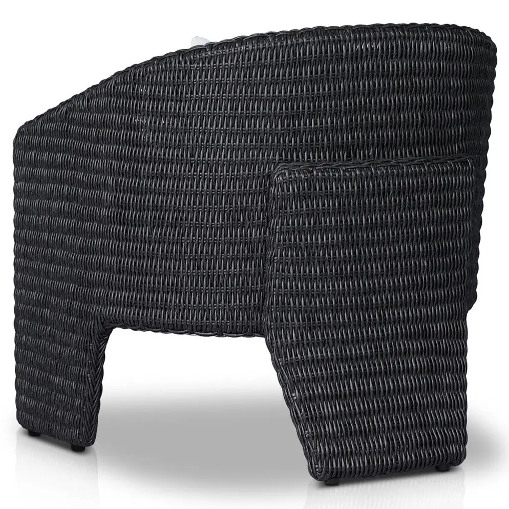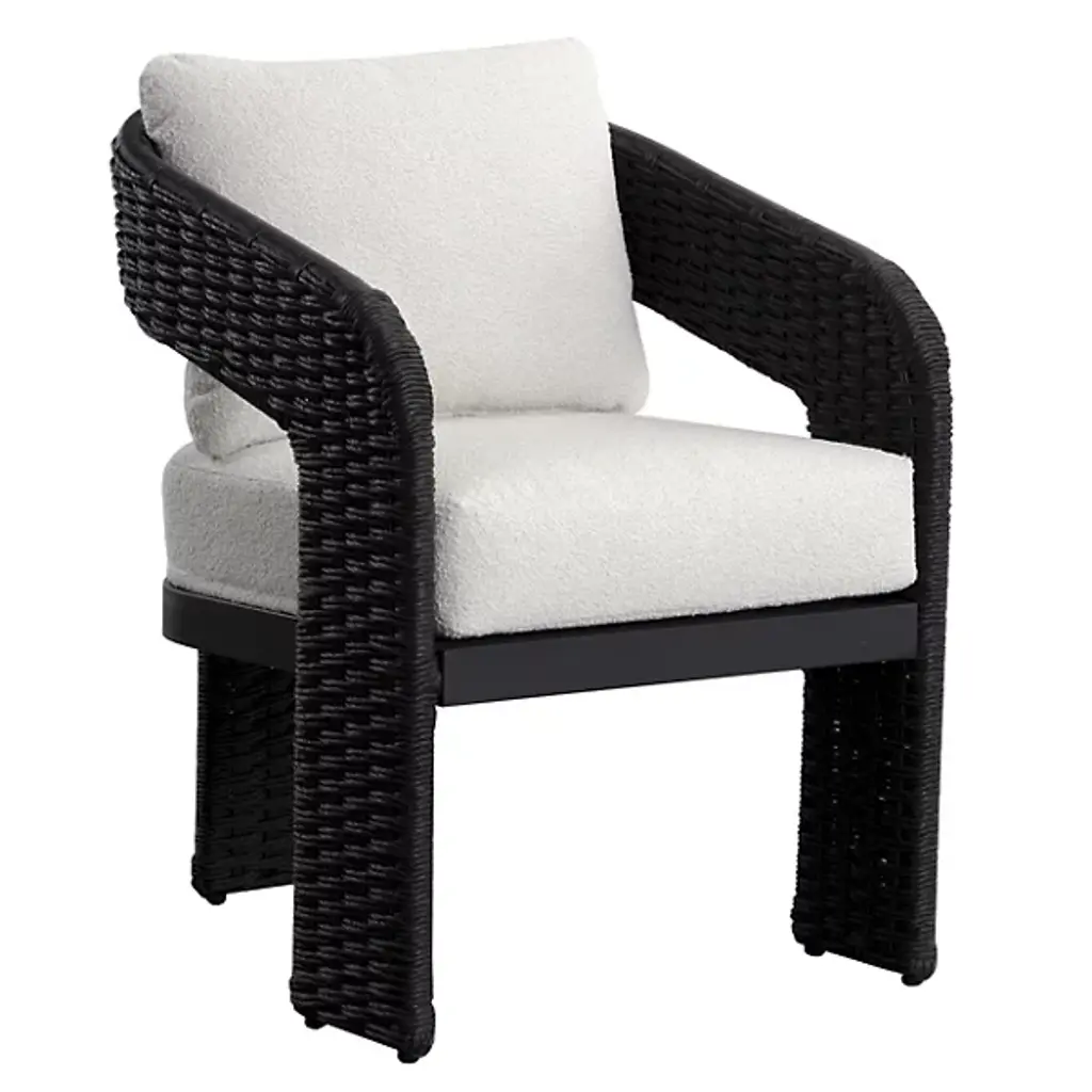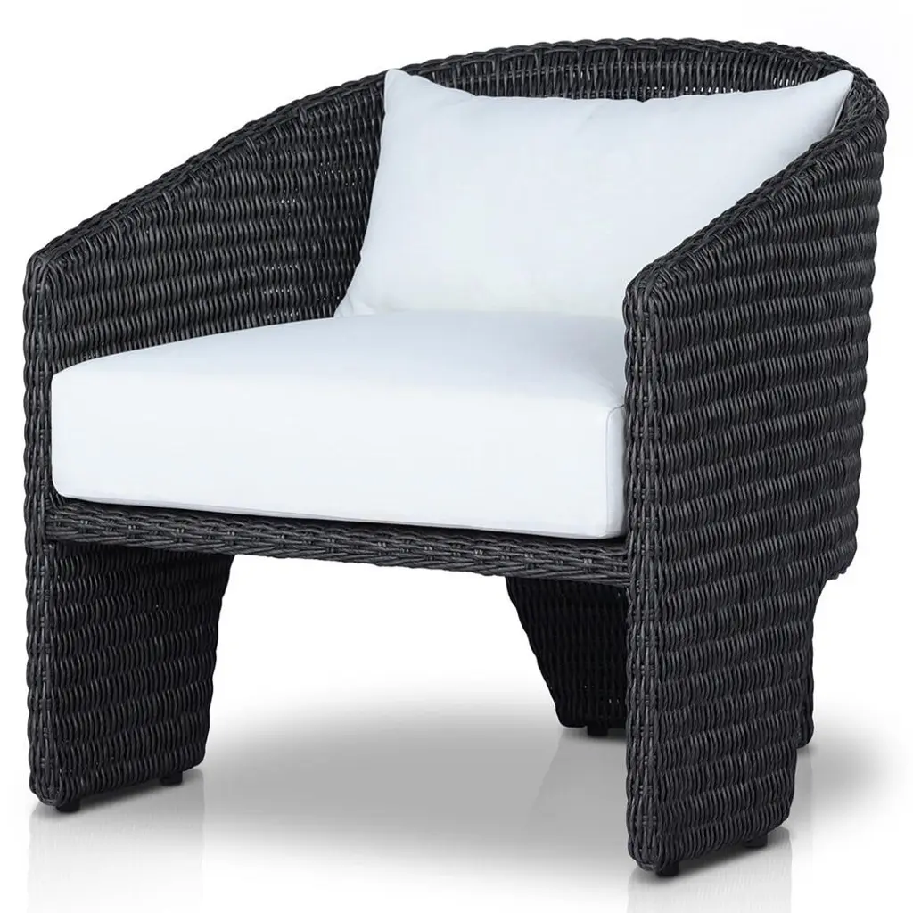 Fara Coastal Beach White Upholstered Black Woven Wicker Outdoor Lounge Arm Chair