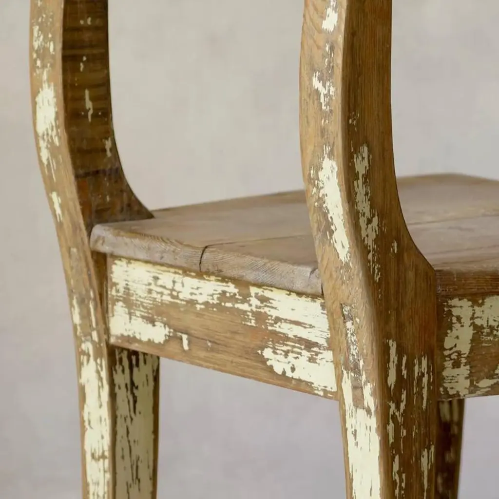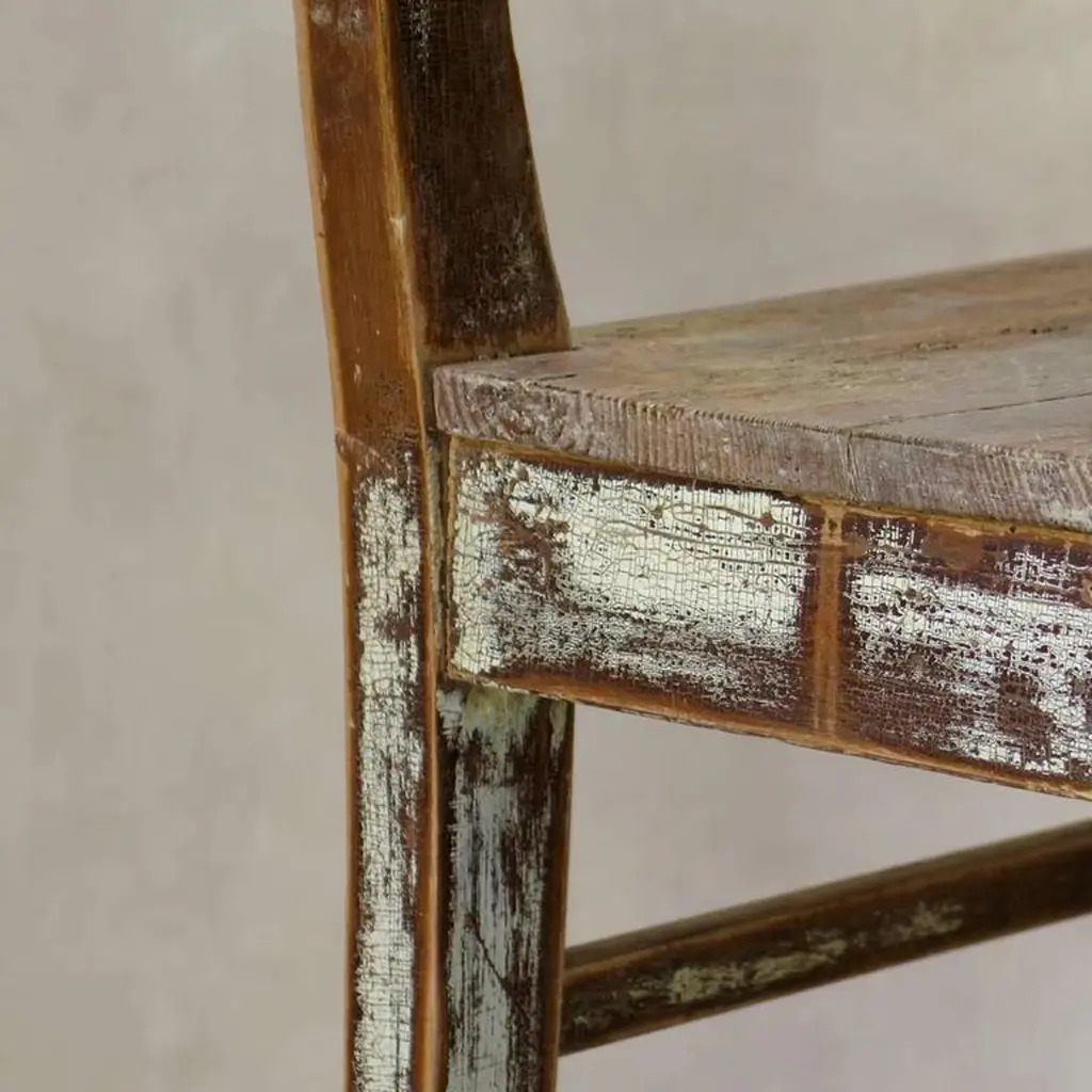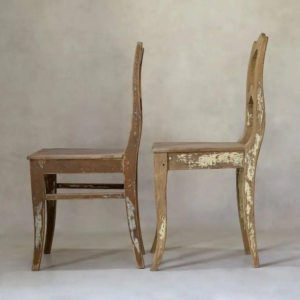 Charming near-pair of rustic pine chairs, retaining traces of paint here and there. Large trapezoidal seats. Raised on sabre legs.Priced individually.