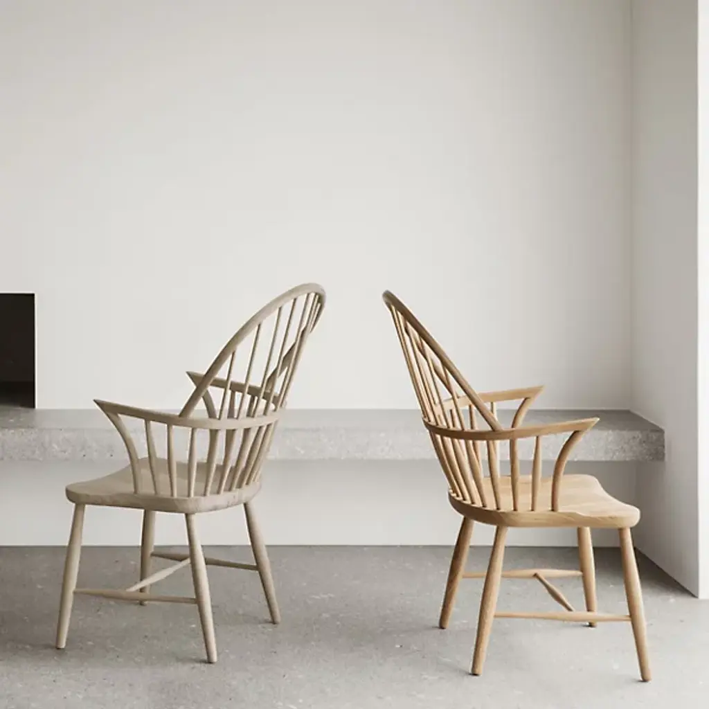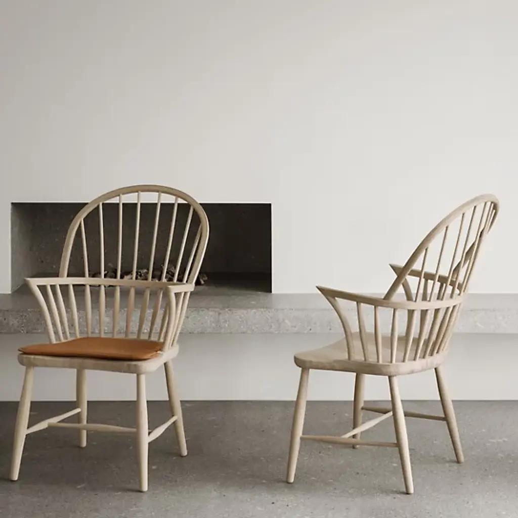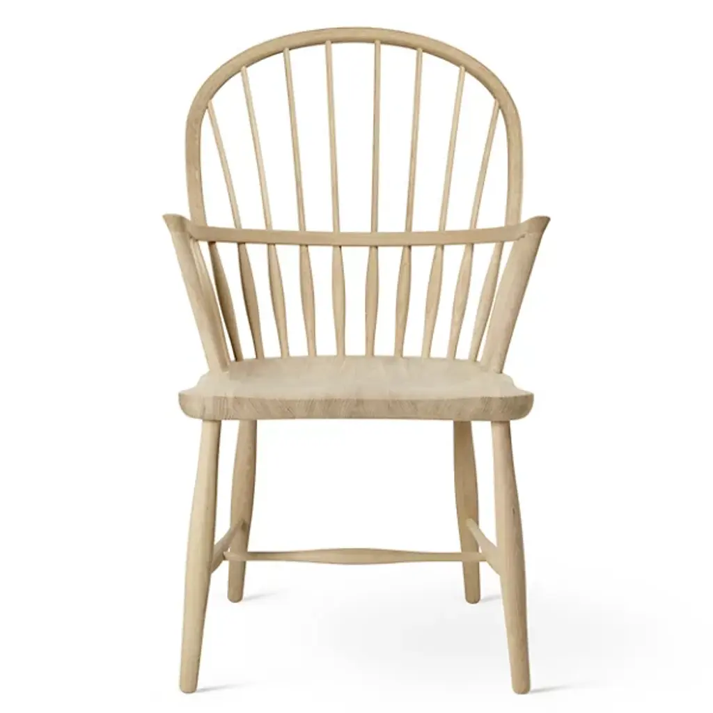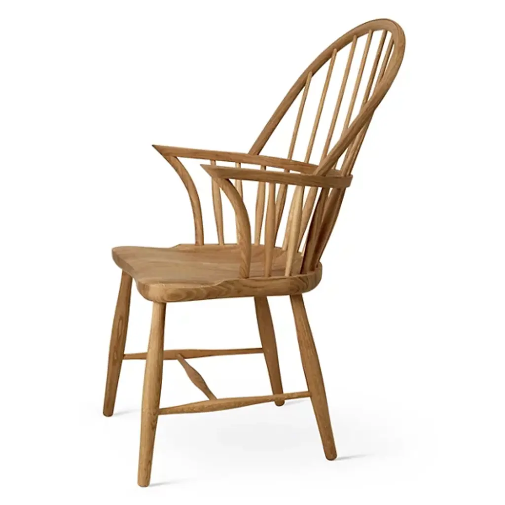 The FH38 Windsor Chair from Carl Hansen is an enveloping seating companion crafted in 1938 by Danish icon Frits Henningsen with the idea that craftsmanship is essential. Architect and cabinetmaker Frits Henningsen was renowned for his perfectionist style, one that presented the traditional design with an expressive quality. Here, Henningsen presents a unified wood structure comprised of intricately arranged and sanded segments. The eyes instantly lock onto the dynamic curves of the shell-like arm and backrest, elements that hug while letting air pass through. The seat rest features intricate contours that showcase the beauty of the wood and mirror the features of the lower body for comfort.