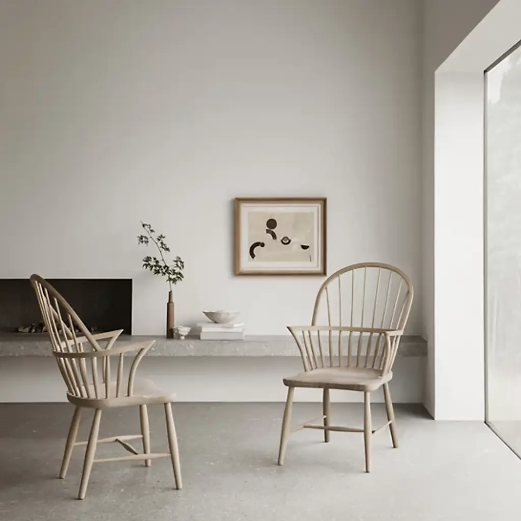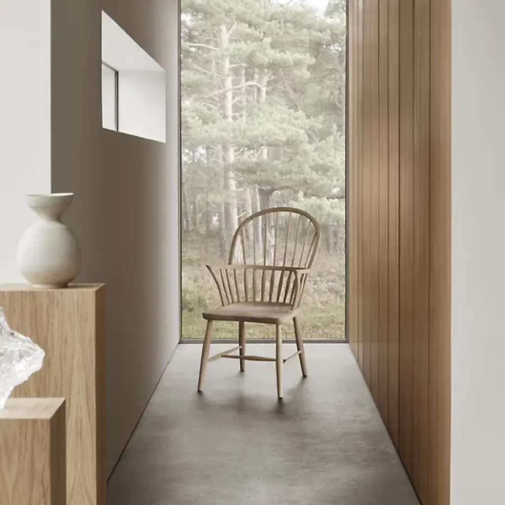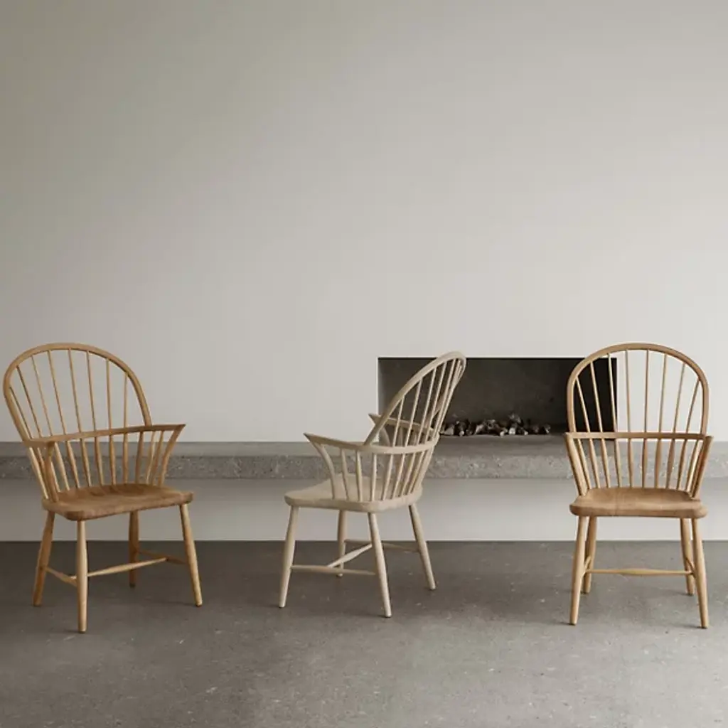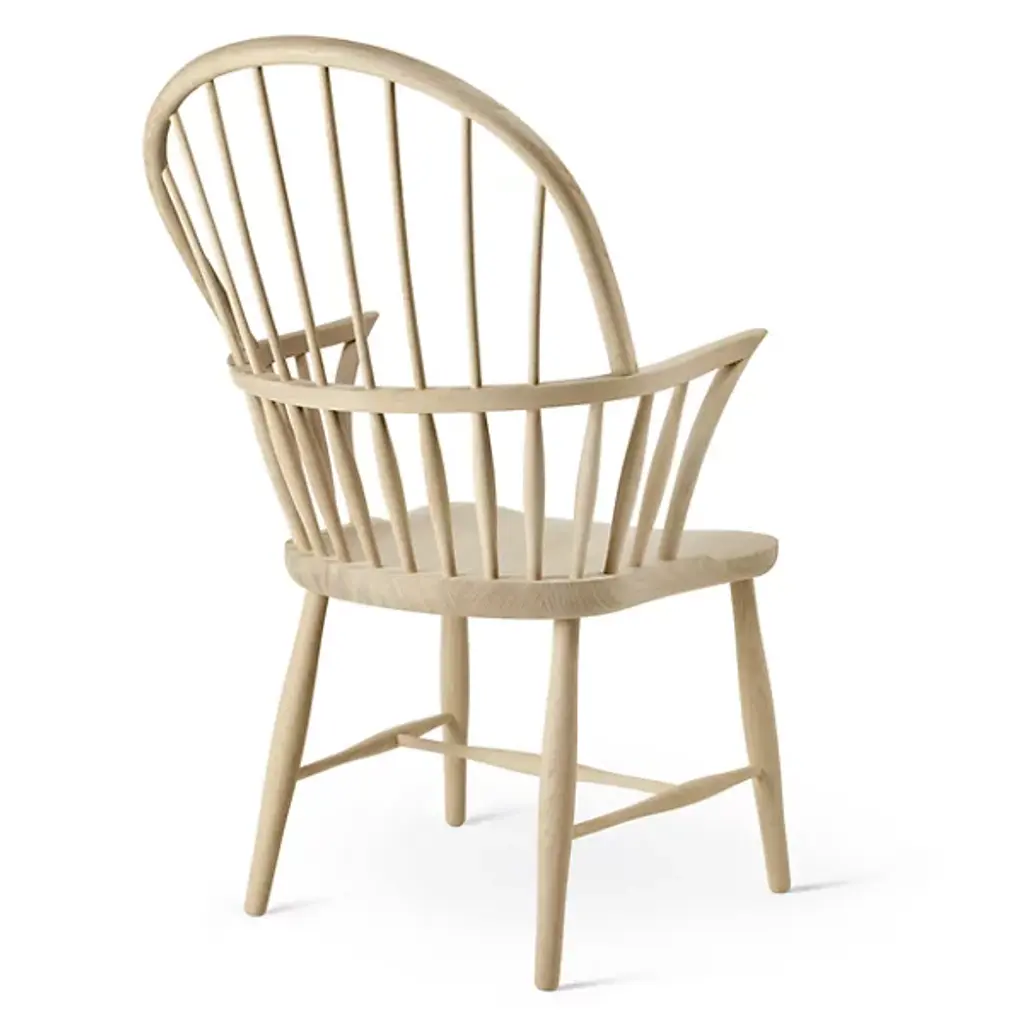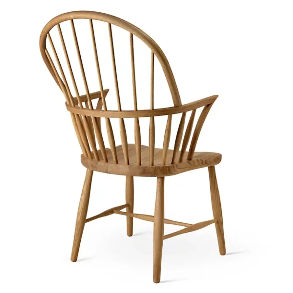 The FH38 Windsor Chair from Carl Hansen is an enveloping seating companion crafted in 1938 by Danish icon Frits Henningsen with the idea that craftsmanship is essential. Architect and cabinetmaker Frits Henningsen was renowned for his perfectionist style, one that presented the traditional design with an expressive quality. Here, Henningsen presents a unified wood structure comprised of intricately arranged and sanded segments. The eyes instantly lock onto the dynamic curves of the shell-like arm and backrest, elements that hug while letting air pass through. The seat rest features intricate contours that showcase the beauty of the wood and mirror the features of the lower body for comfort.