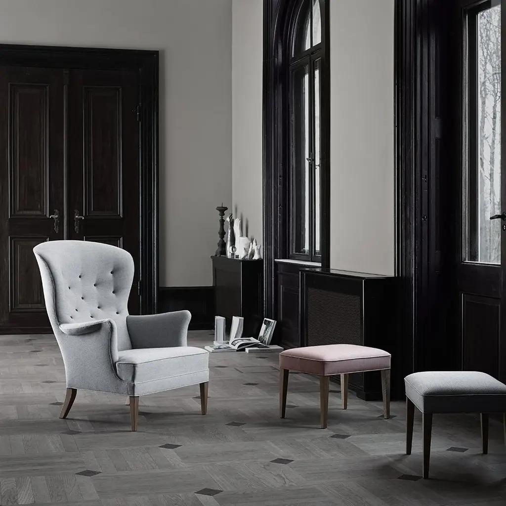 Designed by Frits Henningsen, the Heritage Chair from 1930 is a modern masterpiece. With clear inspiration from earlier style epochs such as French imperial style and 17th-century British furniture, Frits Henningsen created a timeless classic so inviting that it easily becomes the favorite chair in any home. The Heritage Chair´s warm and elegant lines are testimony to Frits Henningsen´s constant pursuit of perfection. With a love for natural materials, he created a chair that is inviting and evokes tranquility, fulfilling the eternal human quest for breathing space in a hectic daily life. The Heritage chair is available in fabric or leather with legs in oak or walnut. A matching footrest, FH420, is available for extra comfort. All fabrics and leathers available upon request.Consult the Carl Hansen Wood & Fabric Guide for more info on materials (PDF). Call us for more information or to order by phone: 800.688.0974.
