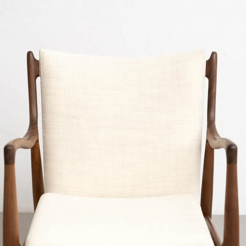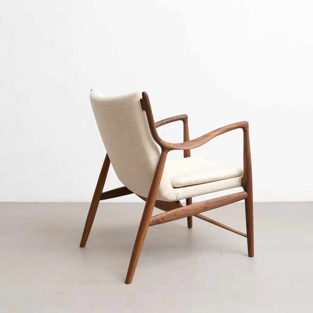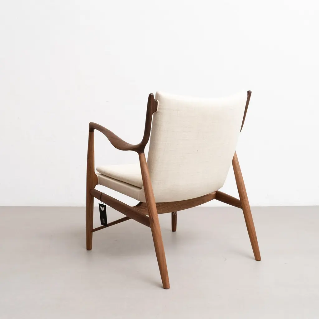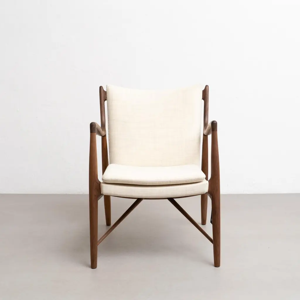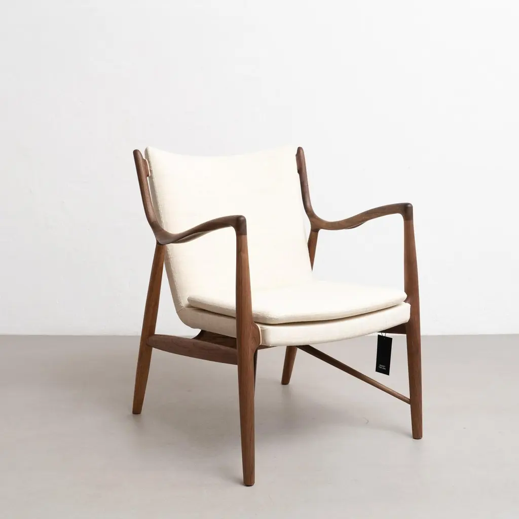 Chair designed by Finn Juhl in 1945, relaunched in 2003.Manufactured by House of Finn Juhl in Denmark.In the Autumn of 1945, Finn Juhl presented the 45 Chair at the annual Cabinetmakers’ Guild Exhibition. Today, the chair is widely regarded as one of the most revolutionizing and iconic pieces within Danish furniture design. Finn Juhl dreamt of studying art history and his deep understanding of international contemporary art is abundantly clear in the bold 45 Chair. With its curved backrest and organic shape this chair cemented Finn Juhl as one of the leading designers of the 20th century. In a review on Finn Juhl's stand at the exhibition in 1945, the architect Erik Herløw wrote; “Most interesting about the exhibition is probably Finn Juhl's work. After many years of experiments, we now see a clarified result. Finn Juhl does not design on a refinement of traditions but has instead logically solved functions and therefrom shaped furniture on his terms. In the early years, Finn Juhl’s attempts seemed exaggerated, but now it is so much more interesting to observe the result he has achieved by going his own ways. Most beautiful is an armchair, where the frame is organically shaped as a bone, able to support the muscles of an arm and the weight of a body. The expression of the chair is reminiscent of a weapon, sharpened by human hands.”The 45 Chair is a true masterpiece and has become an icon of Finn Juhl’s universe of furniture. With this chair, Finn Juhl managed to create an, at the time, unseen design by separating the carried and the carrying elements. In reality, Finn Juhl had previously experimented with separating the upholstered parts from the wooden parts within his furniture, but with the sleek, strong and elegant 45 Chair this unique design characteristic manifested. On the 45 Chair the space between the frame and the seat creates a lightness, which combined with its organic shape and sublime detailing, ensures unique beauty and floating elegance. The chair appeals to all senses and pleases the eye and body alike. Furthermore, the 45 Chair has been called “the mother of all modern chairs” by the Japanese professor and design collector Mr. Noritsugu Oda. The groundbreaking 45 Chair became the prelude to the unfolding of Finn Juhl’s characteristic style of design that we know from the latter part of the 1940s. During this period, his designs are characterized exactly by liberating the seat and backrest as a single unit carried by the frame. This approach became a defining moment in establishing Finn Juhl’s status as a pioneer within furniture design.Dimensions:W: 66.5 cmD: 73 cmH: 88 cmSeat height: 42 cmImportant information regarding images of products:Please note that some of the images show other colors and variations of the model, these images are only to present interior design proposals. The item that is selling is on the first image. Important information regarding color(s) of products:Actual colors may vary. This is due to the fact that every computer monitor, laptop, tablet and phone screen has a different capability to display colors and that everyone sees these colors differently. We try to edit our photos to show all of our products as life-like as possible, but please understand the actual color may vary slightly from your monitorAbout the designer:Finn Juhl was born on January 30, 1912 in Copenhagen. He wished to study art history, however, his father would not allow it. Instead, Finn Juhl began studying architecture at the Royal Academy of Arts in Copenhagen. Here, he studied under some of the most influential functionalists of his time. Among these was the great architect Vilhelm Lauritzen who hired Finn Juhl at his own studio in 1934 before Finn Juhl had even graduated. Eventually, the work took up all of his time and Finn Juhl never finished his studies. Later in life he always described himself as a self-taught furniture designer. One of the international highlights of Finn Juhl’s career was designing the complete interior of the Trusteeship Council Chamber at the UN headquarters in New York between 1951 and 1952. His sculptural furniture is widely appreciated all-over the world. Today, Finn Juhl is still considered the father of Danish Modern, the design movement from Denmark, that arose during the 1950s in the United States. At the time of his death in 1989, Finn Juhl had become an award-winning and highly respected international furniture artist. Finn Juhl was greatly inspired by both modernism in art and functionalism in architecture. His genius was cross-pollinating these two fields, thus creating a completely new artistic idiom. Like sculptures, Finn Juhl’s designs are created to stand freely in a room. At the same time, they are developed with a playful insight into the practical function of every detail. About the manufacturer:In 2001 House of Finn Juhl trusted with the exclusive rights to manufacture and relaunch Finn Juhl’s sculptural and iconic furniture by Finn Juhl’s widow Hanne Wilhelm Hansen. Today the unique Finn Juhl collection consists of more than 40 Classic masterpieces, all of which they manufacture with the utmost respect for the original heritage and strict demands for quality.